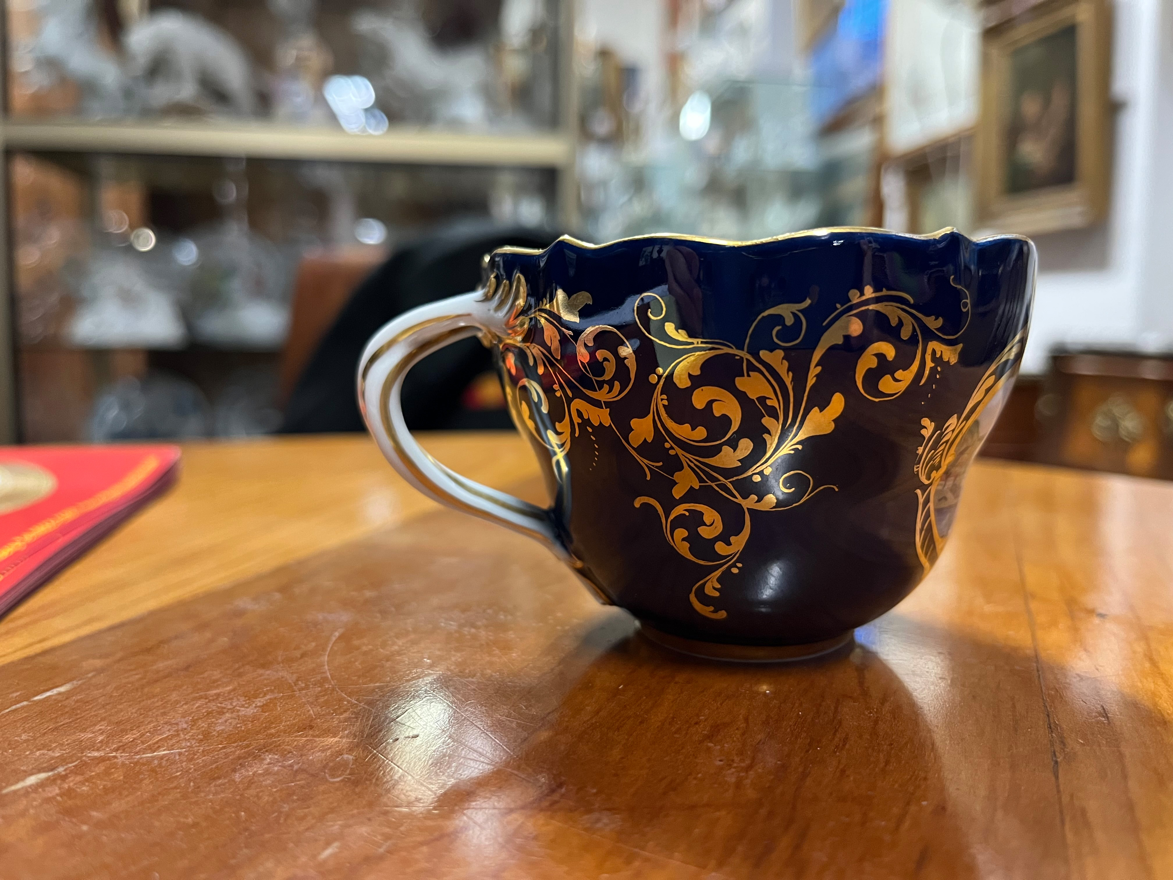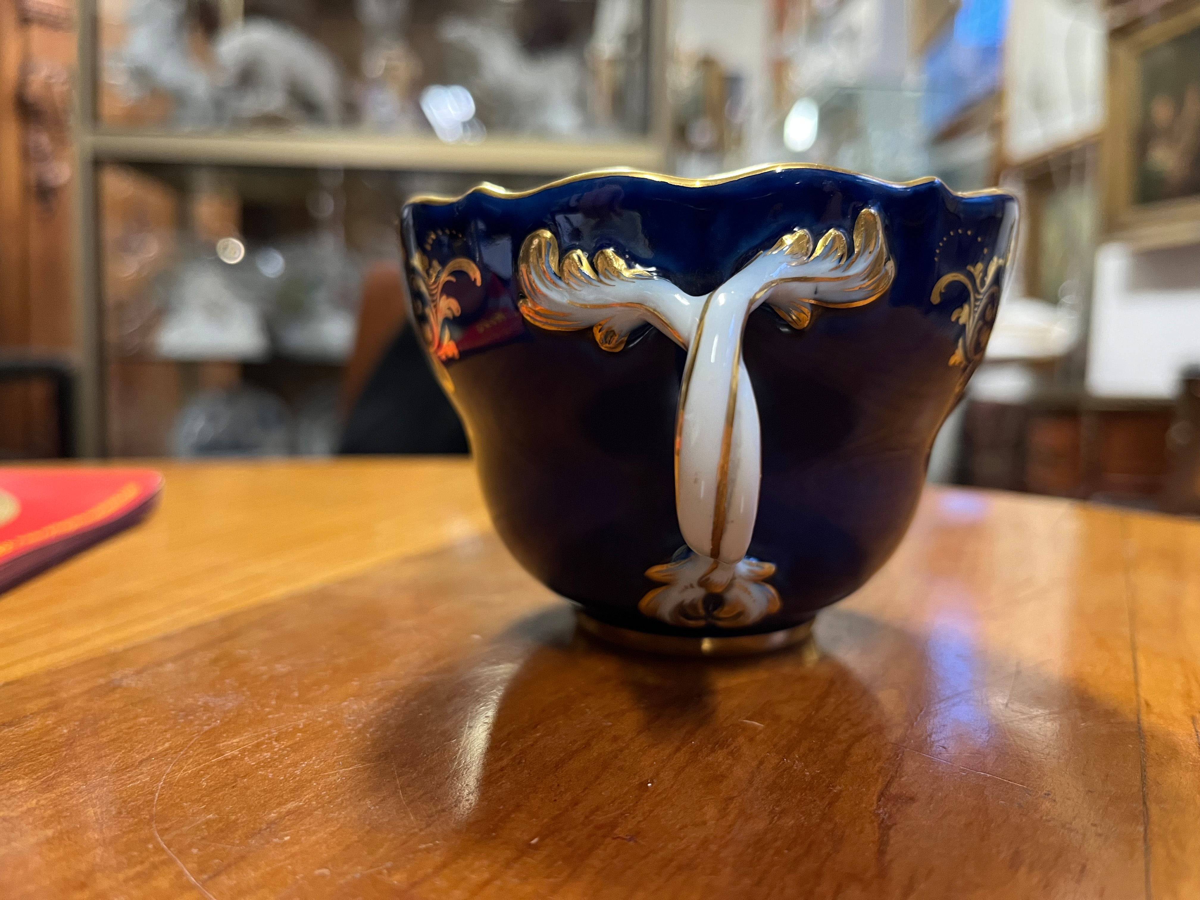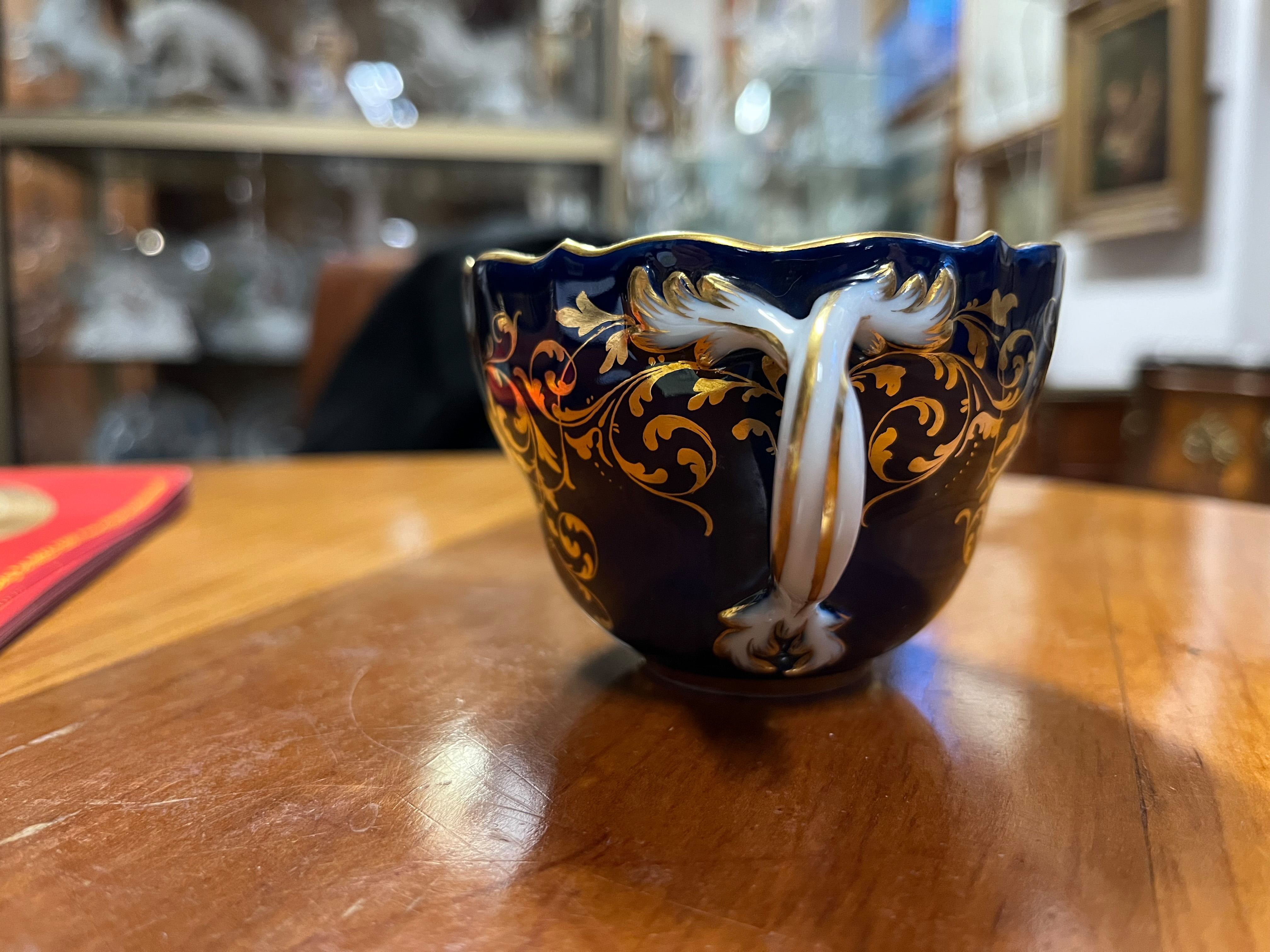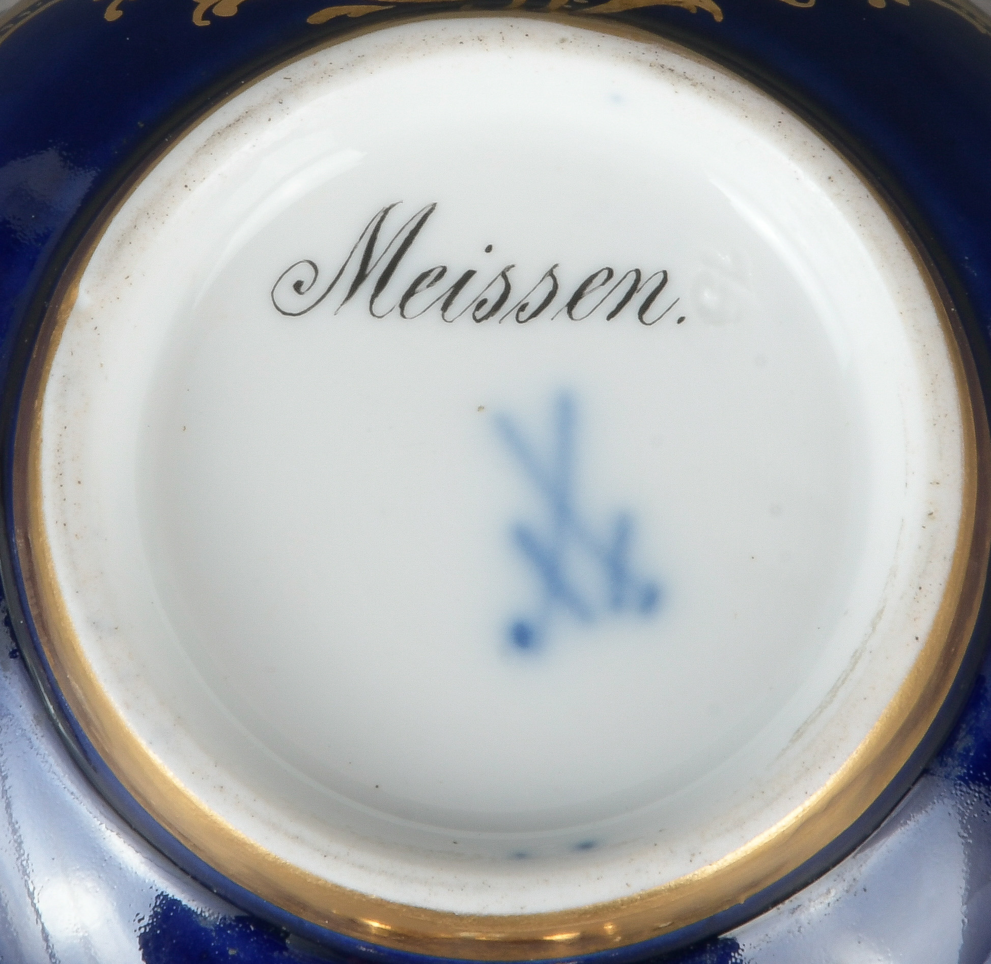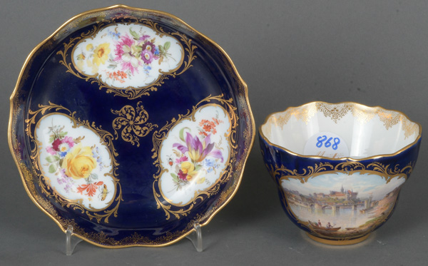 - Katalog-Nr: 868Schokoladentasse mit Unterschale. Meissen 19. Jh. Porzellan, mit kobaltblauem Fond, Goldspitzenbordüre und -kartusche, bunt bemalt mit Blumenbouquet bzw. der Ansicht von „Dresden"; am Boden unterglasurblaue Schwertermarke und betitelt.o.L.