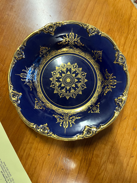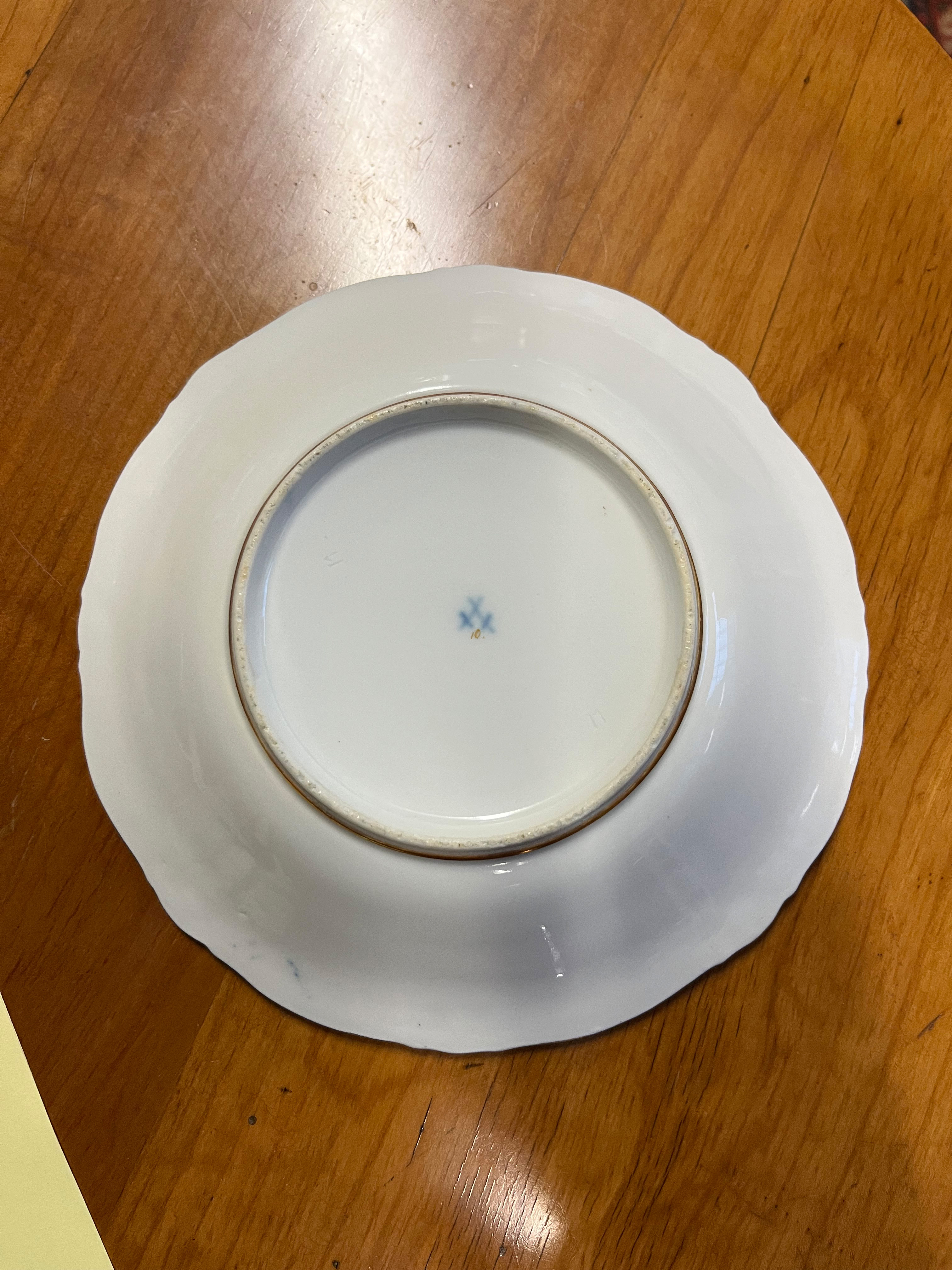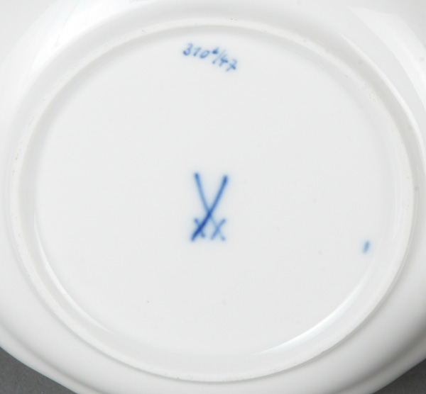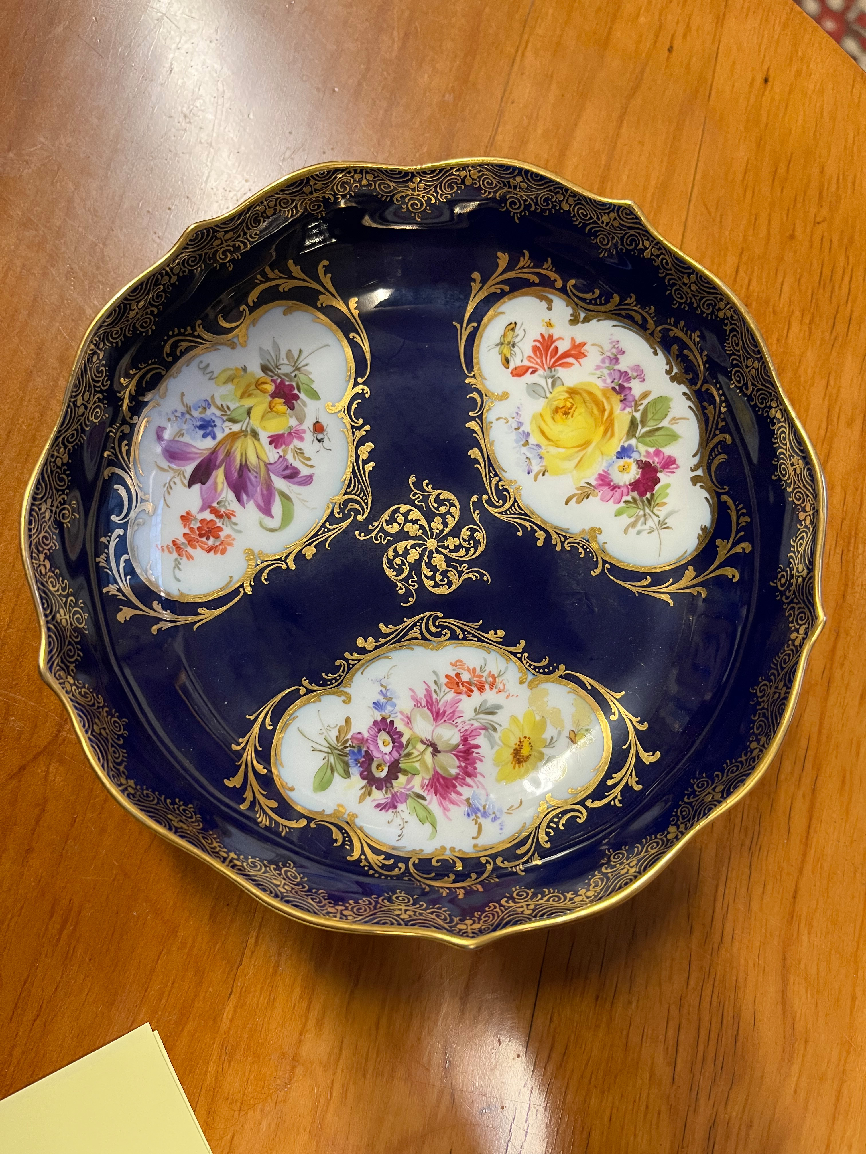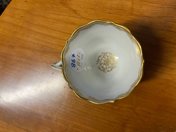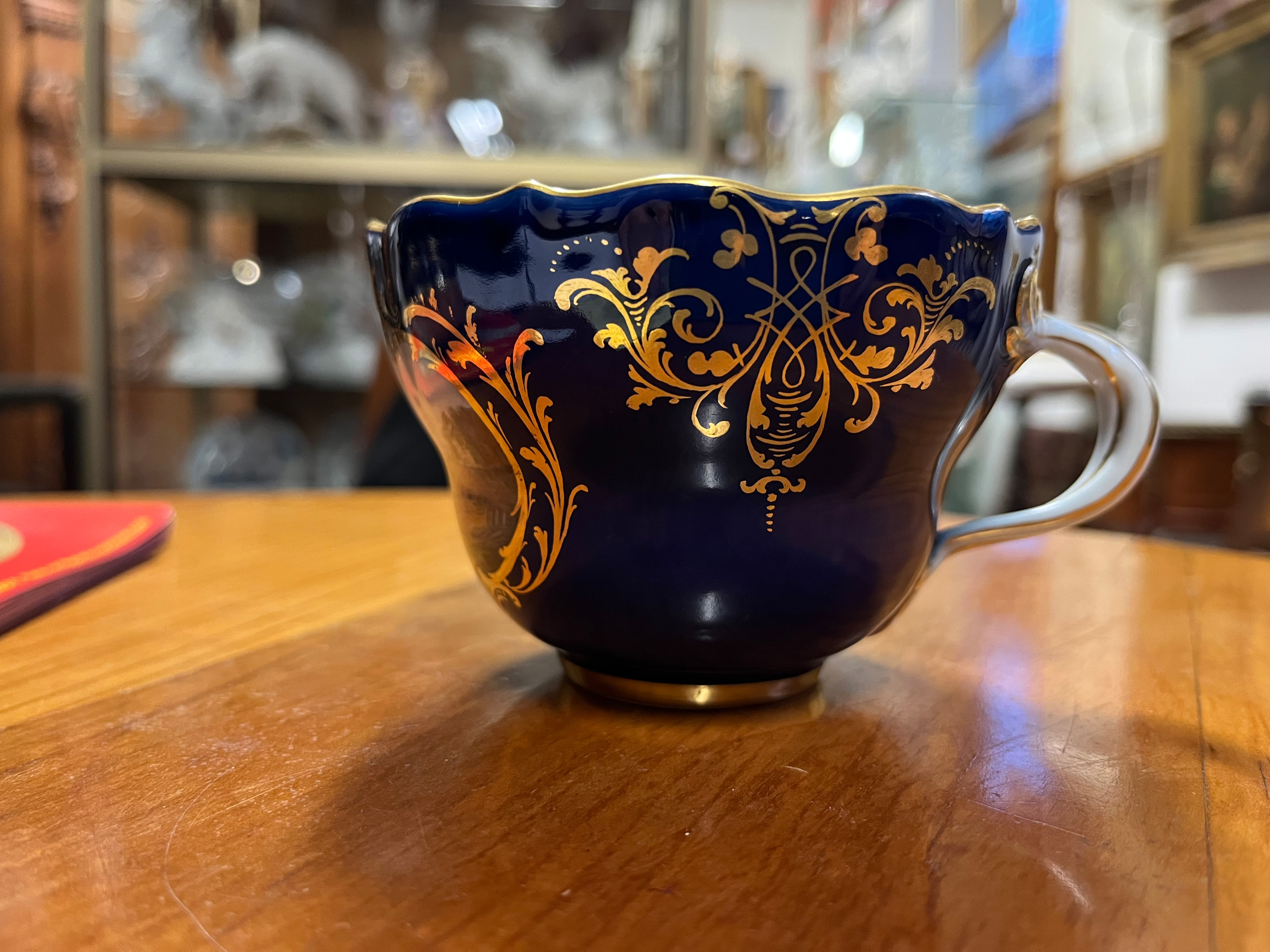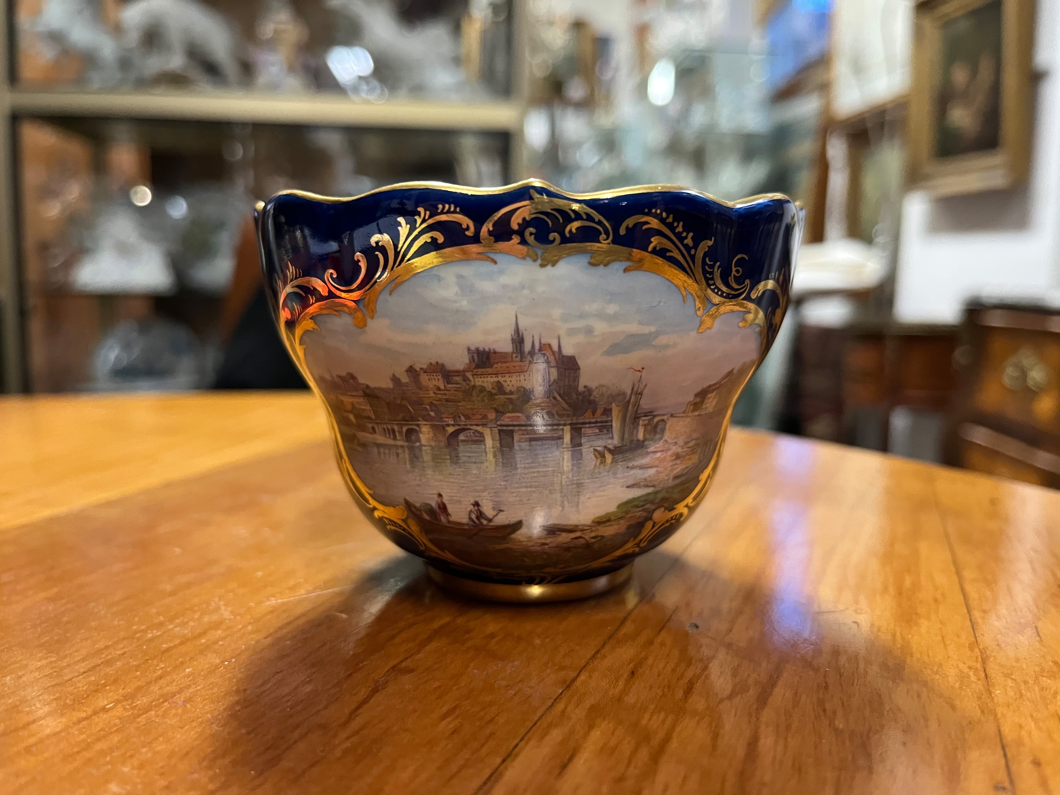 - Katalog-Nr: 868Schokoladentasse mit Unterschale. Meissen 19. Jh. Porzellan, mit kobaltblauem Fond, Goldspitzenbordüre und -kartusche, bunt bemalt mit Blumenbouquet bzw. der Ansicht von „Dresden"; am Boden unterglasurblaue Schwertermarke und betitelt.o.L.