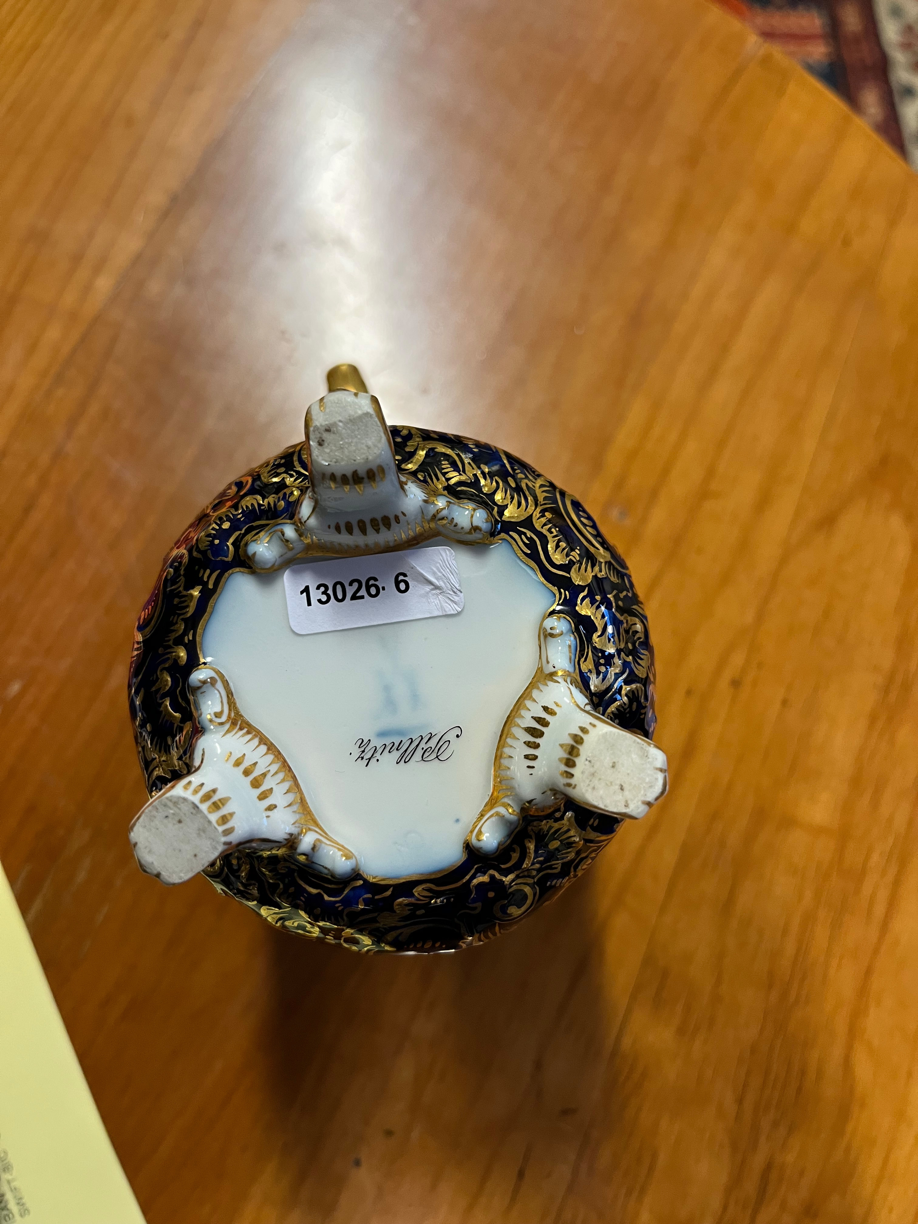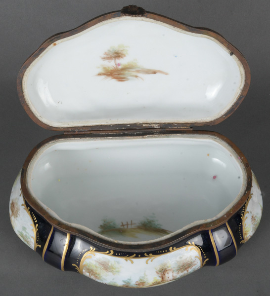 - Katalog-Nr: 869Große, ovale Deckeldose. Frankreich 19. Jh. Porzellan, mit kobaltblauem Fond, gold gesäumt, und bunt bemalt mit Landschaft, H=8 cm, B=21 cm, T=13,5 cmo.L.