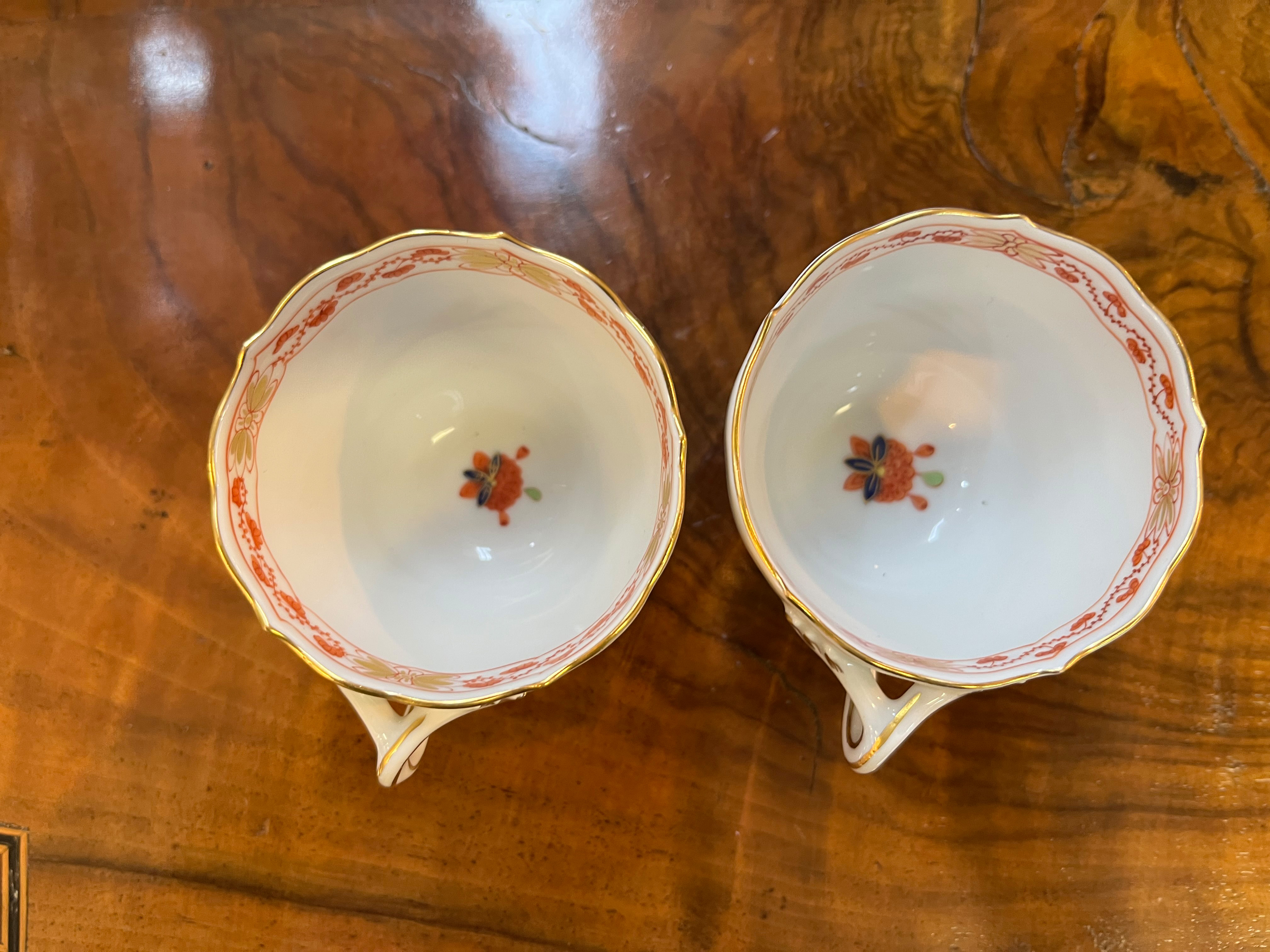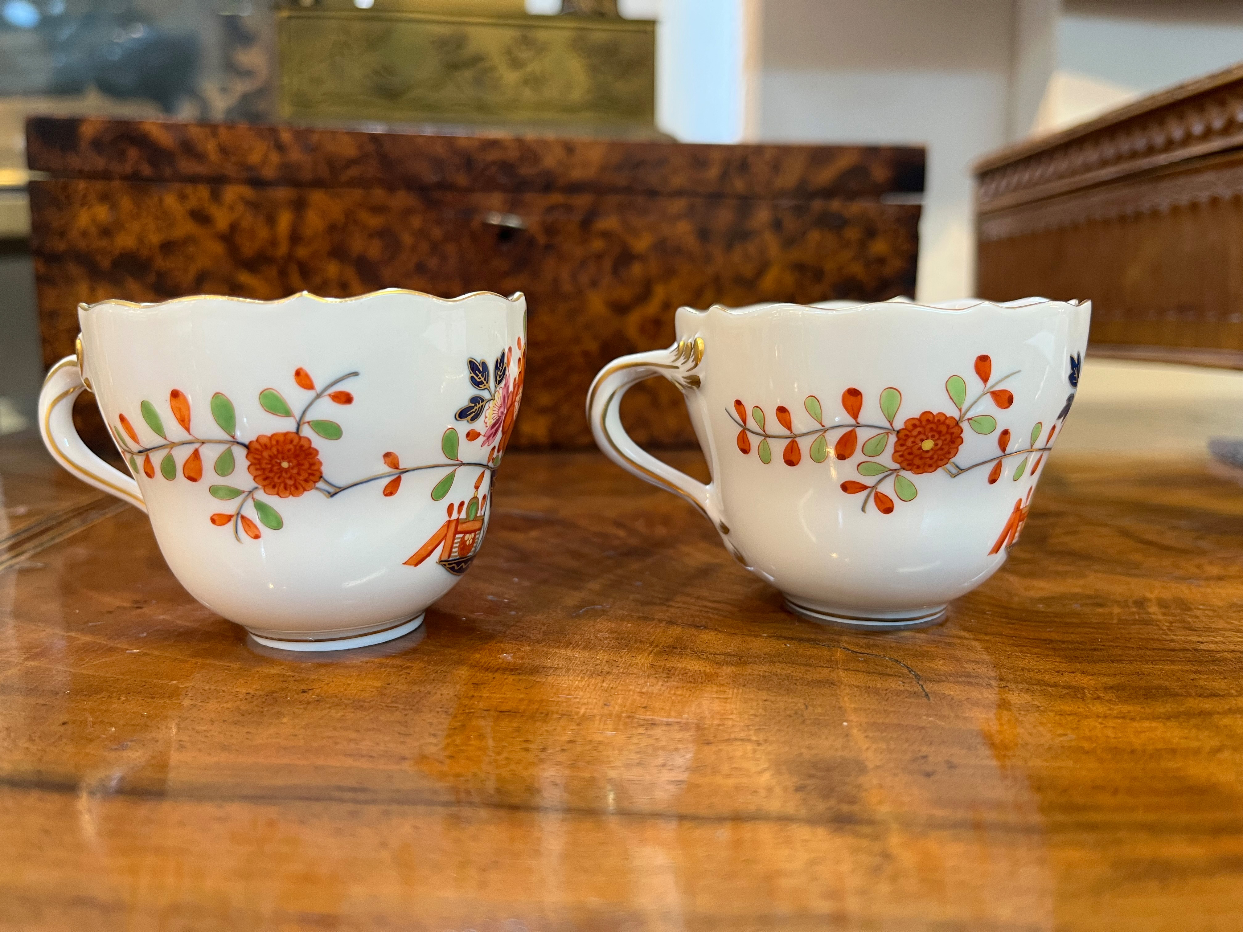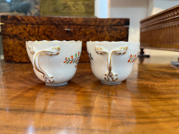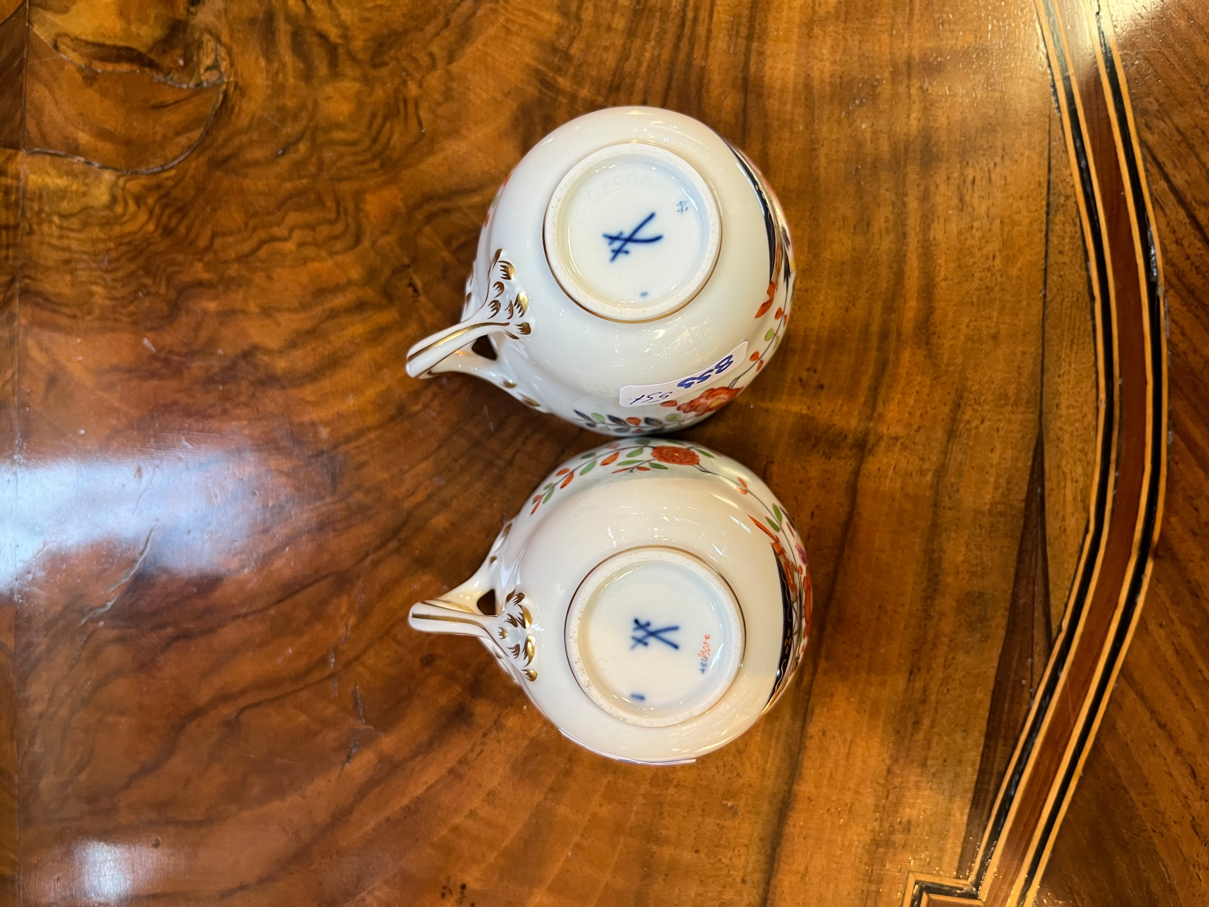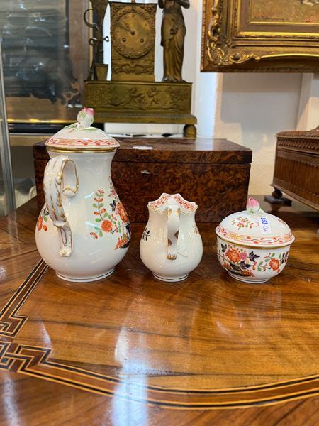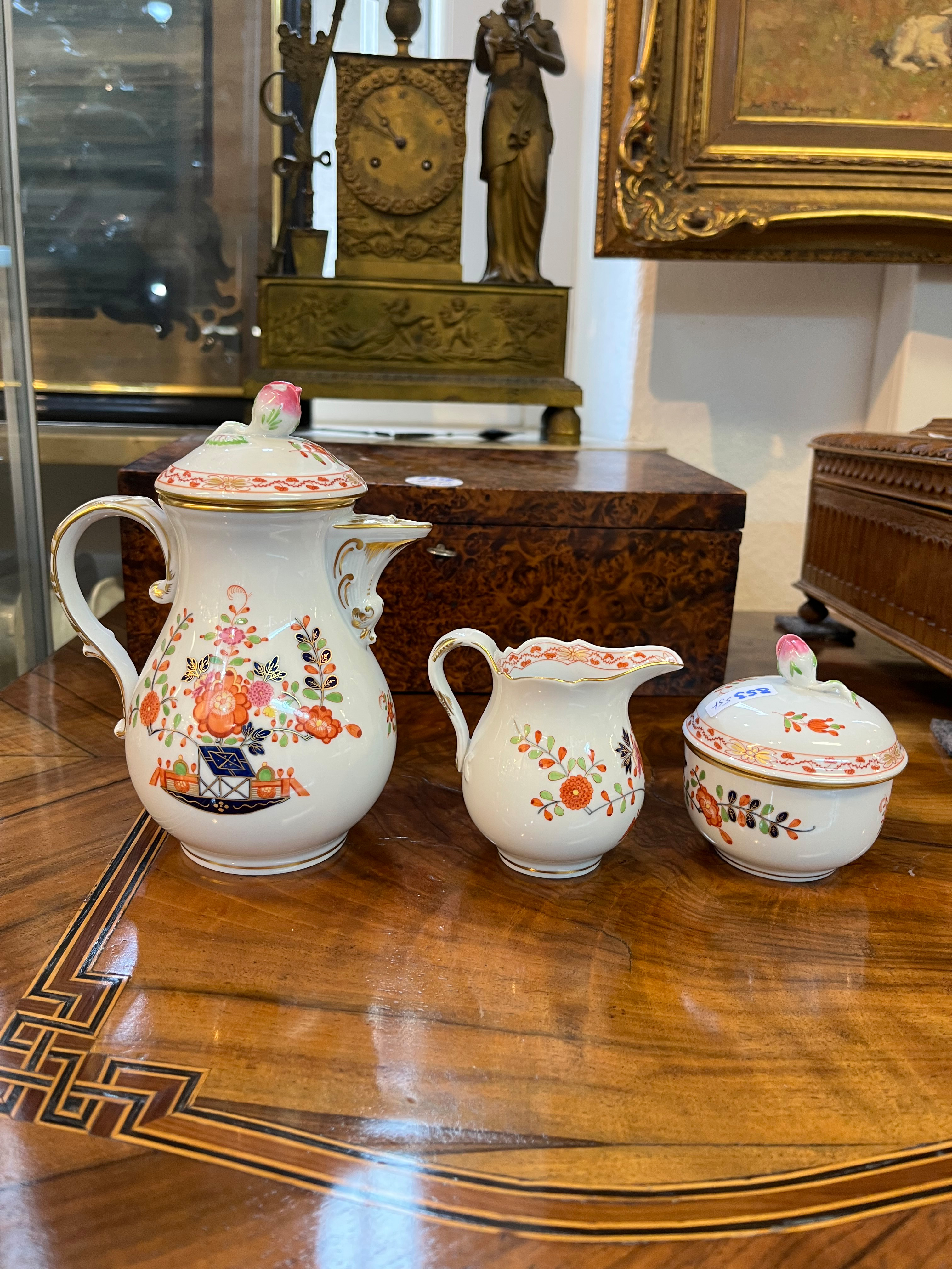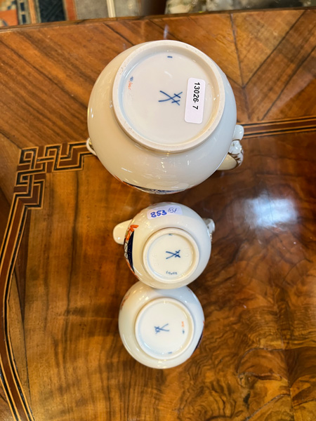 - Katalog-Nr: 853Déjeuner „Tischchenmuster“. Meissen 20. Jh. Porzellan, bunt bemalt und farbig überdekoriert; am Boden unterglasurblaue Schwertermarke. Bestehend aus: Eine Kanne (H=18 cm), ein Milchgießer (H=8 cm), eine Zuckerdose (H=8 cm) und ein Paar Tassen mit Unterschalen. (nadelkopfgroß best.)o.L.