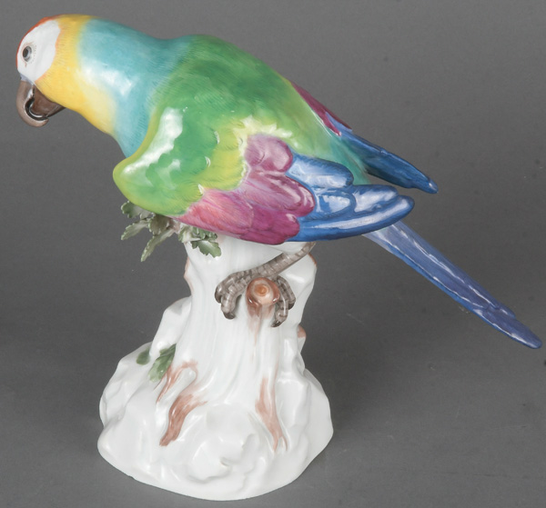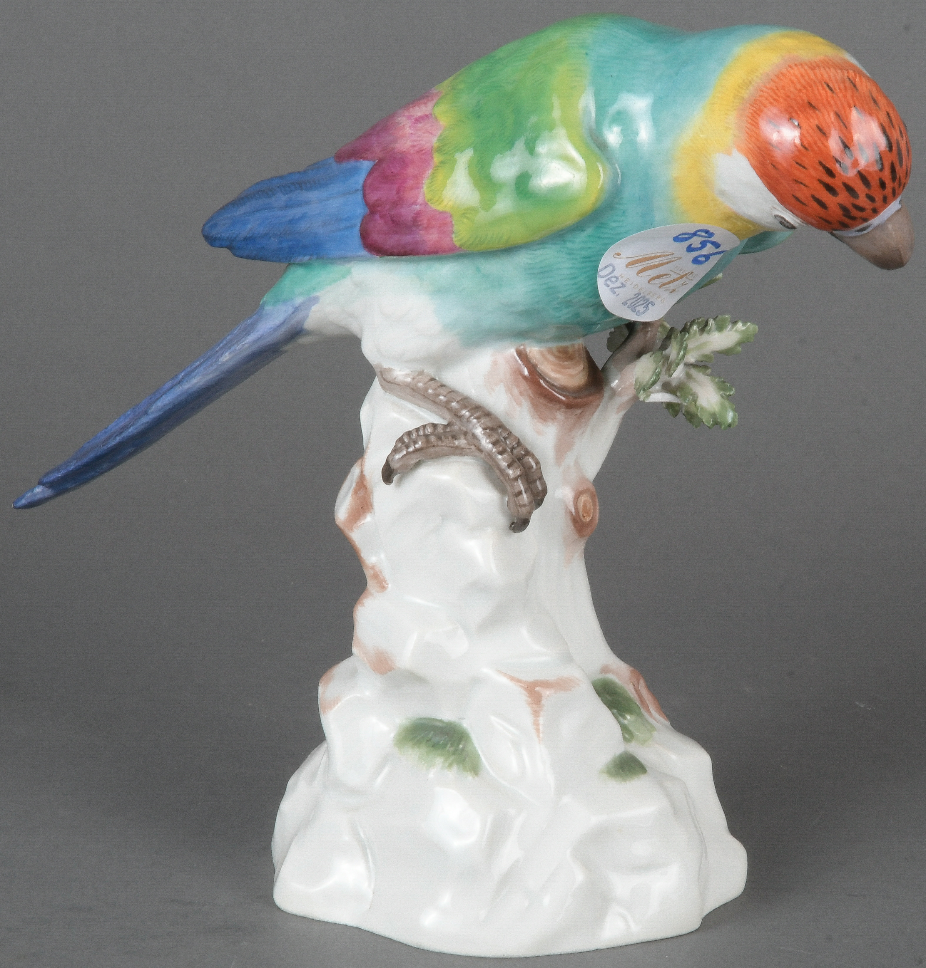 - Katalog-Nr: 856Papagei. Meissen Pfeifferzeit 1924-34. Porzellan, naturalistisch modelliert und staffiert; am Boden unterglasurblaue Schwertermarke, Modell nach Johann Joachim Kaendler, H=19,2 cm. (best.)o.L.