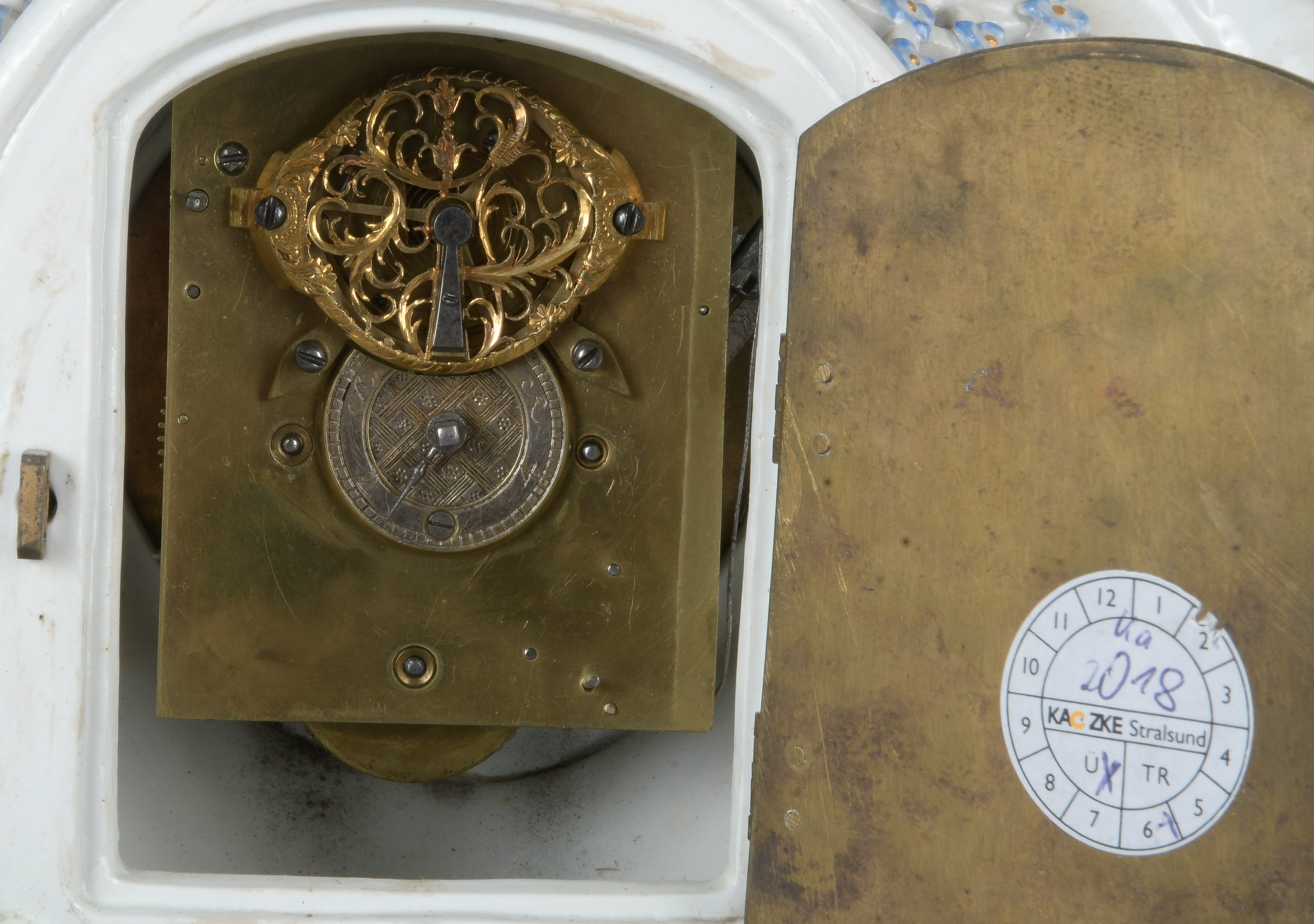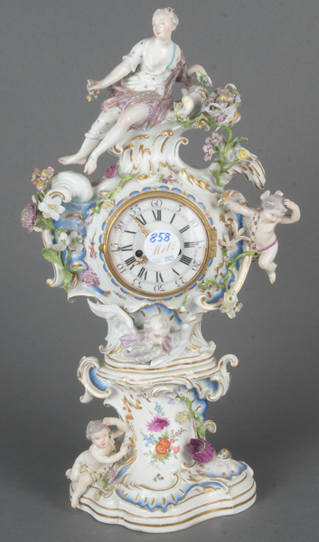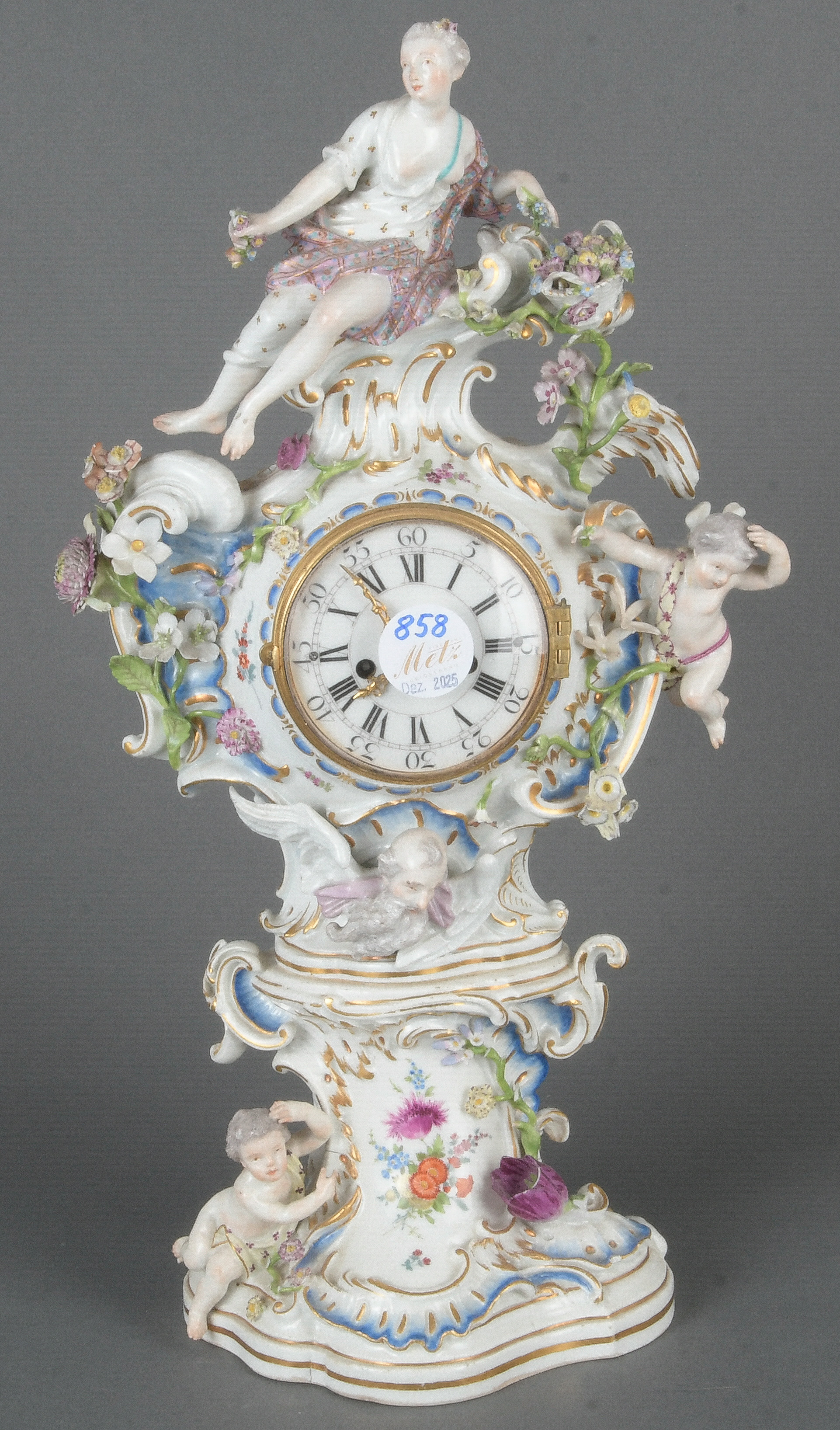 - Katalog-Nr: 858Tischuhr. Meissen 1763-73. Porzellan, aufwendig aufbossiert mit Blüten, Putten, Flora und Maskaronen sowie bunt bemalt mit Blumenbouquet, gold und blau gesäumt; am Boden unterglasurblaue unterglasurblaue Schwertermarke, Modell von Johann Joachim Kaendler; mit Spindelwerk und rundem Emailzifferblatt, H=44 cm. (best. / Funktion ungeprüft)o.L.