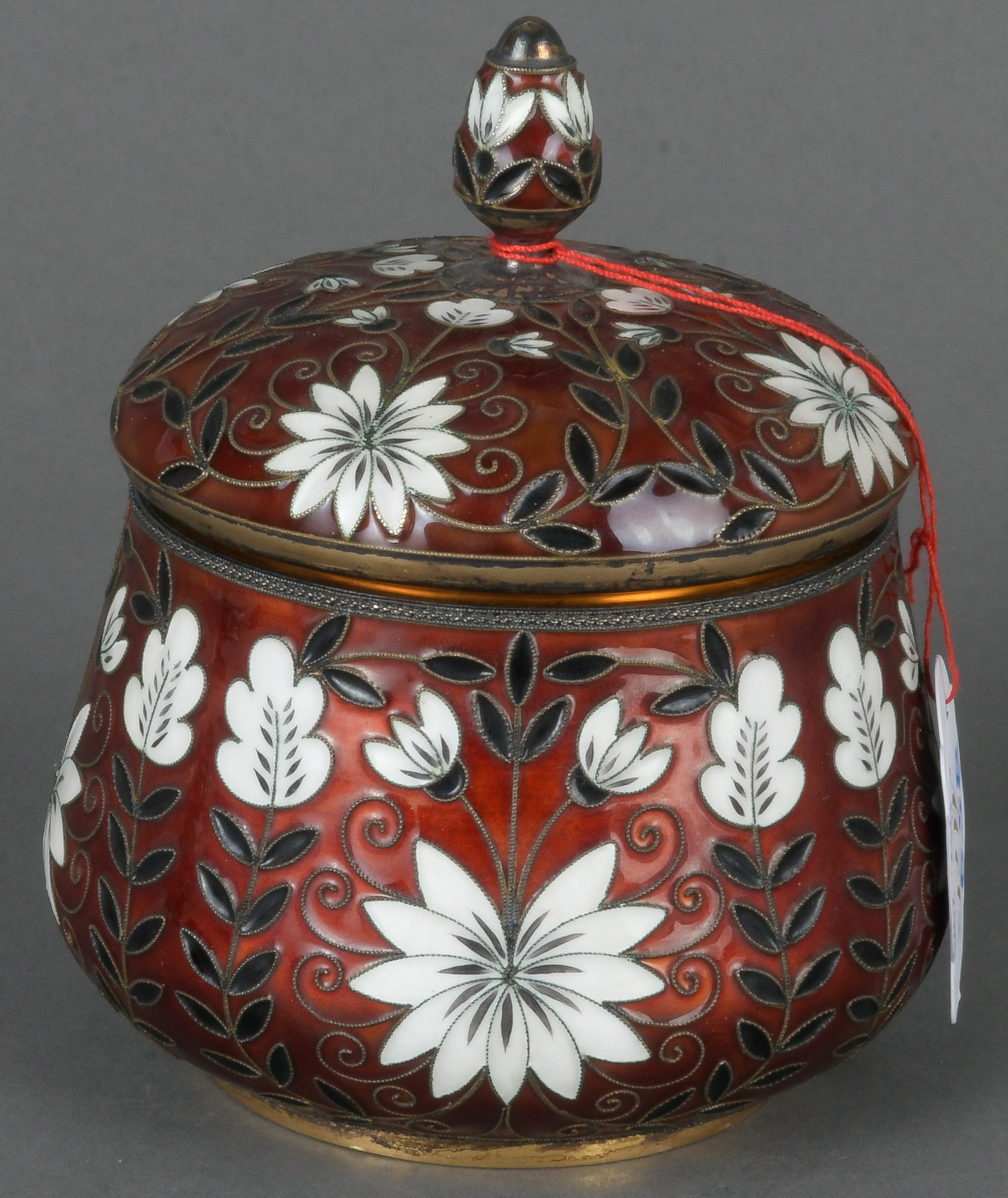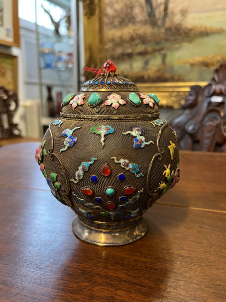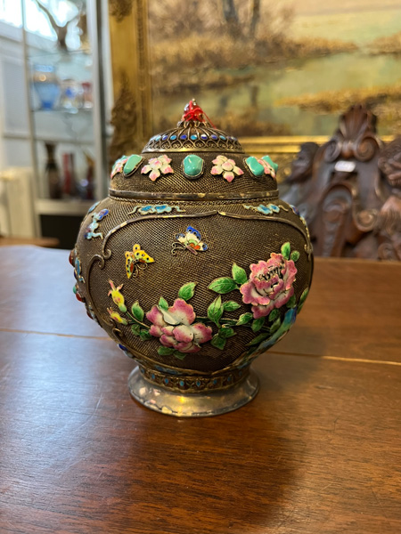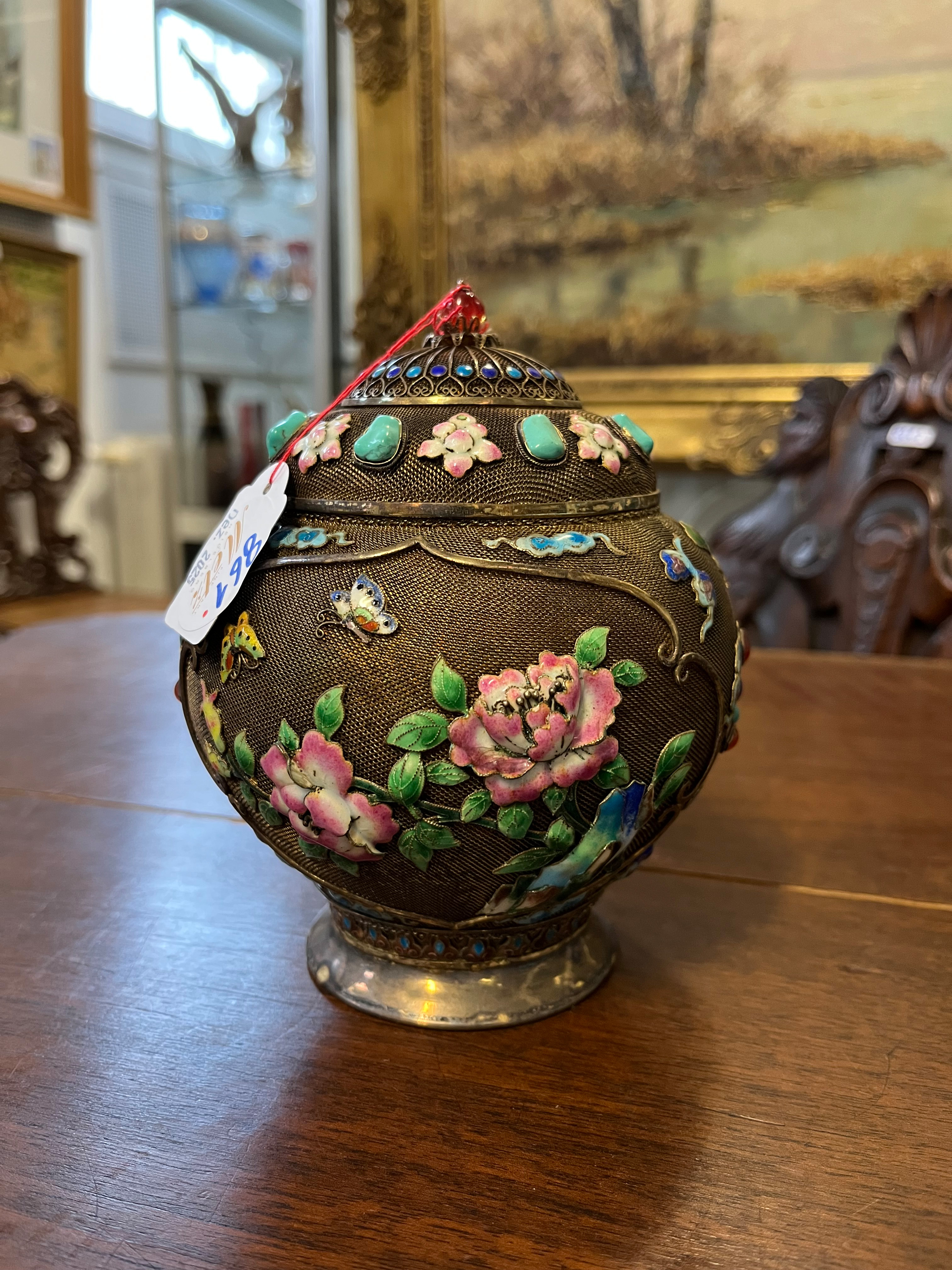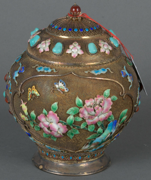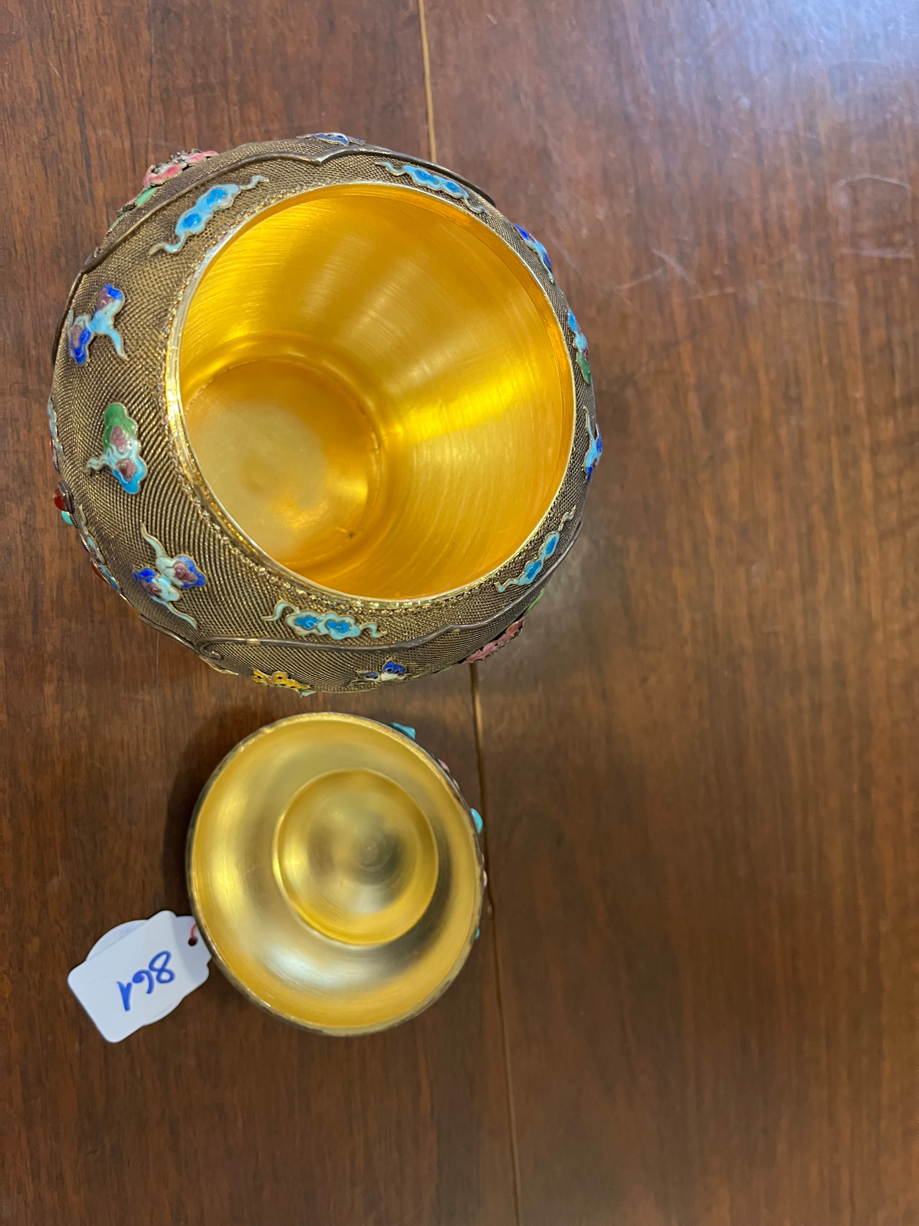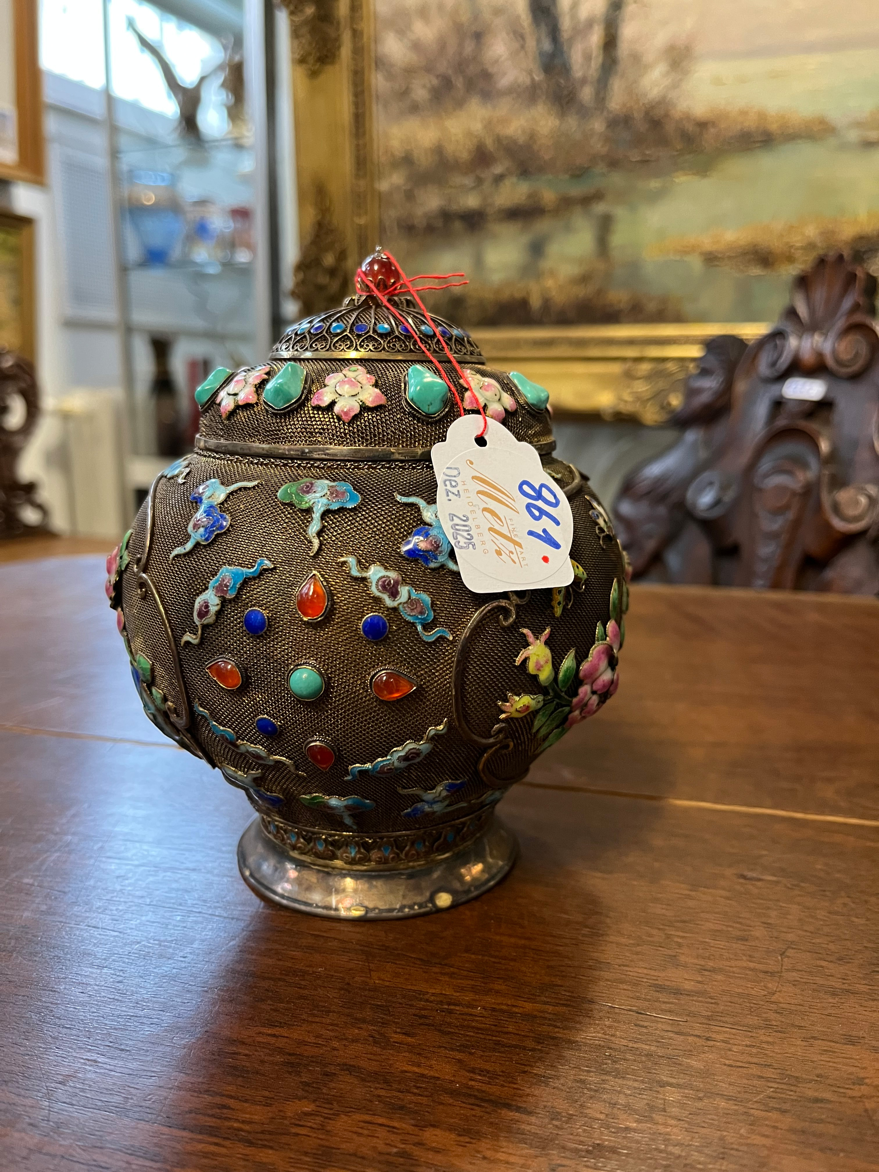 - Katalog-Nr: 861Runde Deckeldose. Asien. Silber, ca. 476 g, vergoldet, reich farbig mit aufgelegten Emailblüten und Insekten, H=16,5 cm.o.L.