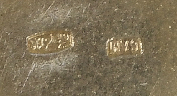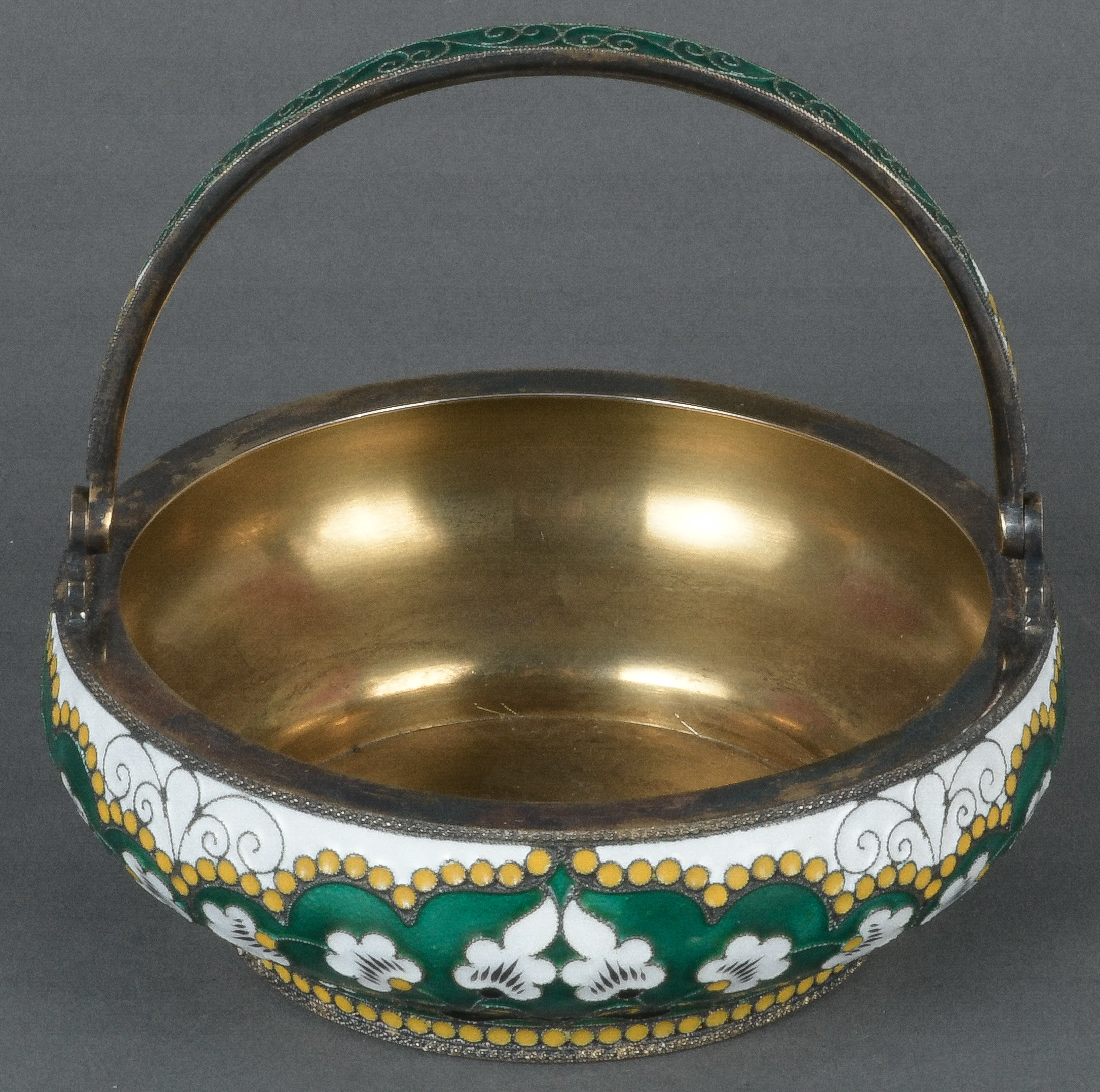 - Katalog-Nr: 860Runde Henkelschale. Russland 20. Jh. Silber, ca. 199 g, vergoldet, exzellent emailliert, am Boden gepunzt, H=3,7 cm, B=10,4 cm, T=10,6 cm.o.L.