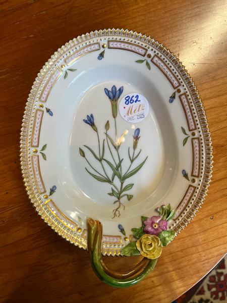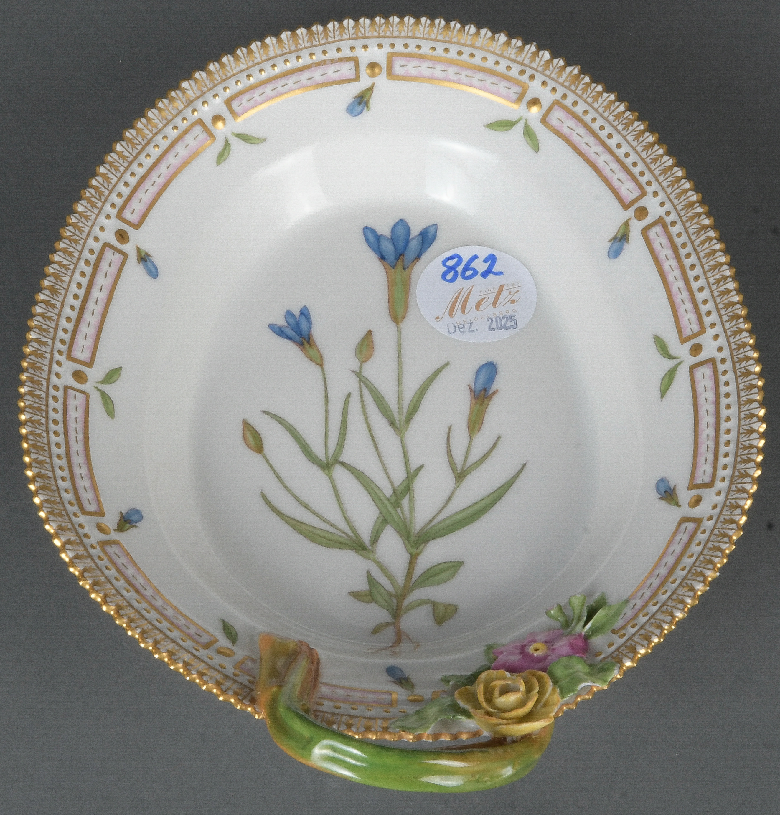 - Katalog-Nr: 862Ovale Schale „Flora Danica“. Royal Copenhagen 20. Jh. Porzellan, mit gold gesäumtem Zackenrand und bunt bemalt mit „Gentiana corolla Oed.“; verso betitelt und gemarkt, H=6,4 cm, B=17 cm,T=22 cm. (nadelkopfgroß best.)o.L.