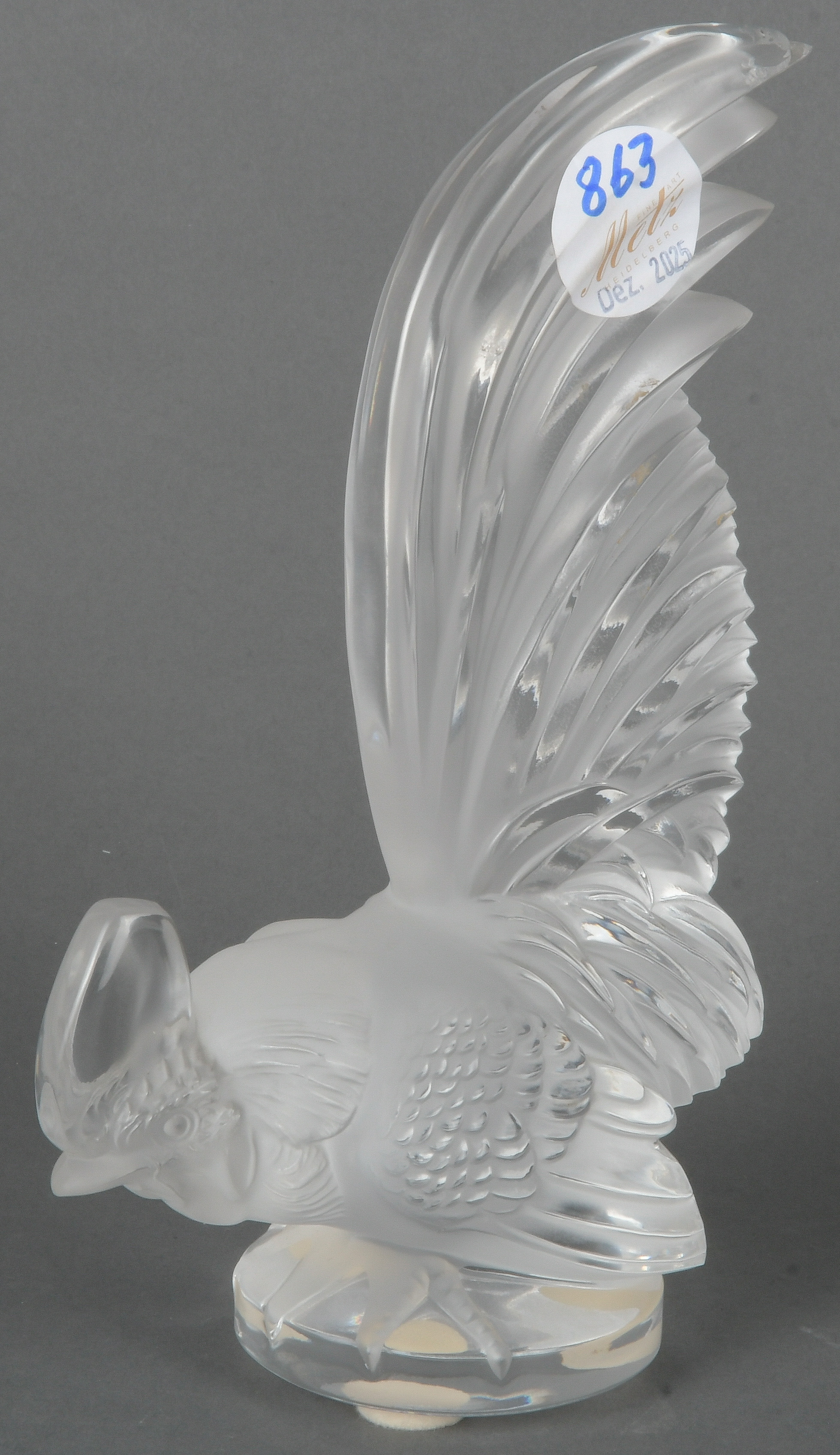 - Katalog-Nr: 863Hahn. Paris, René Lalique 20. Jh. Farbloses opakes Glas, seitl. am Sockel sign., H=20,6 cm. (min. best.)o.L.