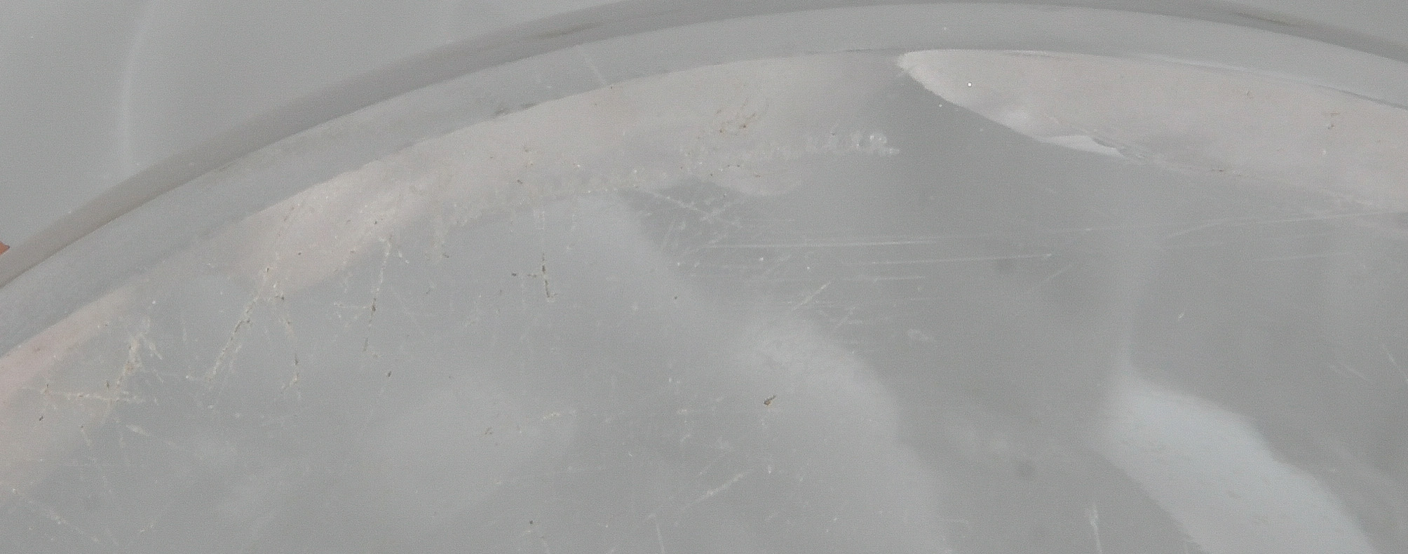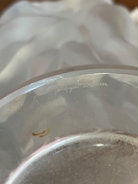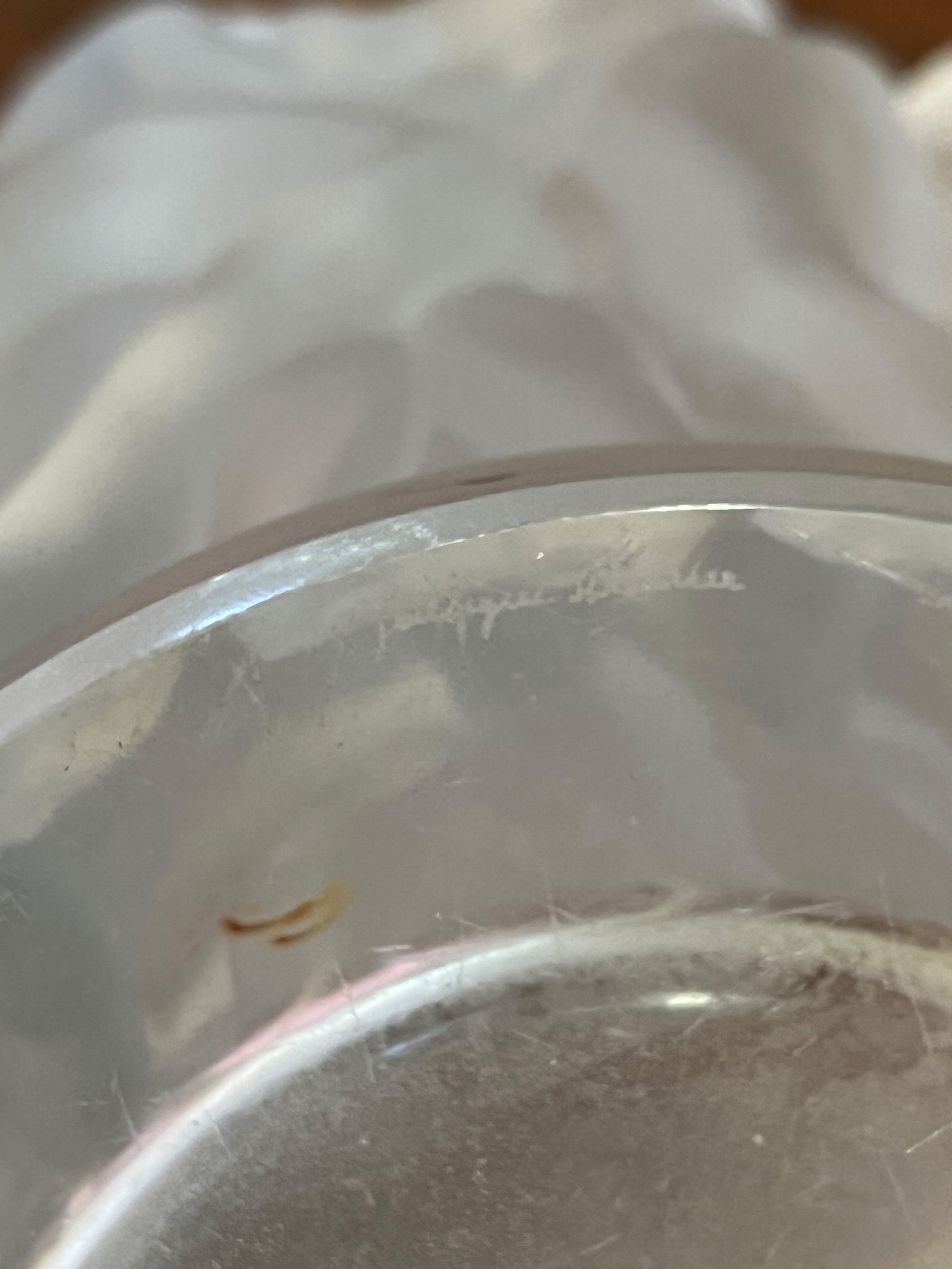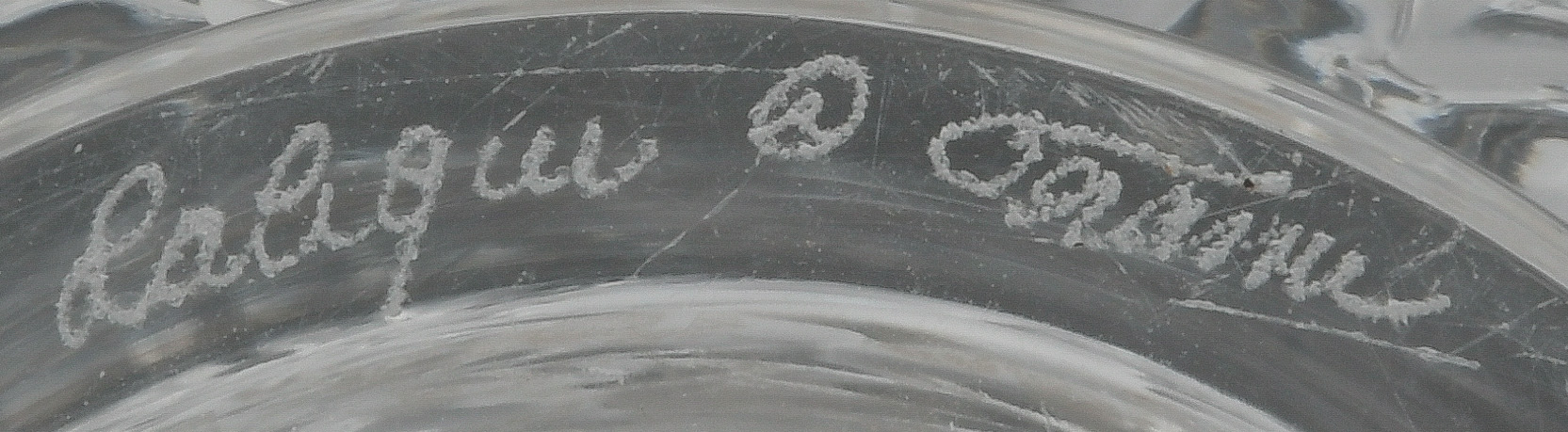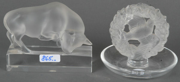- Katalog-Nr: 865Anbietschale und Stier. Paris, René Lalique 20. Jh. Farbloses opakes Glas, am Boden sign., H=8,7 / 8,8 cm. (min. best.)o.L.