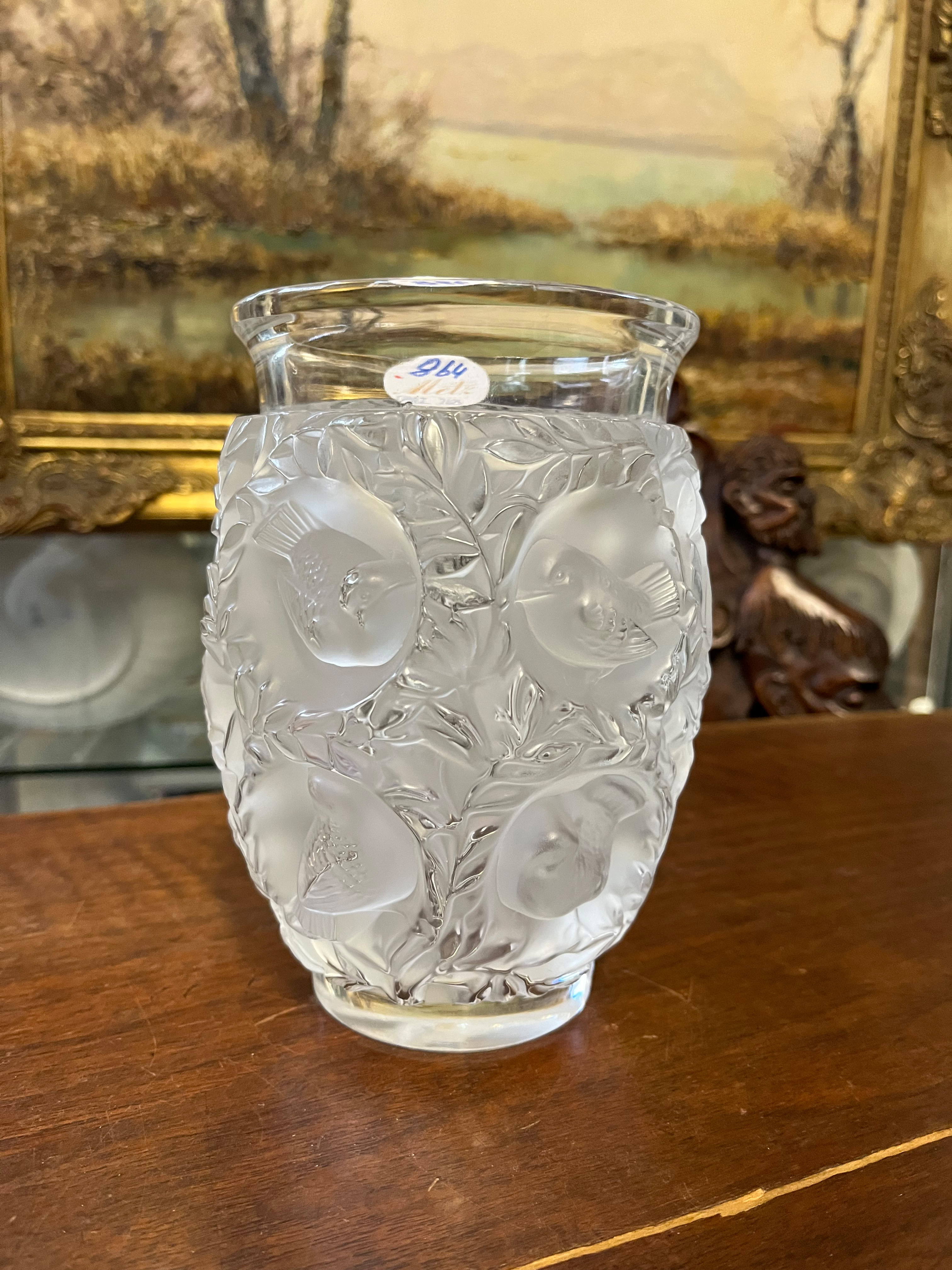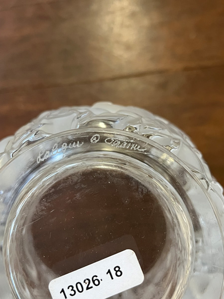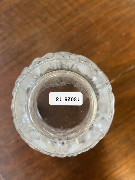 - Katalog-Nr: 864Vase. Paris, René Lalique 20. Jh. Farbloses opakes Glas, die Wandung umlaufend reliefiert mit Floraldekor; am Boden sign., H=16 cm.o.L.