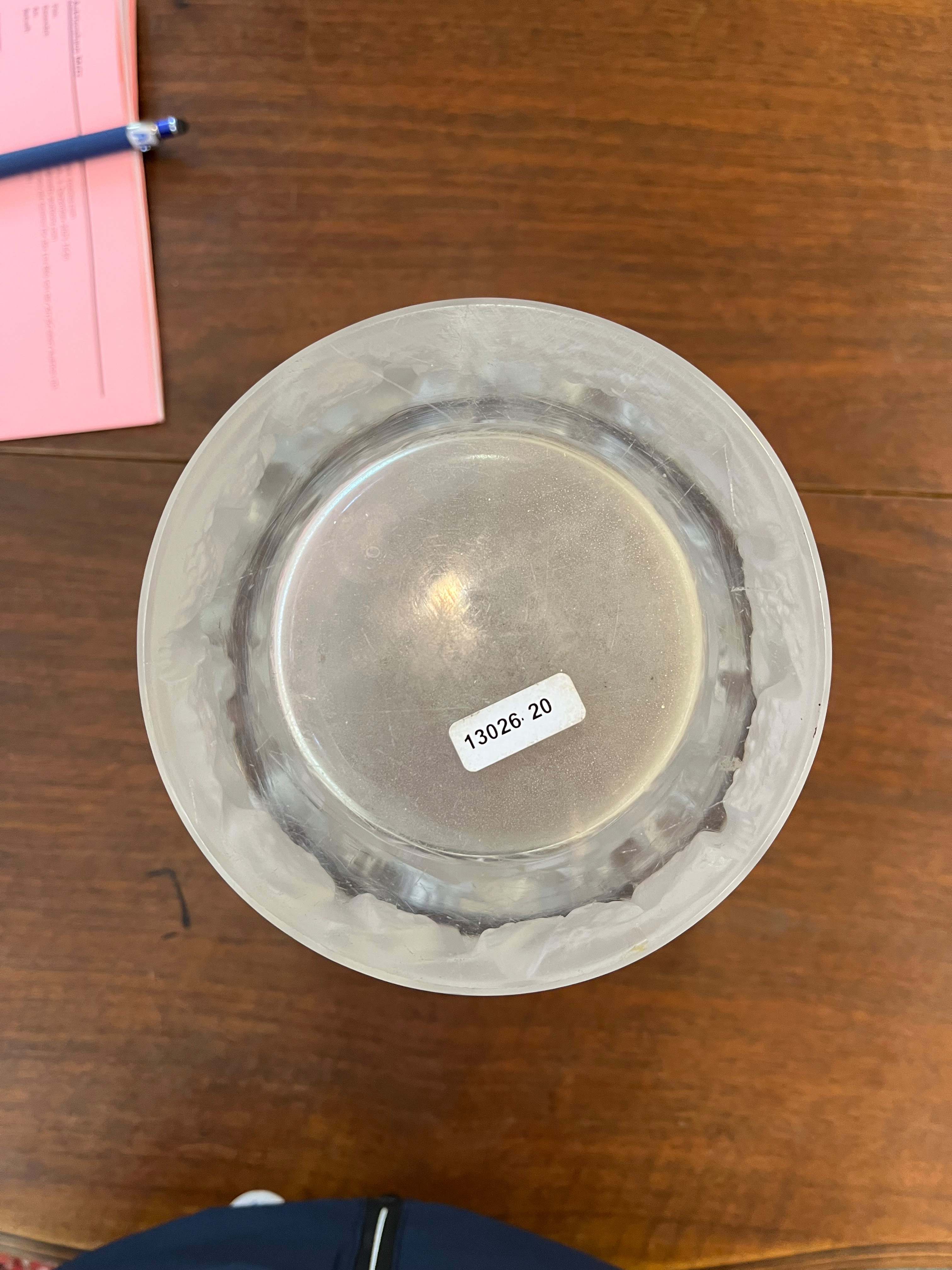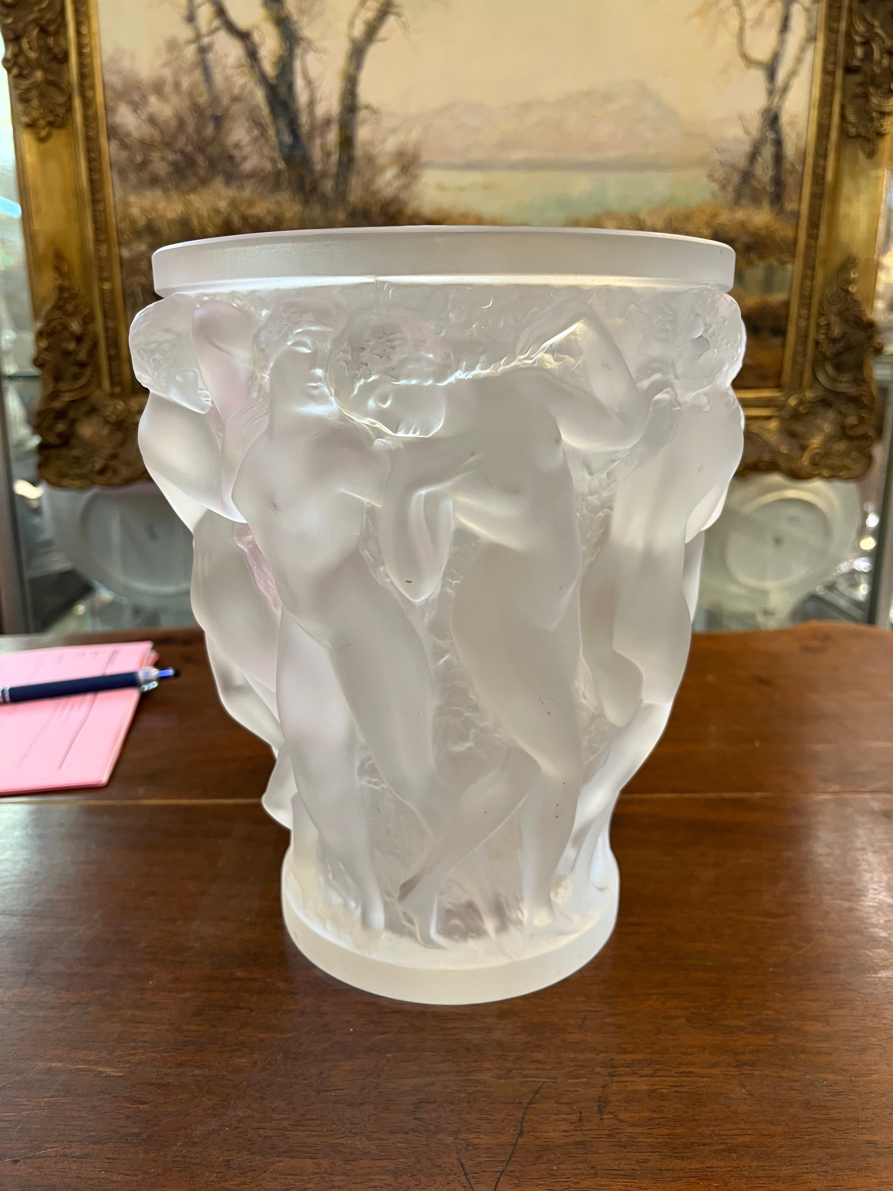 - Katalog-Nr: 866Hohe Vase. Paris, René Lalique 20. Jh. Farbloses opakes Glas, die Wandung umlaufend reliefiert mit Frauenakten; am Boden sign., H=24,5 cm.o.L.