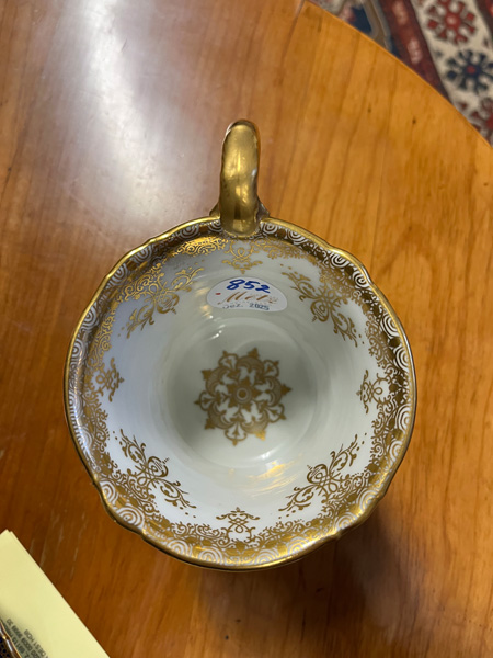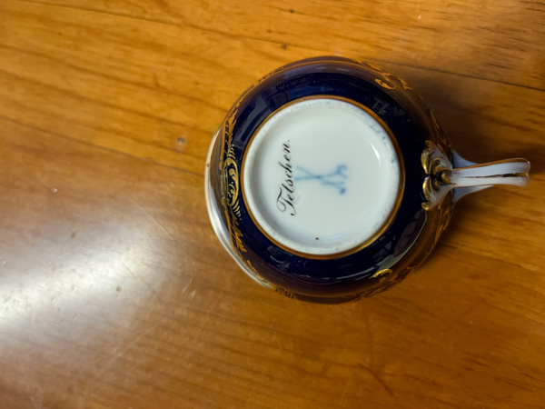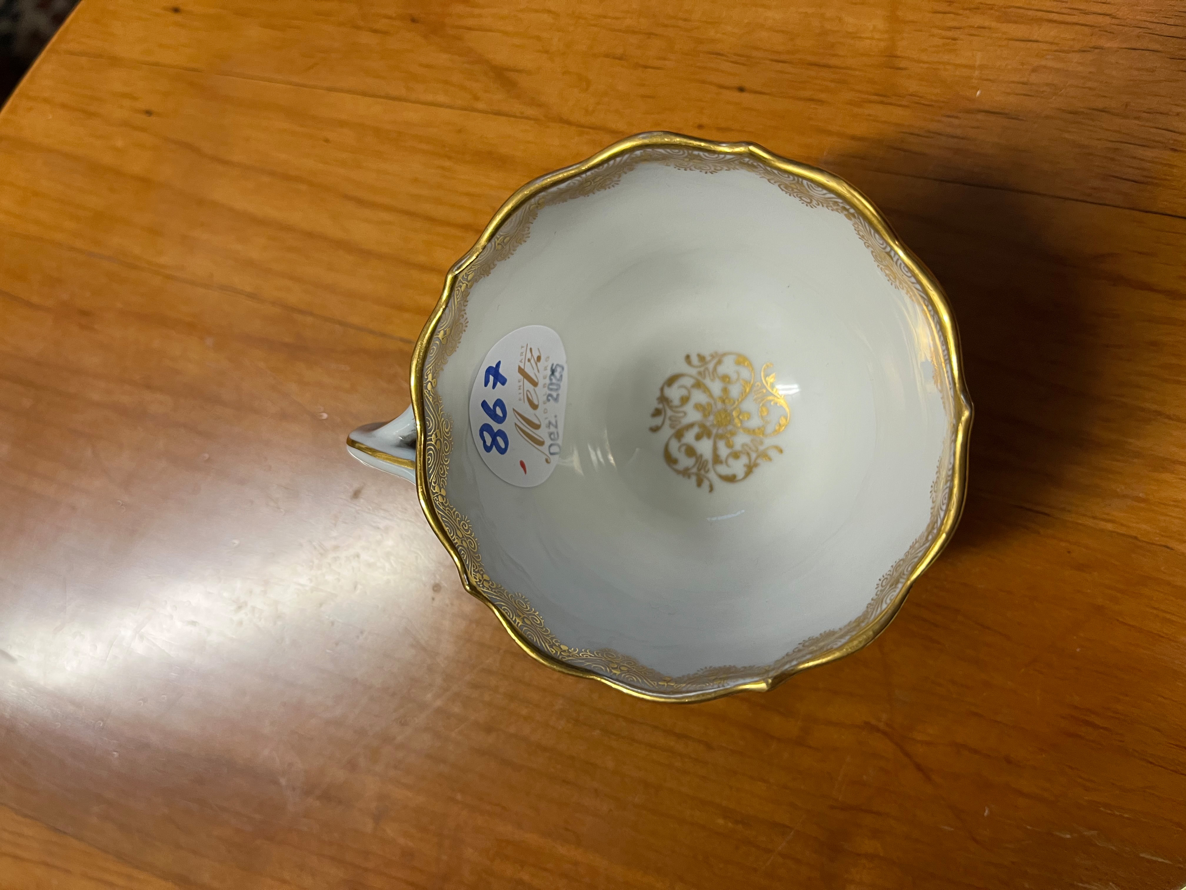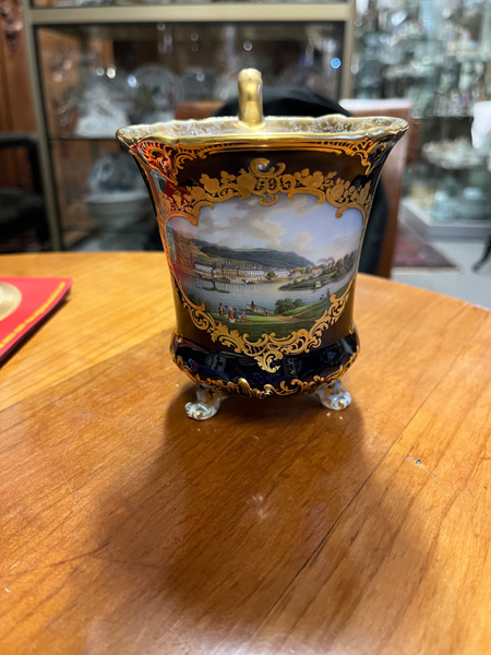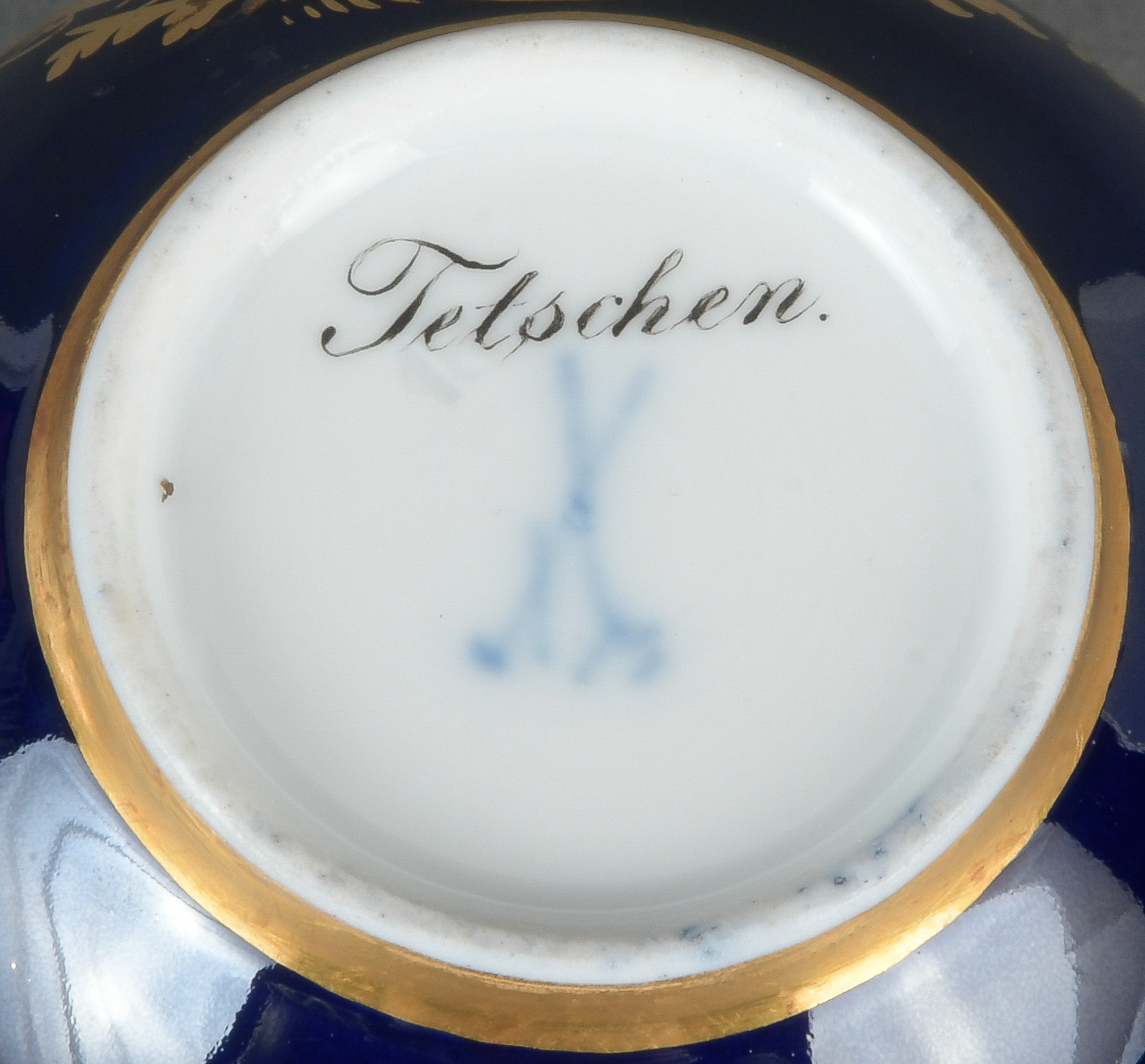 - Katalog-Nr: 867Schokoladentasse mit Unterschale. Meissen 19. Jh. Porzellan, mit kobaltblauem Fond, Goldspitzenbordüren und -kartuschen, bunt bemalt mit Blumenbouquet bzw. Stadtansicht „Tetschen“; am Boden unterglasurblaue Schwertermarke und betitelt.o.L.