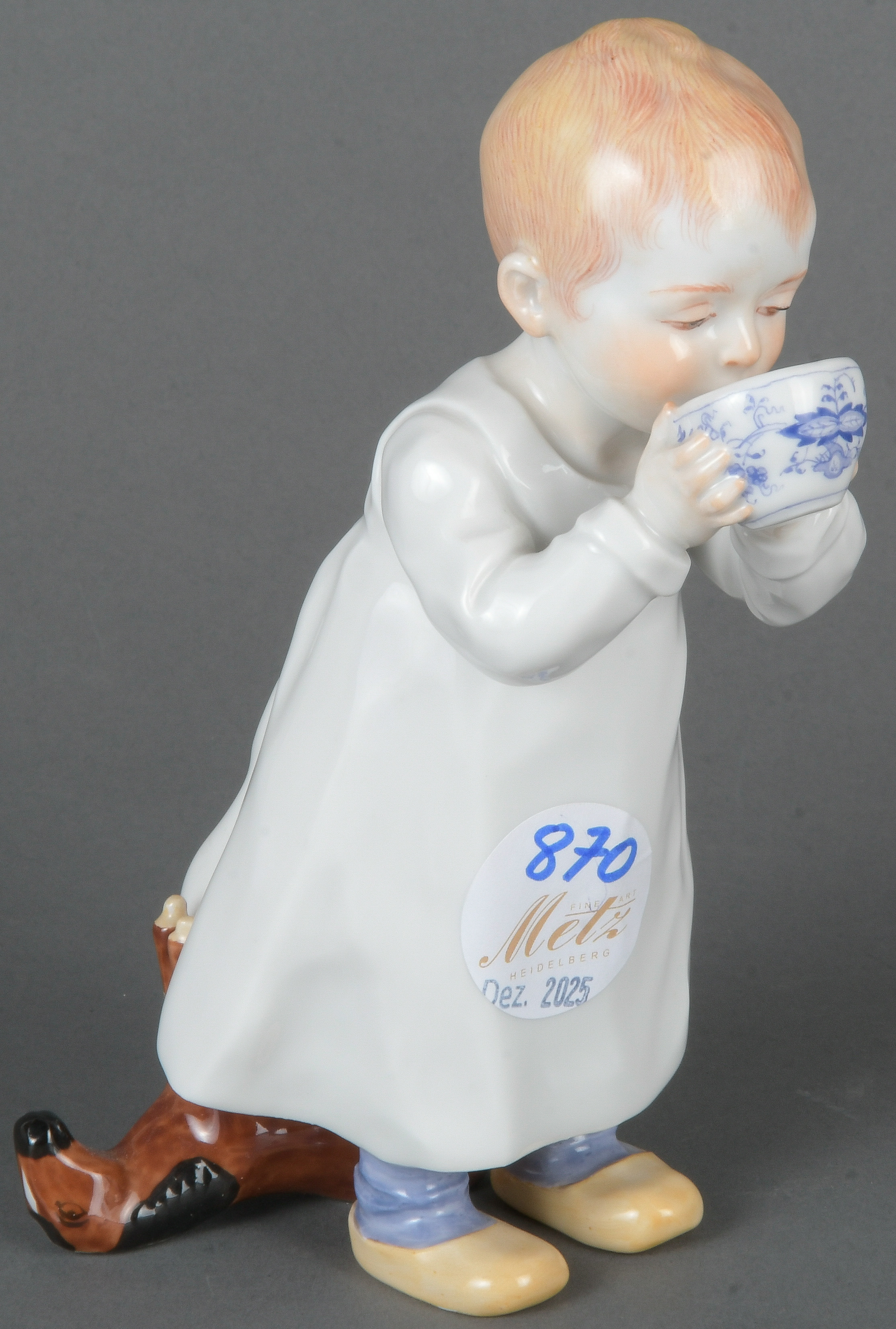 - Katalog-Nr: 870Kind mit Milchschale. Meissen 20. Jh. Porzellan, bunt bemalt; am Boden unterglasurblaue Schwertermarke, Modell nach Konrad Hentschel, H=17,2 cm.o.L.