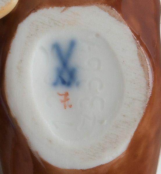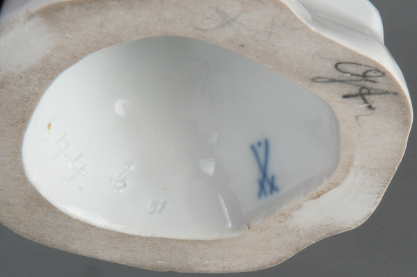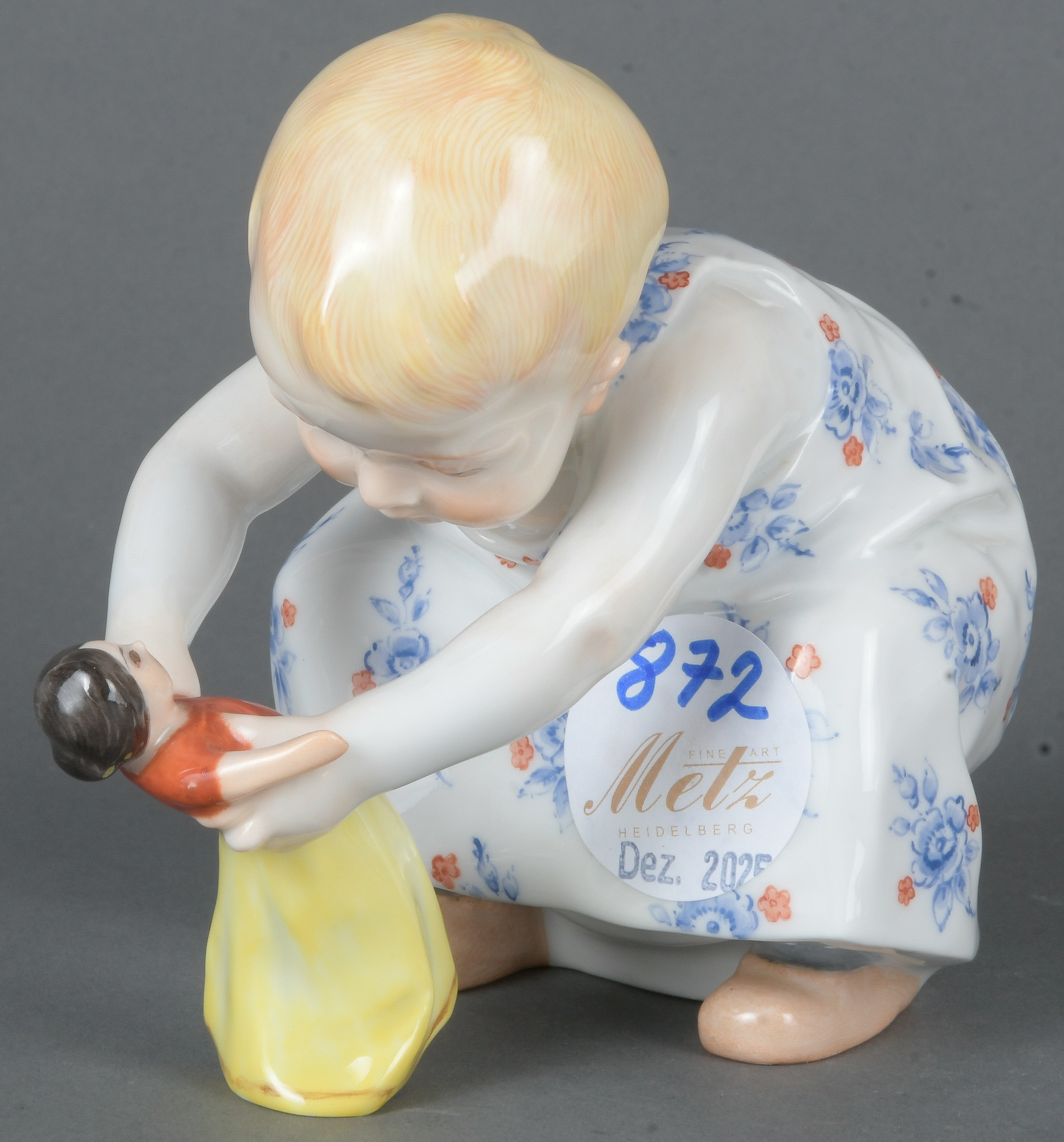 - Katalog-Nr: 872Mädchen mit Puppe. Meissen 20. Jh. Porzellan, bunt bemalt; am Boden unterglasurblaue Schwertermarke, Modell nach Konrad Hentschel, H=11,4 cm.o.L.