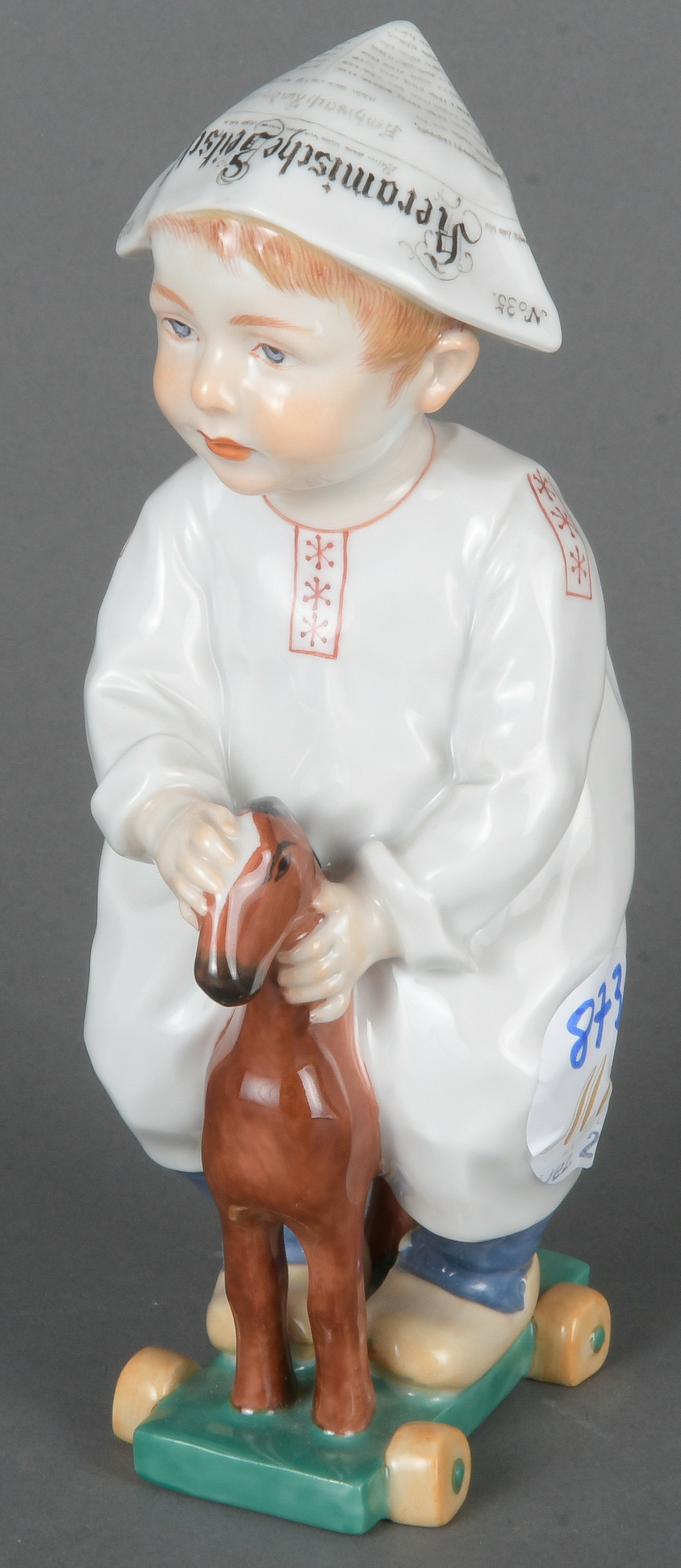 - Katalog-Nr: 873Knabe mit Holzpferd. Meissen 20. Jh. Porzellan, bunt bemalt; am Boden unterglasurblaue Schwertermarke, Modell nach Konrad Hentschel, H=18 cm.o.L.