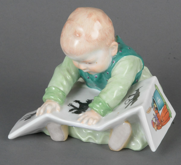 - Katalog-Nr: 871Kind mit Bilderbuch. Meissen 20. Jh. Porzellan, bunt bemalt; am Boden unterglasurblaue Schwertermarke, Modell nach Konrad Hentschel, H=11,1 cm.o.L.
