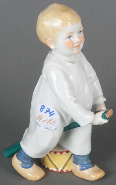 - Katalog-Nr: 874Knabe mit Steckenpferd und Trommel. Meissen 20. Jh. Porzellan, bunt bemalt; am Boden unterglasurblaue Schwertermarke, Modell nach Konrad Hentschel, H=19,5 cm.o.L.