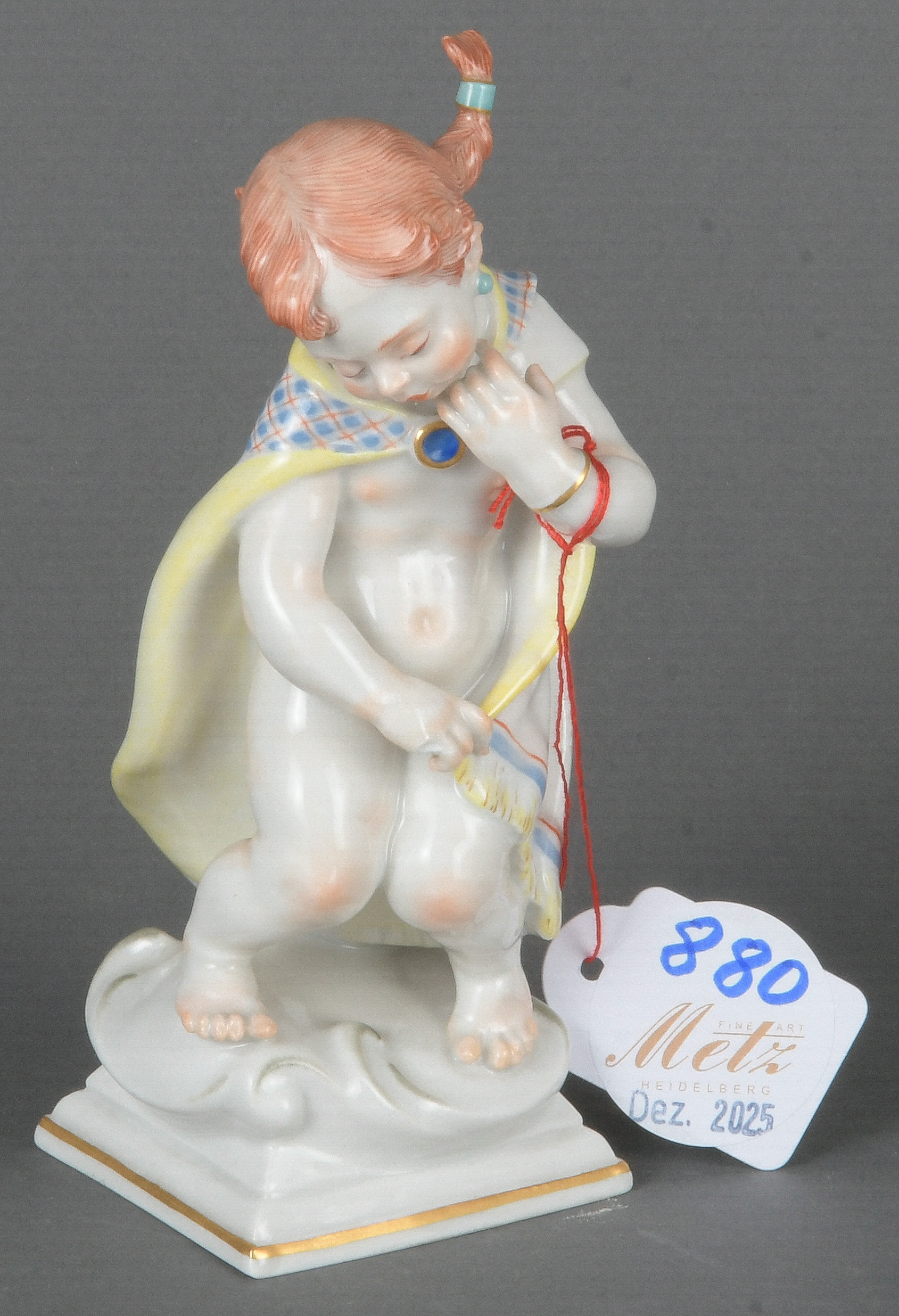 - Katalog-Nr: 880Jungfrau aus der Serie der Sternzeichen. Meissen 20. Jh. Porzellan, bunt bemalt; am Boden unterglasurblaue Schwertermarke, Entwurf von Heinrich Thein, H=14,2 cm. (min. rest.)o.L.