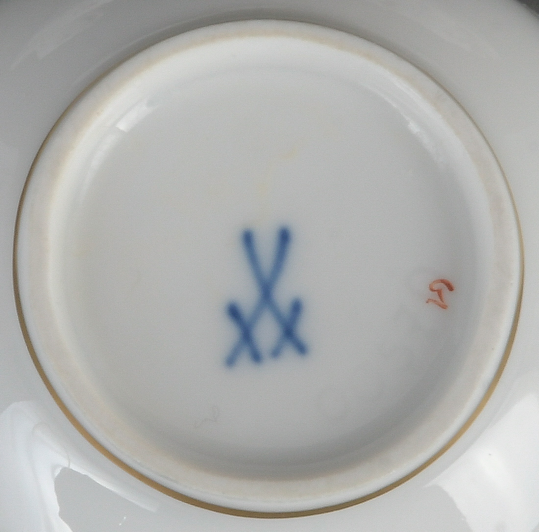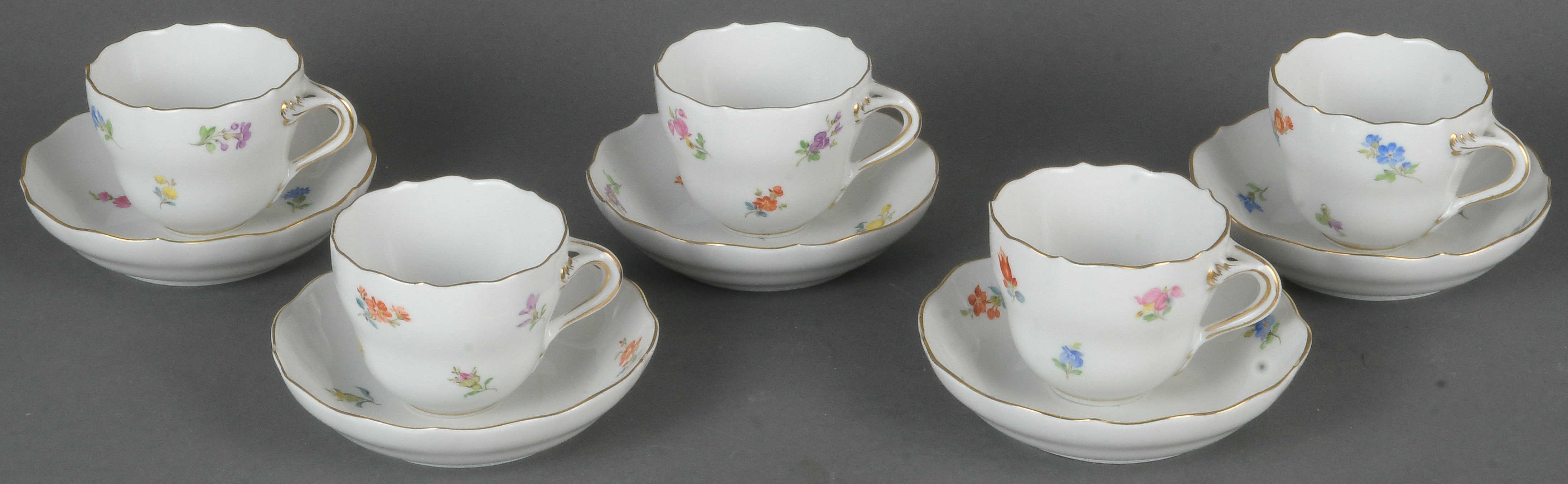 - Katalog-Nr: 888Fünf Mokkatassen mit Unterschalen „Streublumen“. Meissen 20. Jh. Porzellan, bunt bemalt, Goldrand; am Boden unterglasurblaue Schwertermarke.o.L.