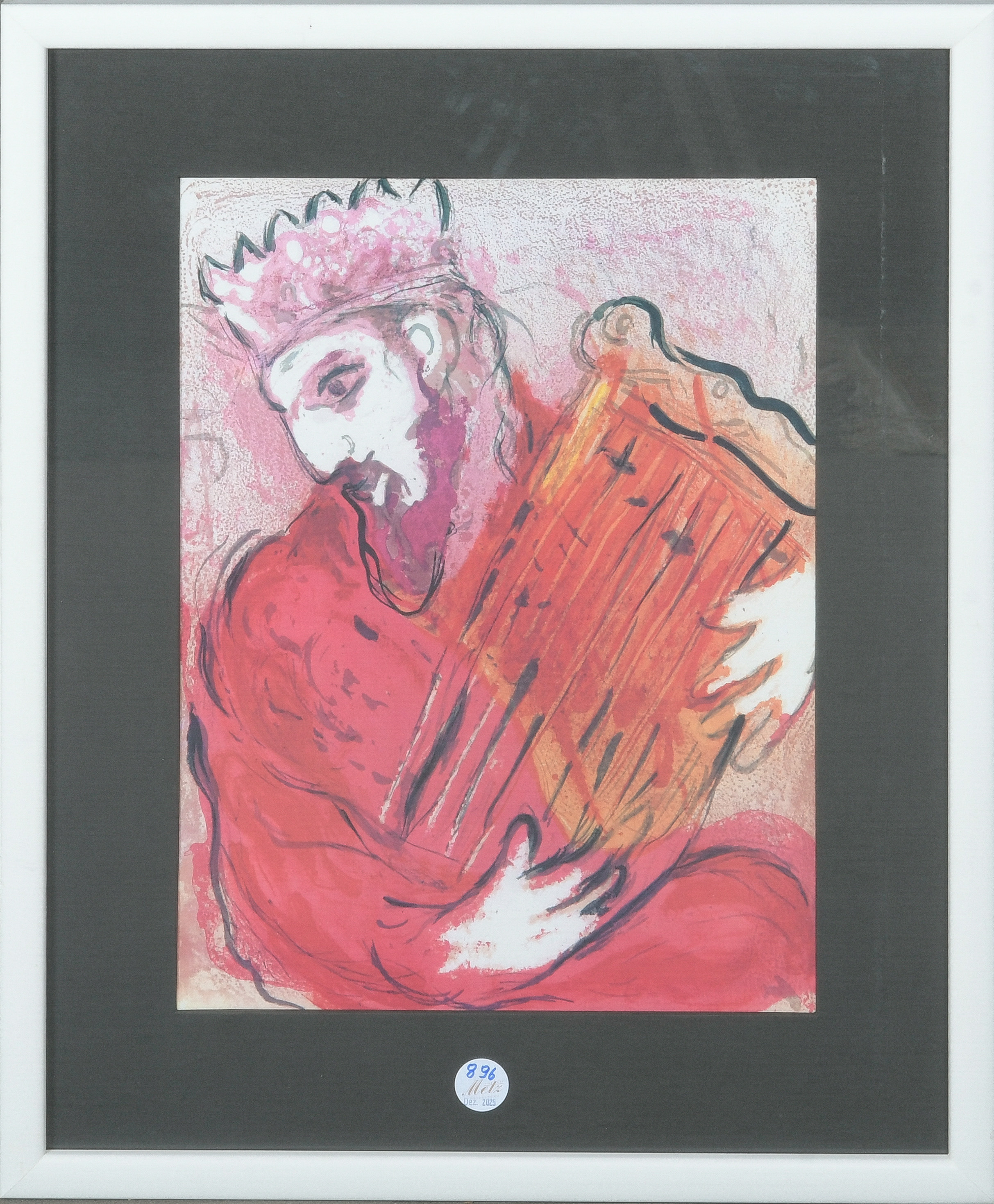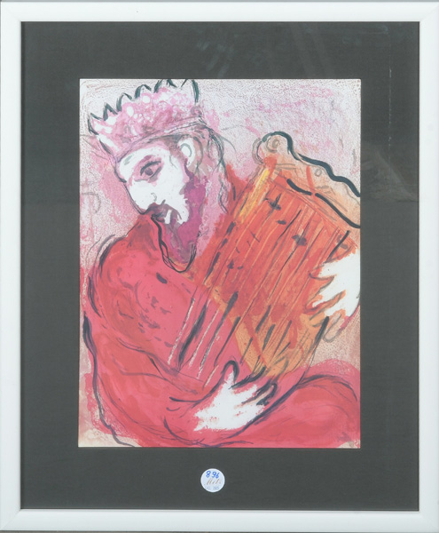 - Katalog-Nr: 896Marc Chagall (1887-1985). David mit Harfe. Farblithographie, mit Passepartout hi./Gl. gerahmt, 48 x 35,5 cm.o.L.