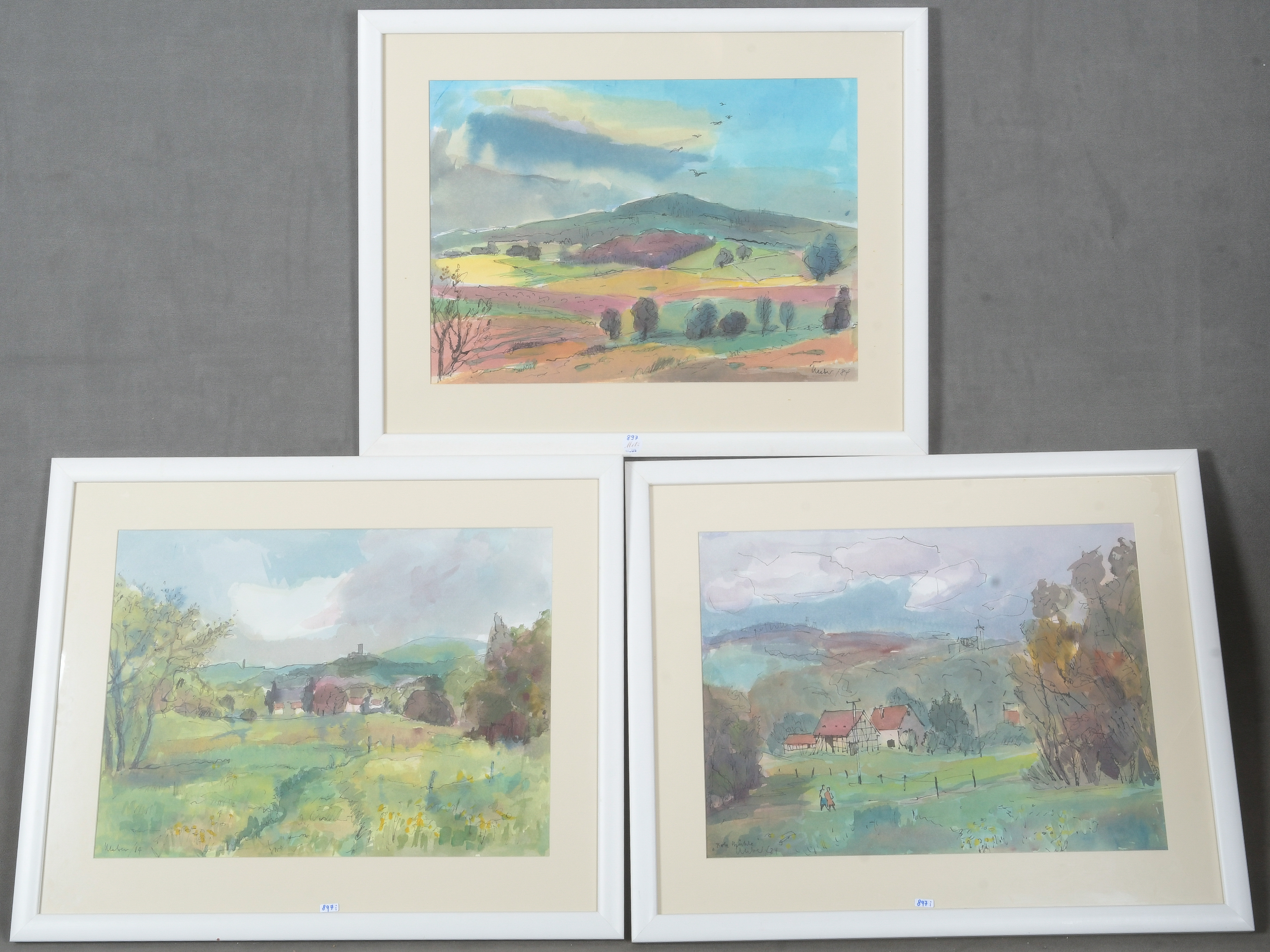 - Katalog-Nr: 897Horst Kleber (1921-1985). Landschaften mit Gebäude. Drei Aquarelle/Papier, li./u./sign./dat. 1984, mit Passepartout hi./Gl. gerahmt, 44,5 x 62,5 cm.o.L.