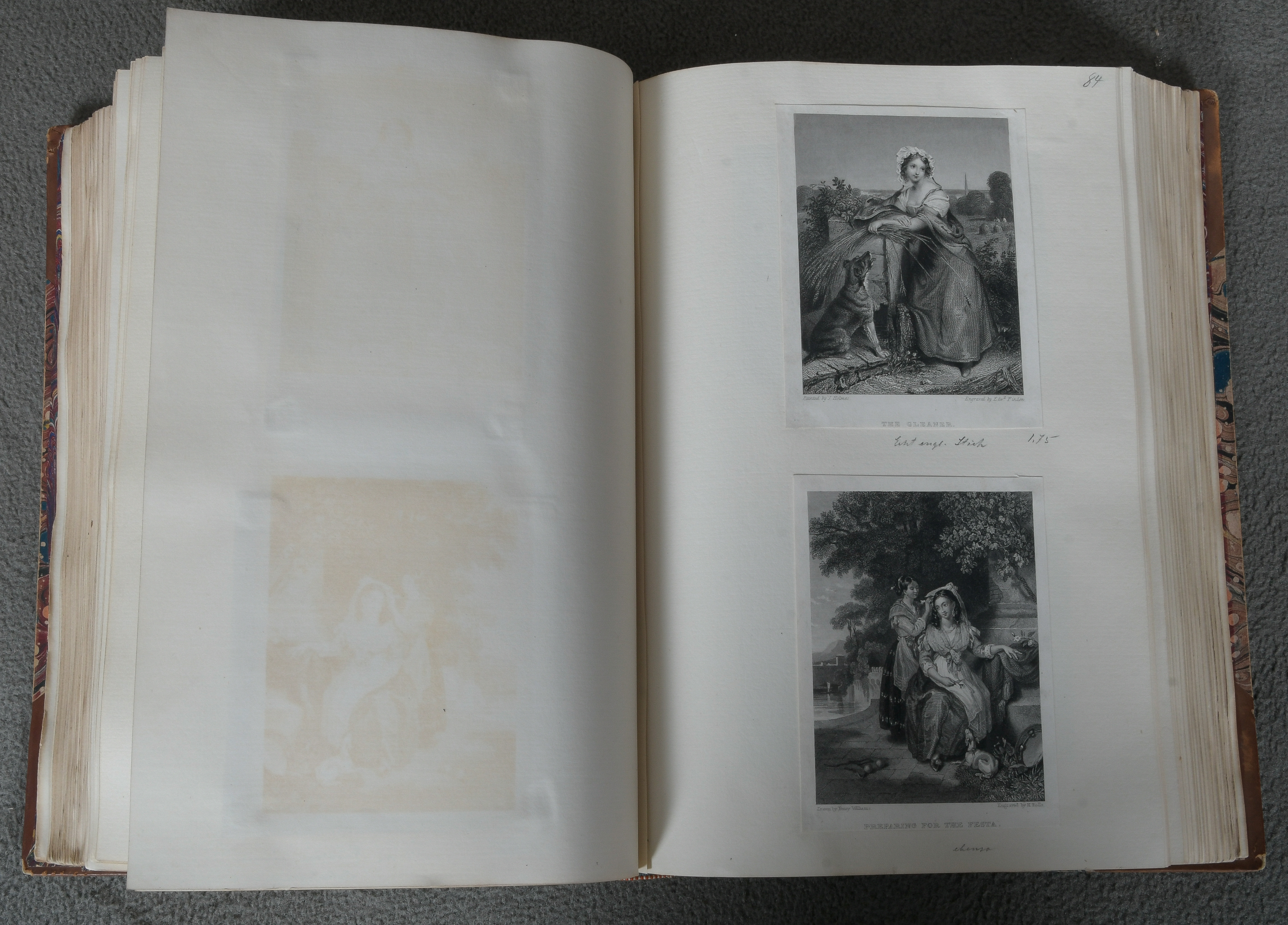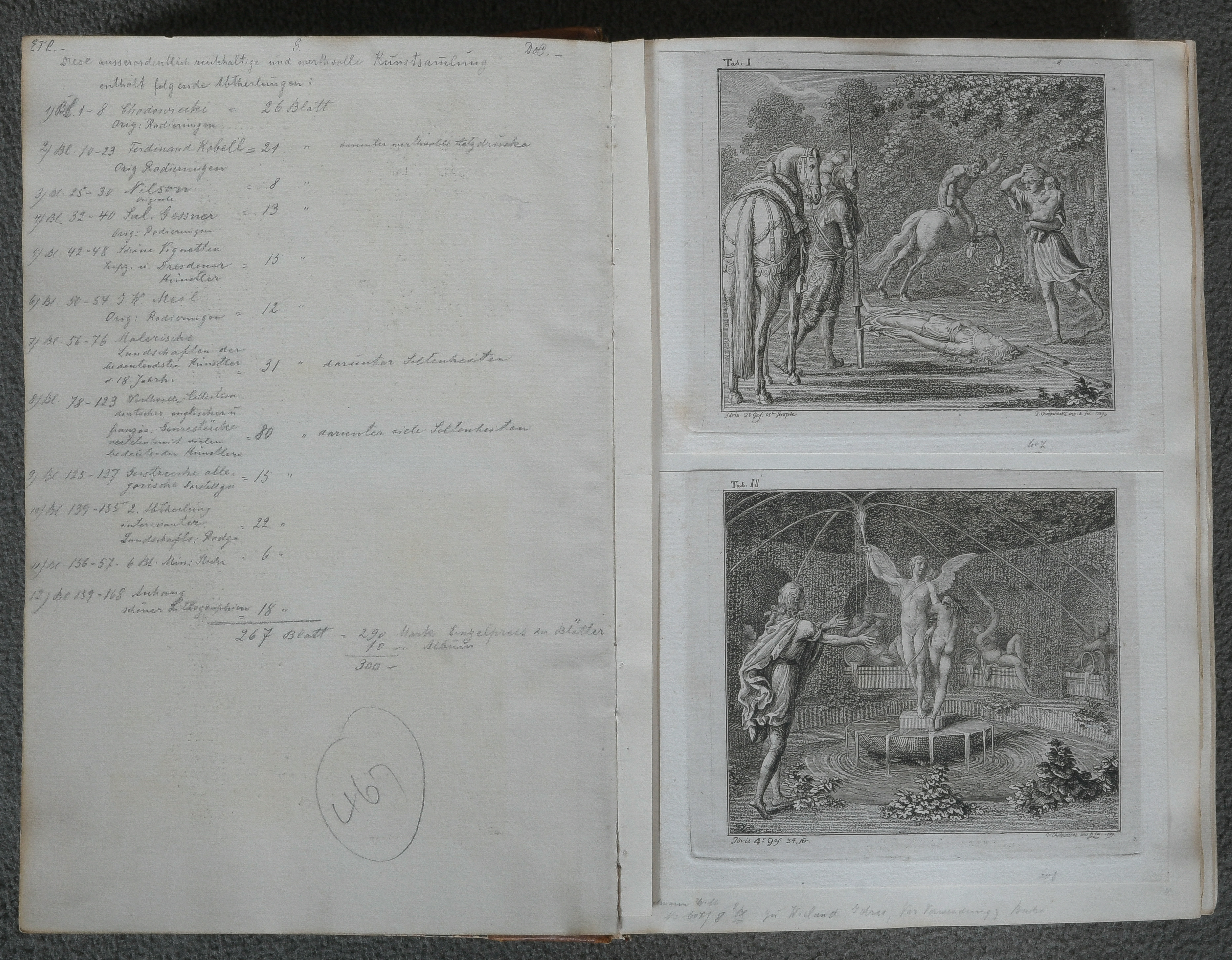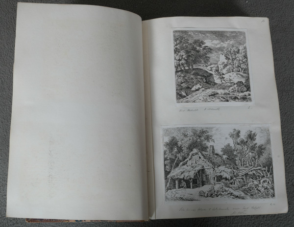 - Katalog-Nr: 898Halblederband mit Goldprägung: Auf der Buchdeckelinnenseite mit Bleistift handschriftlich beschriftet: .„Diese ausserordentlich reichhaltige und werthvolle Kunstsamlung“ mit 26 Original-Radierungen von Daniel Nikolaus Chodowiecki (1726-1801), 21 von Ferdinand von Kobell (1740-1799), 8 von Johann Esaias Nilson (1721-1788), 13 von Salomon Gessner (1730-1788), 13 Blatt mit Vignetten sächsischer Künstler, 12 Blatt von Johann Wilhelm Meil (1733-1805), 30 Blatt malerische Landschaften unterschiedlicher Künstler des 18. Jahrhunderts u.a. Anton Paul Eisen (1777-1843), J.G.C. Hendschel, Carl Wilhelm Kolbe (1757-1835), Andreas Leonhard Möglich (1742-1810), 80 Blatt mit Genreszenen, u.a. William Hogarth (1697-1764), Angelika Kaufmann, Adrian Ostade, Pierre Ranson (1736-1786), meist handschriftlich betitelt und teilw. kommentiert.o.L.