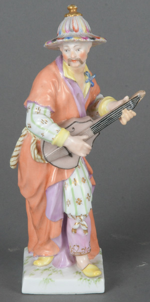 - Katalog-Nr: 879Stehender Chinese beim Gitarrespielen. Berlin 19. Jh. Porzellan, bunt bemalt, am Boden unterglasurblaue Szeptermarke, H=18 cm. (rest.)o.L.