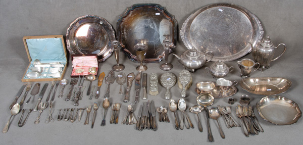 - Katalog-Nr: 887Konvolut Silber, ca. 1.000 g, und Versilbertes. Deutschland / USA 20. Jh. Bestehend aus: Ein Becherkelch (H=17 cm), ein Paar Leuchter (H=20 cm) und eine runde Platte (D=33 cm), weitere Platten, Besteckteile u.a.m.o.L.