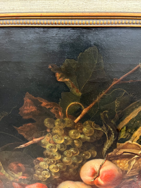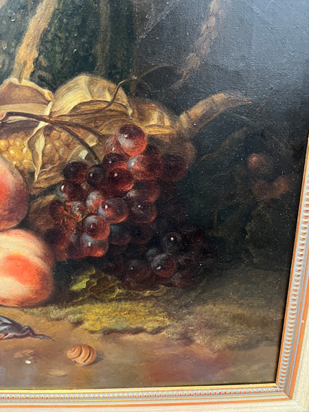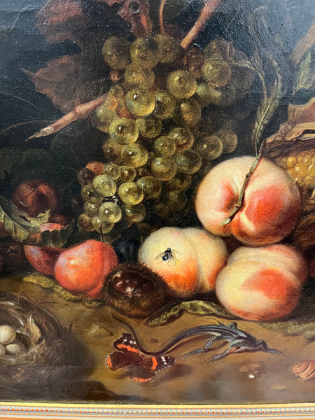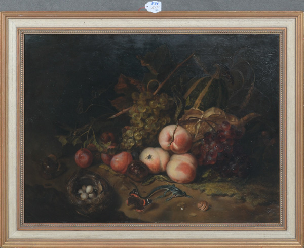 - Katalog-Nr: 891Maler des 20. Jhs. Stillleben mit Obst, Insekten und Reptil. Öl/Lw., gerahmt, 46 x 61,5 cm.o.L.
