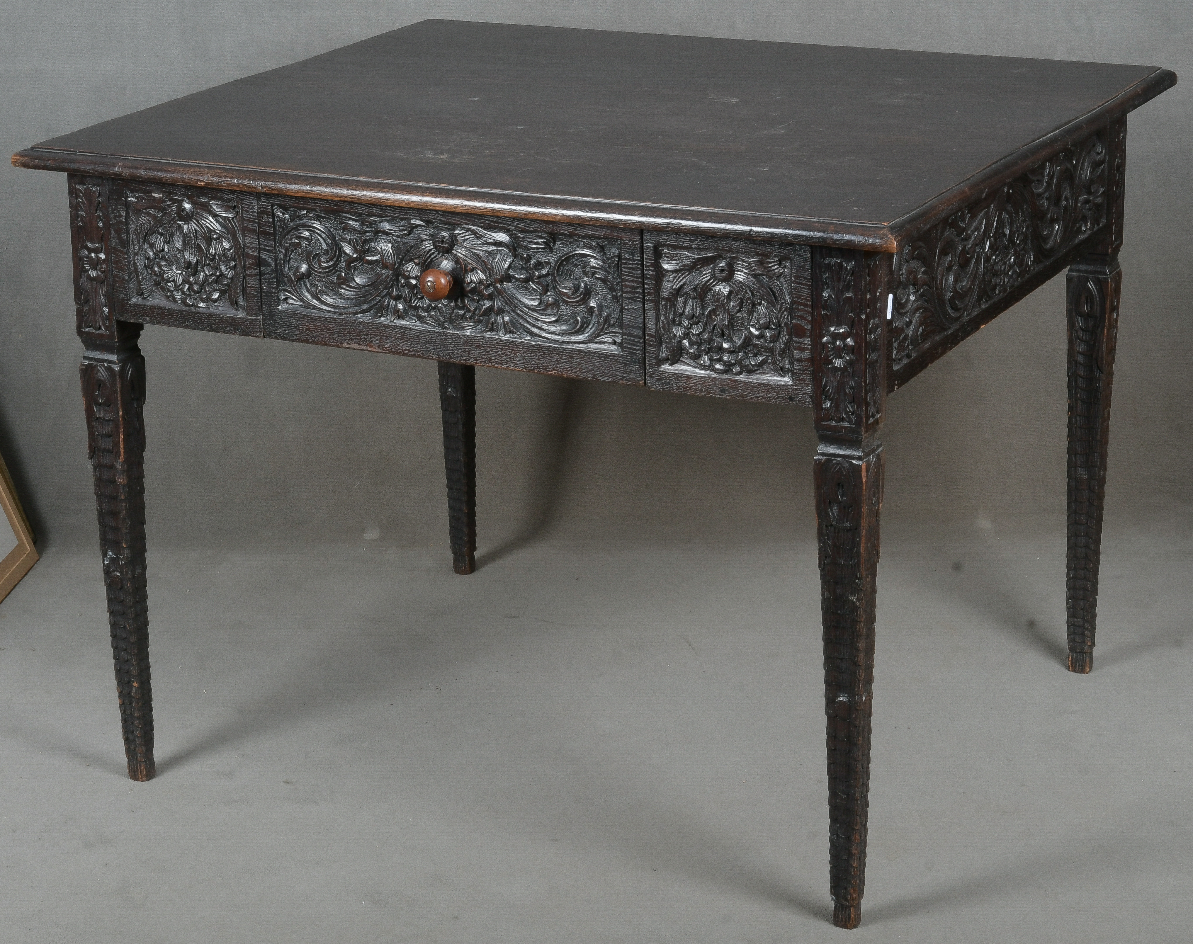 - Katalog-Nr: 934Louis XVI-Tisch. Deutsch 18./19. Jh. Massiv Eiche, geschnitzt mit Blüten, Knospen, Kerben und Trauben; sich nach unten verjüngende Beine, einschübiger Tischkasten, überstehende, profilierte Platte, H=82 cm, B=110 cm, T=96 cm. (Platte ergänzt)o.L.