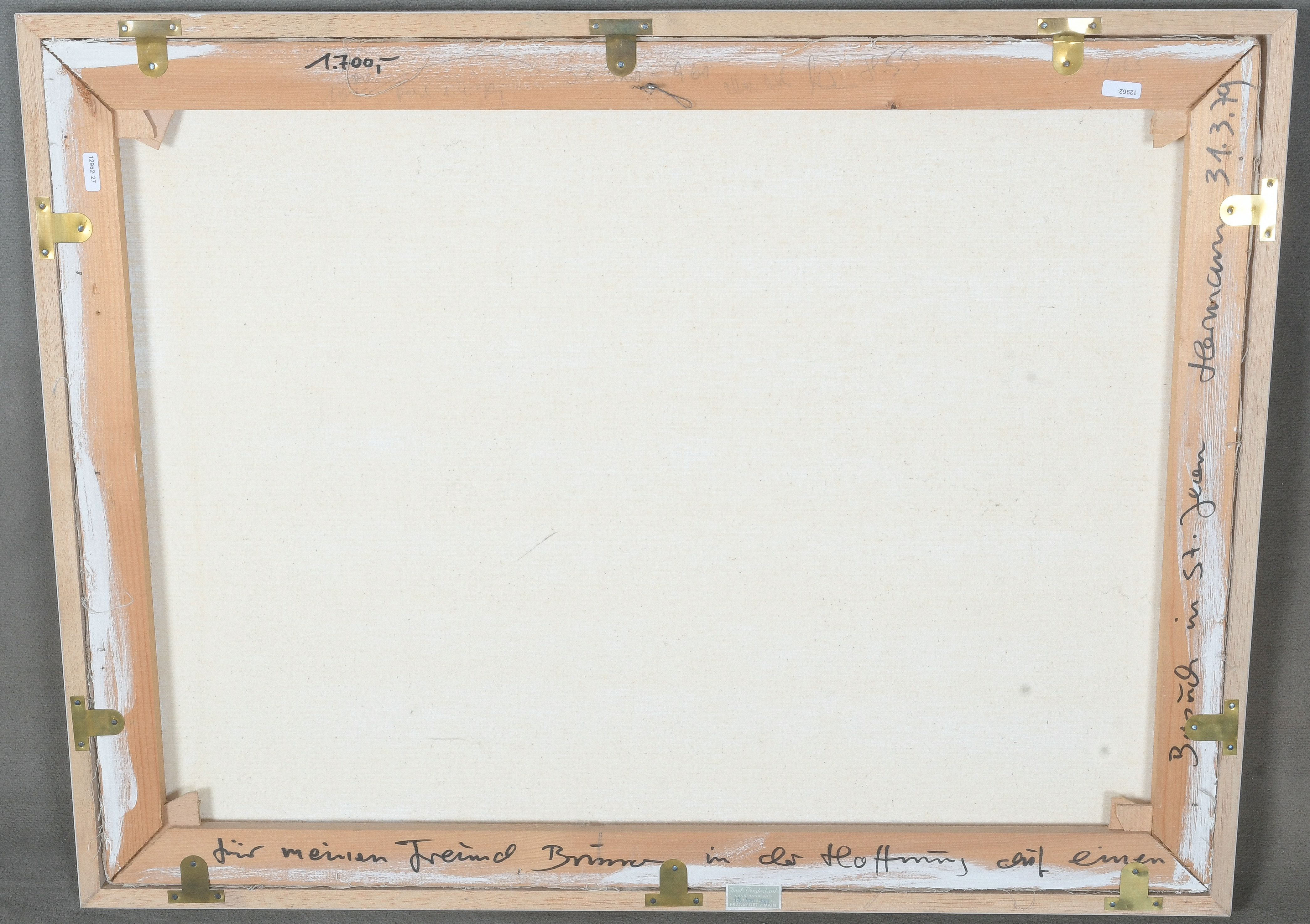 - Katalog-Nr: 935Hermann Schmidt-Schmied (1924-2010). „Friedliche Geister“. Öl/Lw., verso sign./dat. (19)64, gerahmt, 76 x 105 cm.o.L.