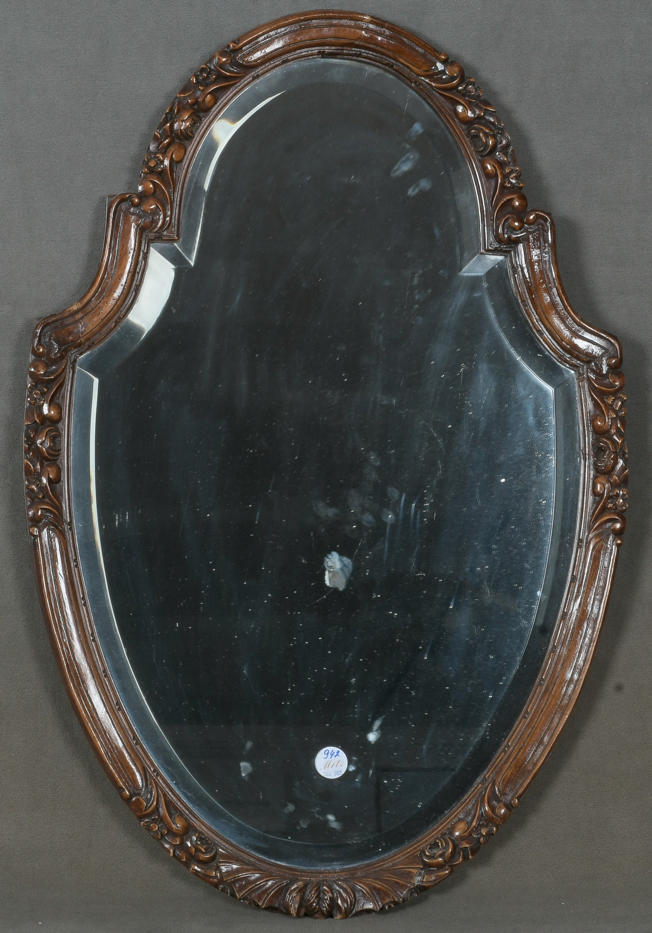 - Katalog-Nr: 942Ovaler Spiegel. Deutsch 20. Jh. Massivholz, geschnitzt, mit facettiert geschliffenem Spiegelglas, 105 x 57 cm.o.L.