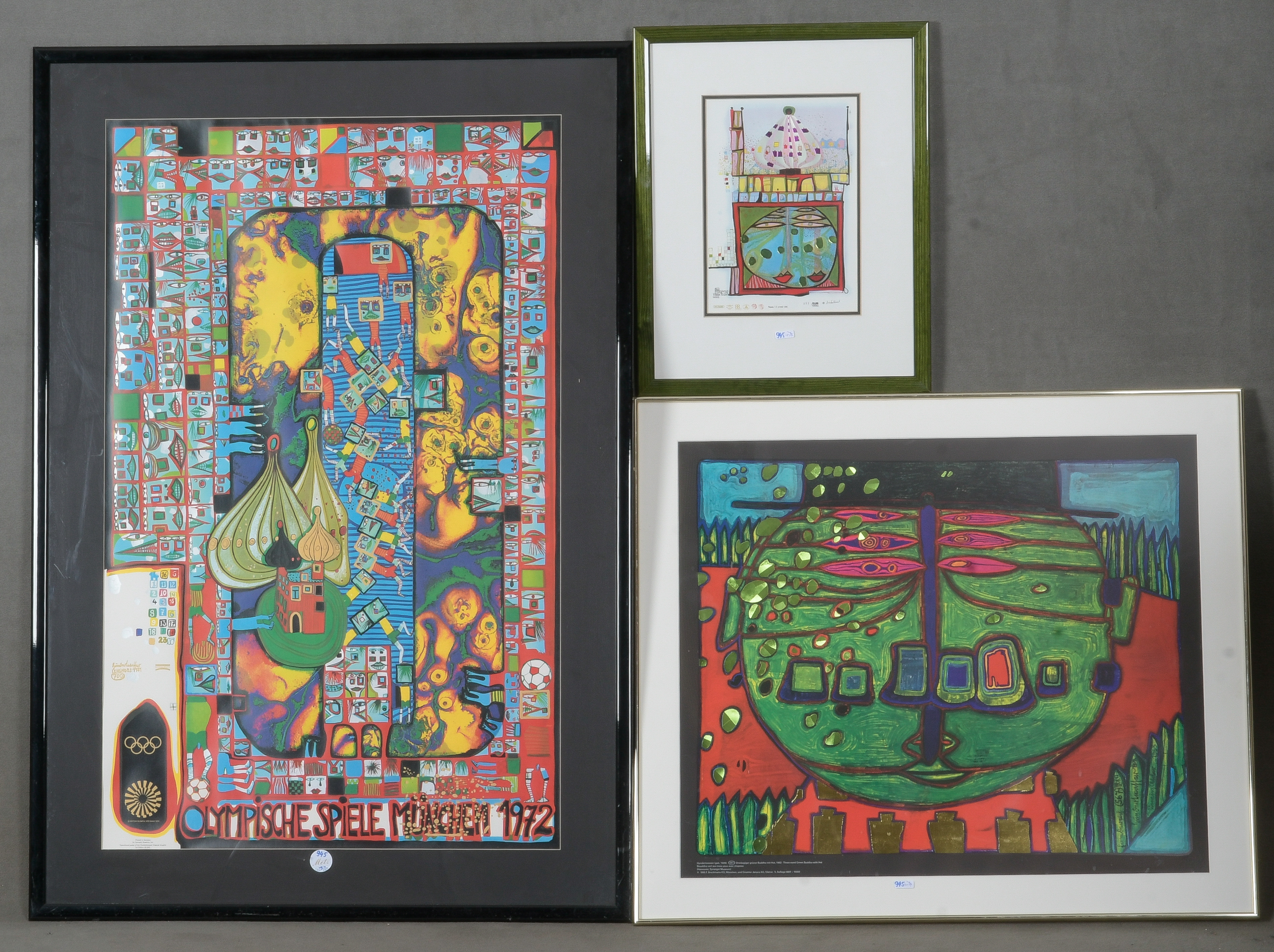 - Katalog-Nr: 945Friedensreich Hundertwasser (1928-2000). Dreiäugiger grüner Buddha mit Hut, „10002 Nights Homo Humus Come Va How DoYou Do“, „Olympia München 1972“. Drei Drucke, einer re./u./sign., mit Passepartout hi./Gl. gerahmt, 29 x 21 bis 99 x 61 cm.o.L.