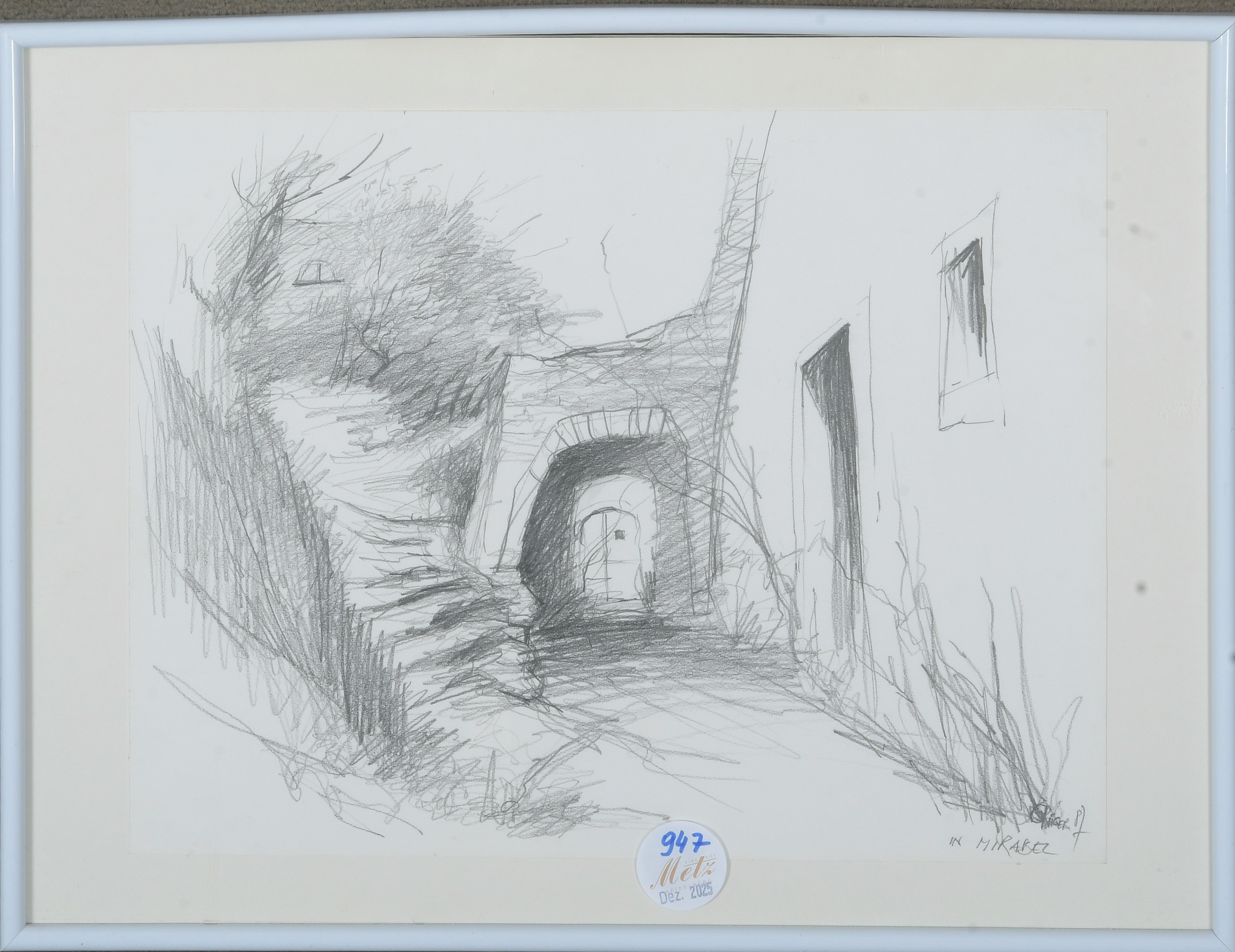 - Katalog-Nr: 947Ev Grüger (1928-2017). „In Mirabel“. Bleistiftzeichnung, re./u./sign./dat. (19)87, hi./Gl. gerahmt, 25 x 32,5 cm.o.L.