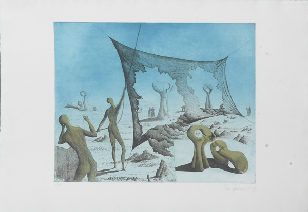 - Katalog-Nr: 932Mac Zimmermann (1912-1995). Surrealistische Landschaft mit Figuren. Farbradierung 63/75, re./u./sign./dat. 1973, 40 x 49,5 cm.o.L.