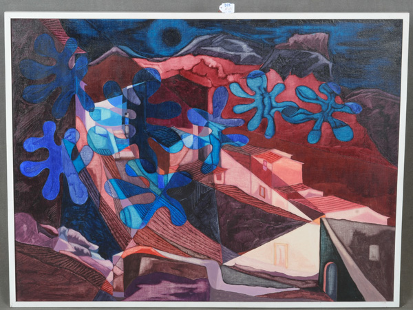 - Katalog-Nr: 937Hermann Schmidt-Schmied (1924-2010). Stadtansicht im Gebirge bei bewölktem Himmel. Öl/Lw., li./u./sign./dat. (19)65, gerahmt, 75 x 97 cm.o.L.