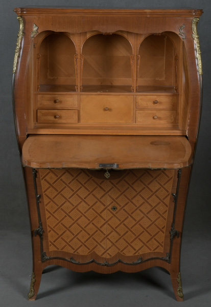 - Katalog-Nr: 949Standsekretär im Transition-Stil. Frankreich 20. Jh. Furniert mit exotischen Hölzern und marketiert mit Blumen, Blättern, Band-, Faden- und Würfelmuster, Bronzebeschläge; nach außen gestellte geschweifte Füße und Zarge, leicht gebogener Korpus, zweitürig, Schreibklappe mit Inneneinteilung, überstehende, profilierte Platte, H=134 cm, B=82 cm, T=44 cm.o.L.