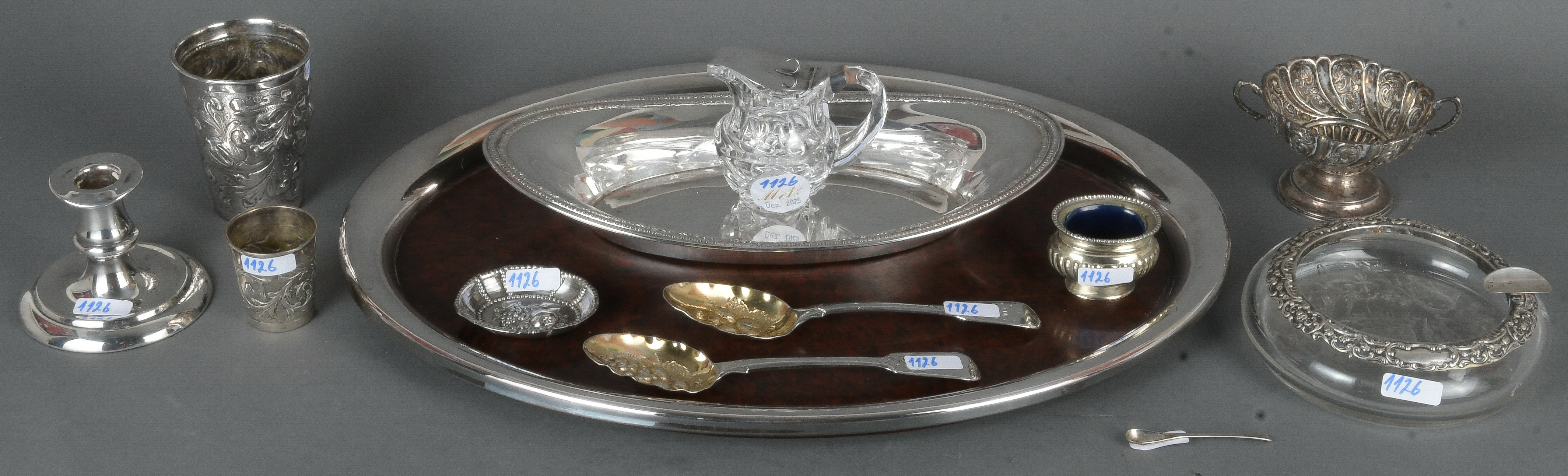 - Katalog-Nr: 1126Konvolut Silber, ca. 540 g, und Versilbertes, u.a. Aschenbecher, Becher, Löffel, Kerzenständer, ovale Schale und Tablett.o.L.