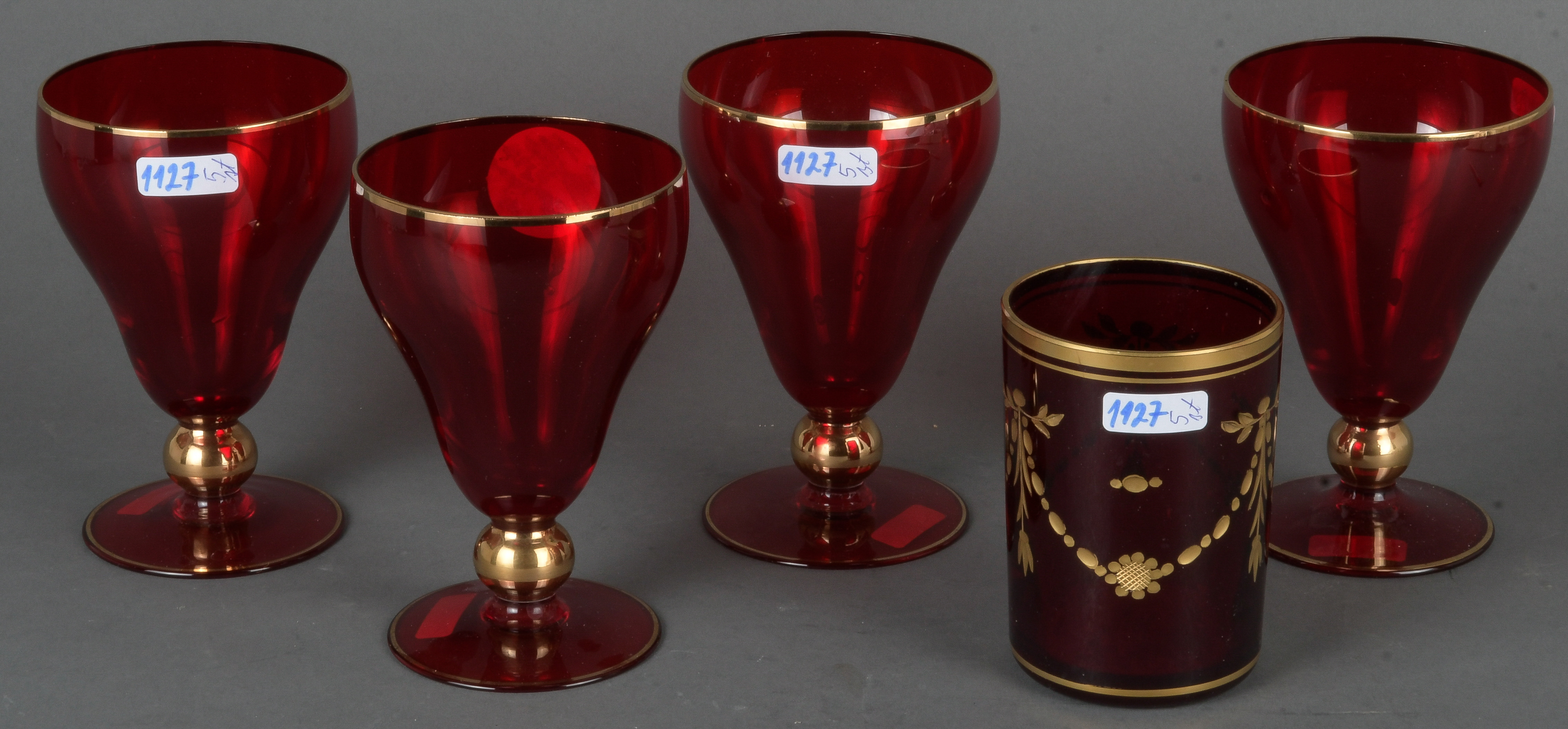 - Katalog-Nr: 1127Vier Fußbecher und ein Becher. Böhmen 19./20. Jh. Rubinrotes Glas, geschliffen, mit Kaltgolddekor, H=12,6 / 9,7 cm.o.L.