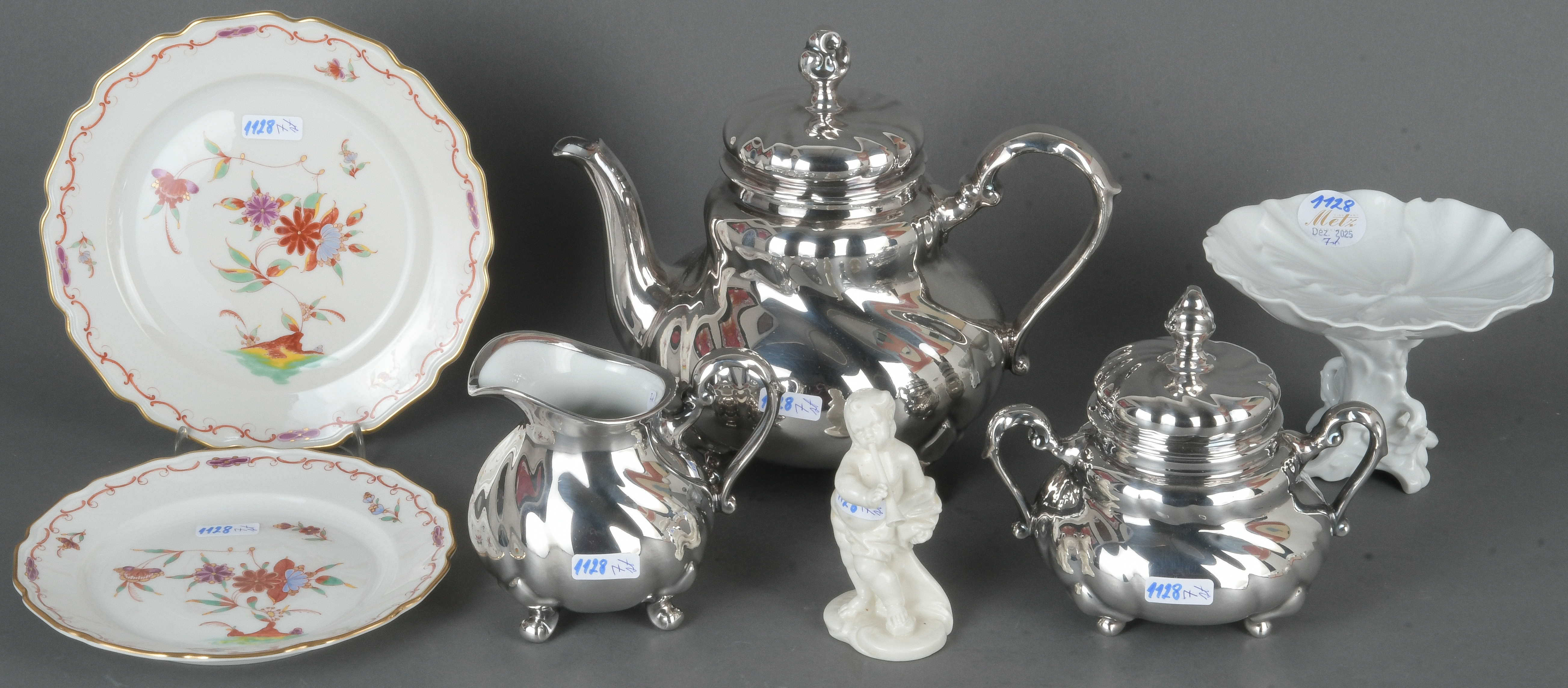 - Katalog-Nr: 1128Siebentlgs. Konvolut u.a. Nymphenburg 20. Jh. Porzellan, teilw. bunt bemalt bzw. mit Silberauflage. Bestehend aus: Ein Flötenspieler, eine Kaffeekanne mit Milchgießer und Zuckerdose, zwei Teller und ein Tafelaufsatz, H=9,5 bis 11 cm. (min. best.)o.L.