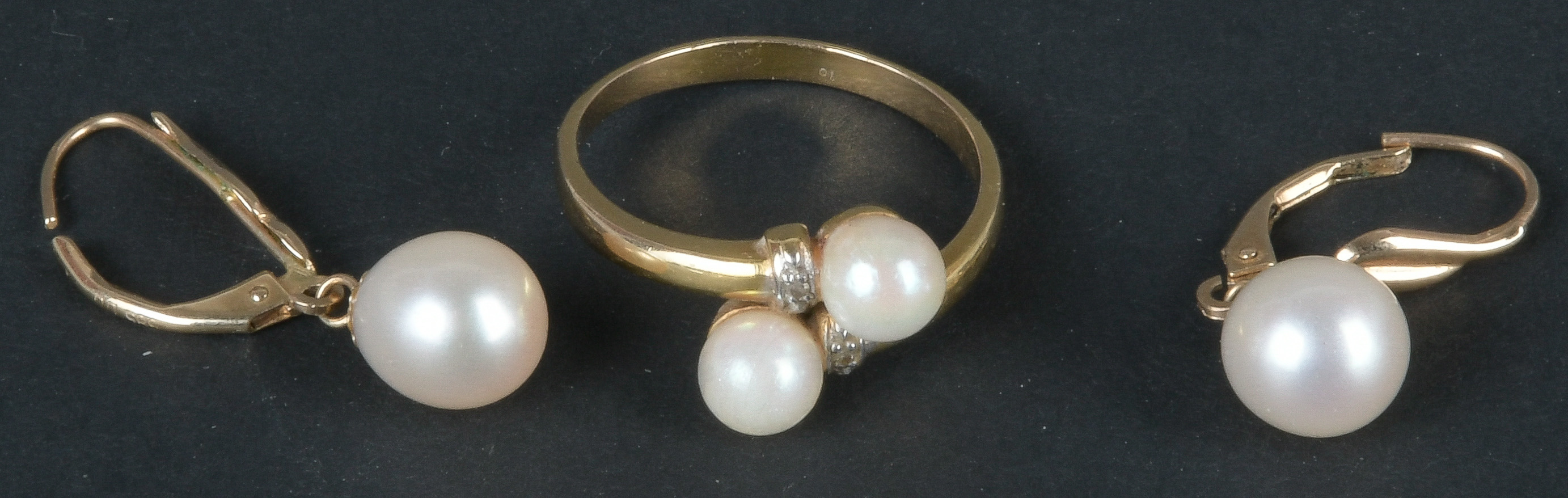 - Katalog-Nr: 1130Paar Ohrstecker und Damenring. 14 kt Gold, besetzt mit Perlen, Gesamtgewicht ca. 6,02 g, Ringgröße 60.o.L.