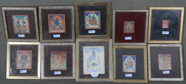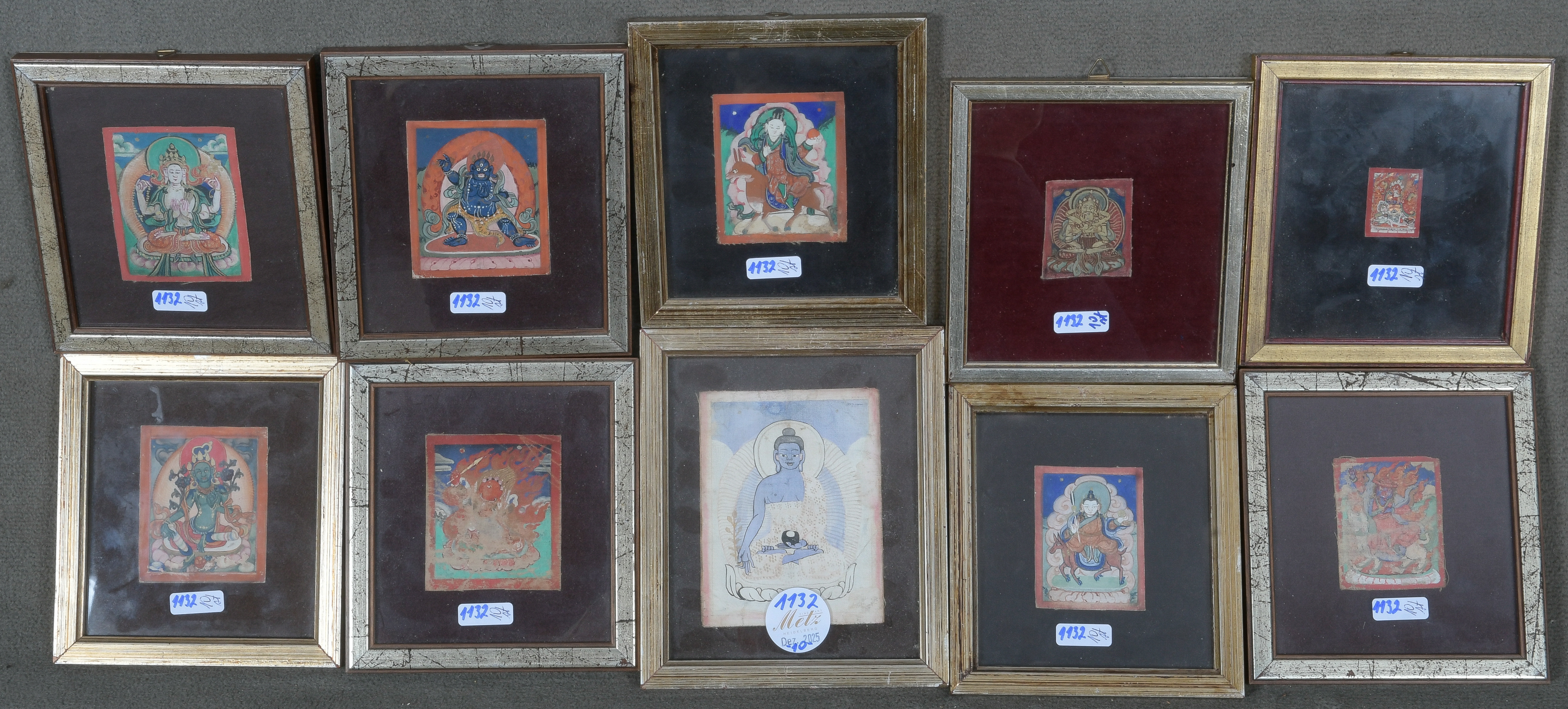 - Katalog-Nr: 1132Maler des 20. Jhs. Zehn unterschiedliche Buddha- bzw. Gottheitsdarstellungen. Farbige Tuschfederzeichnungen, je hi./Gl. gerahmt, 3 x 2 bis 10 x 7,5 cm.o.L.