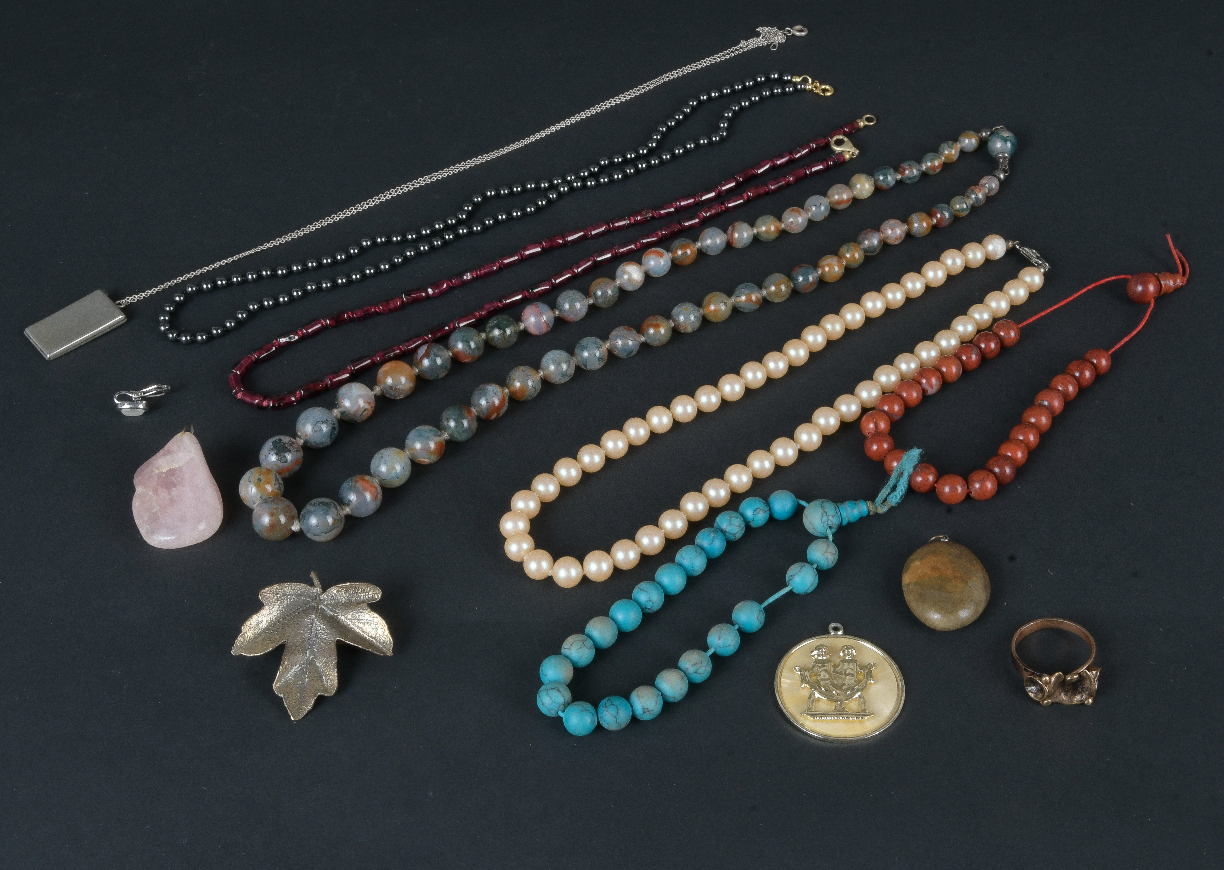 - Katalog-Nr: 1137Konvolut Schmuck: Anhänger, Armbänder, Brosche, Halsketten (L=50 bis 56 cm) und Ring (Größe 56). Versilbert, teilw. besetzt mit Jade, Granat, Rosenquarz und Türkis.o.L.