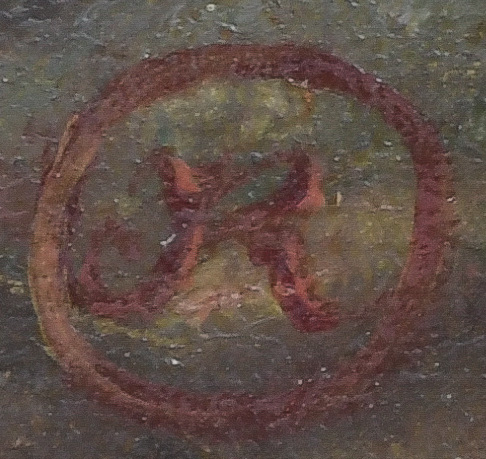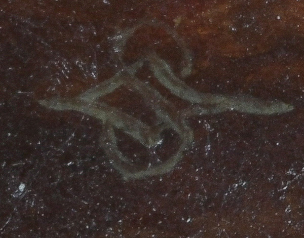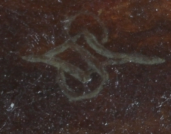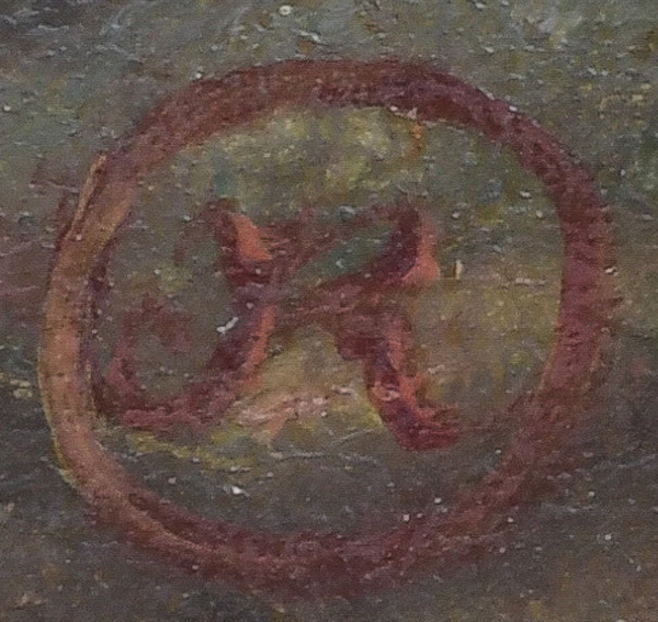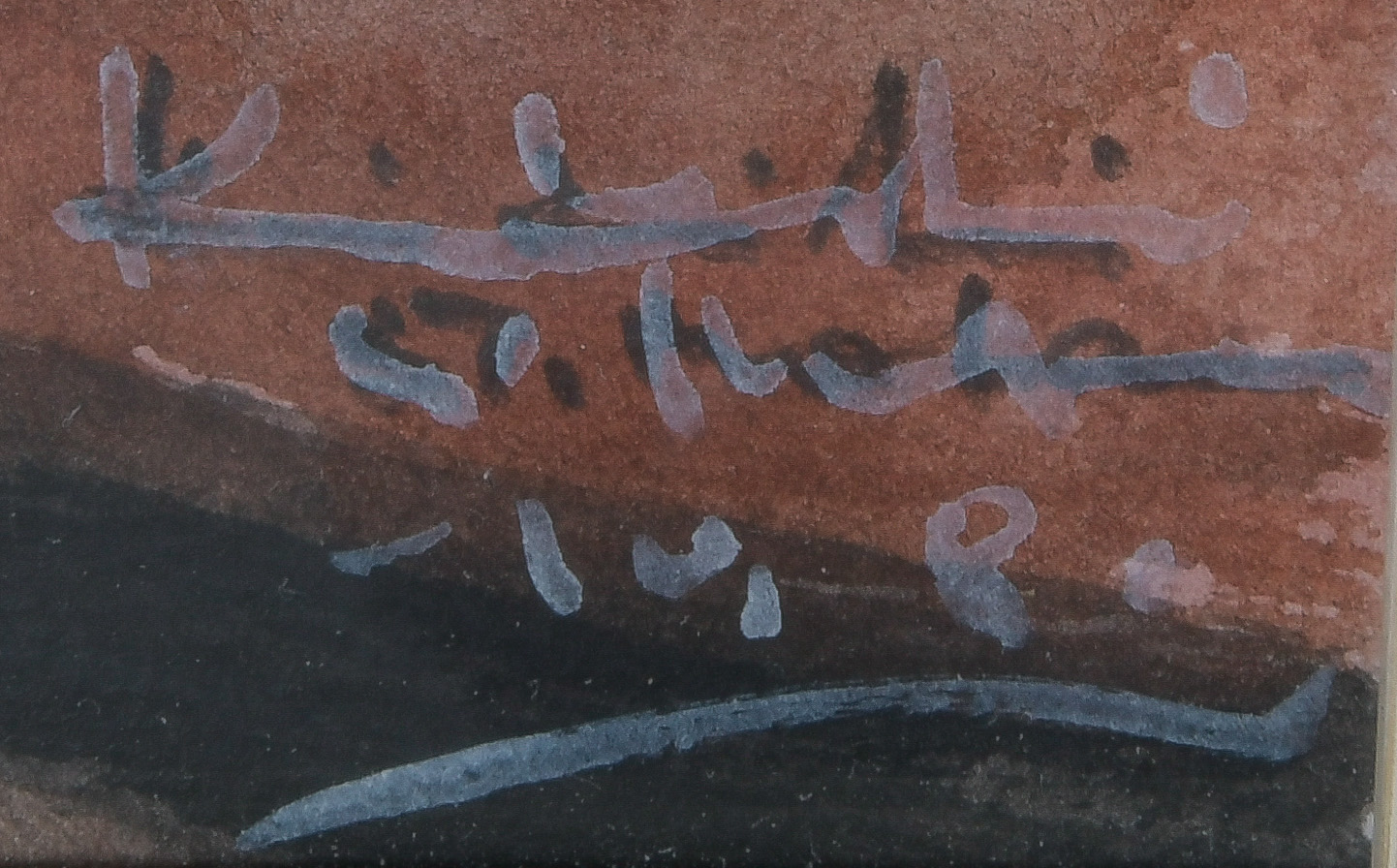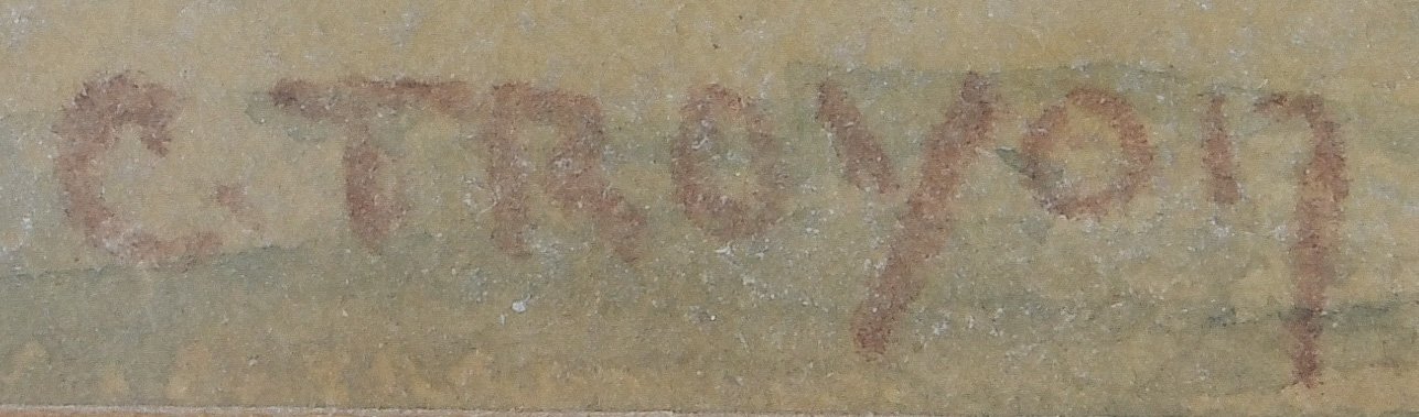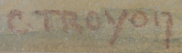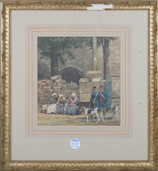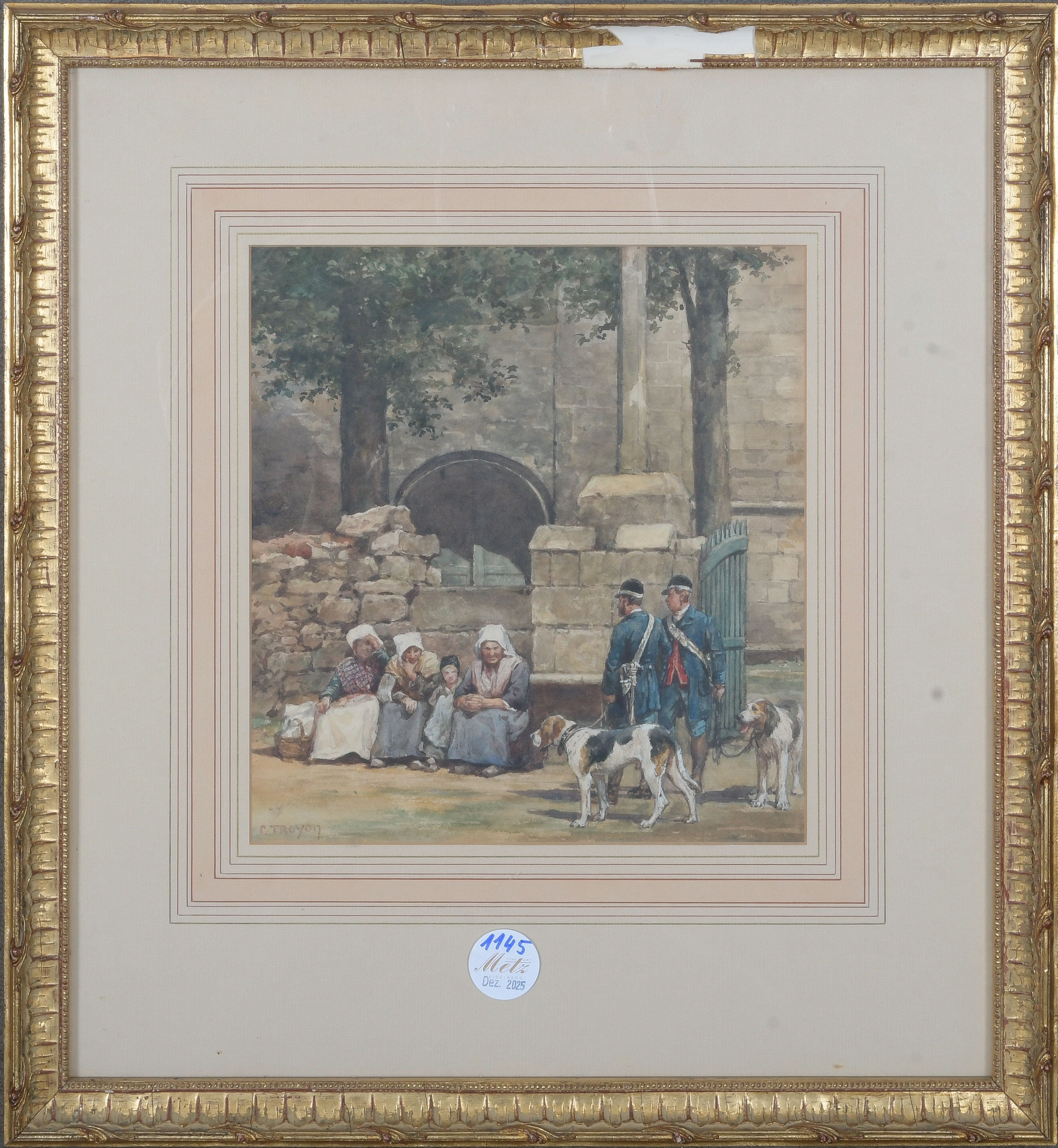 - Katalog-Nr: 1145Constant Troyon (1810-1865). Vor Mauer sitzende Frauen mit Kind, seitlich zwei Beamte mit Hunden. Aquarell/Papier, li./u./sign., mit Passepartout hi./Gl. gerahmt, 25,5 x 23,5 cm. (besch.)o.L.