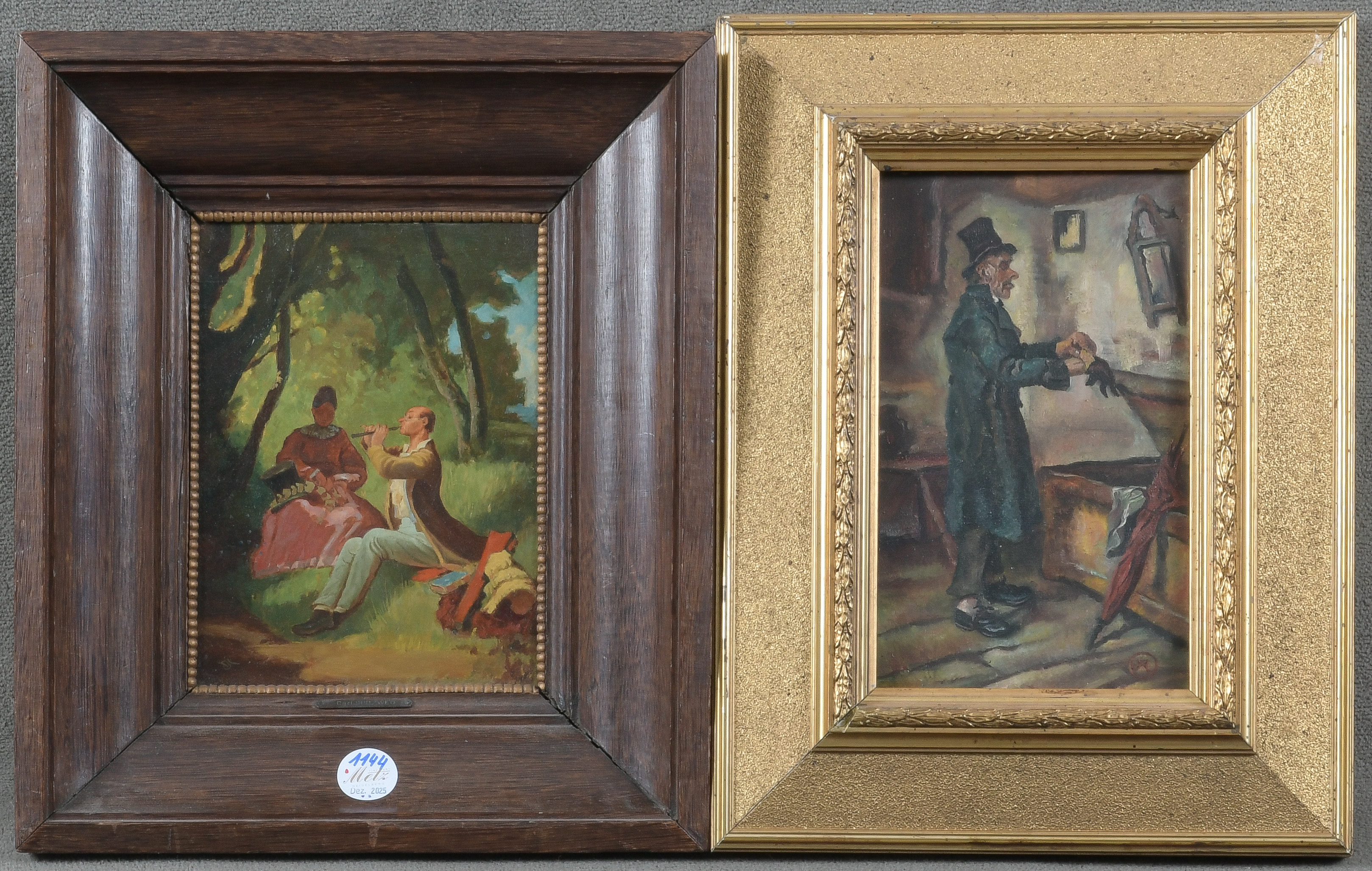 - Katalog-Nr: 1144Maler des 20. Jhs. Paar in Landschaft, der Mann auf Flöte spielend / „Alter schützt vor Torheit nicht“. Öl/Holz bzw. Malkarton, li. bzw. re./u./monogr., je gerahmt, 24,5 x 16 / 25 x 15 cm.o.L.