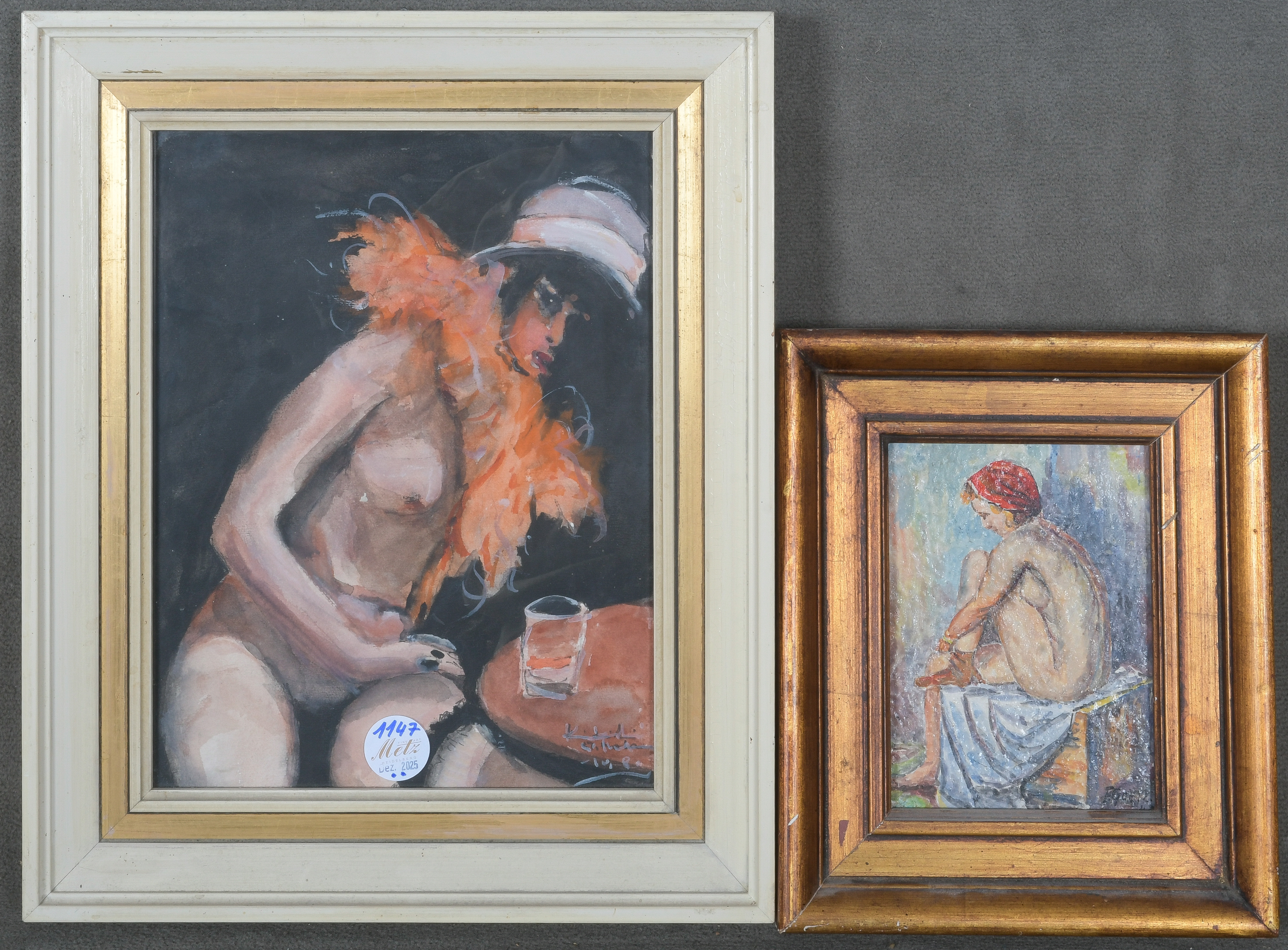- Katalog-Nr: 1147F. Goetz (Maler des 20. Jhs.) u.a. Zwei sitzende weibliche Akte. Öl/Malkarton bzw. Sperrholz, eines re./u./sign./dat. (19)47, das andere unleserlich sign./dat. 1984, eines hi./Gl., je gerahmt, 18 x 14 / 32,5 x 25 cm.o.L.