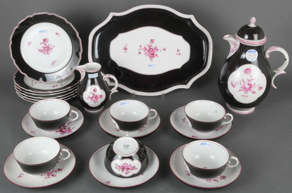 - Katalog-Nr: 112915-tlgs. Kaffeeservice. Nymphenburg 20. Jh. Porzellan, mit dunklem Fond, Reserven purpurn bemalt mit Floraldekor; am Boden gemarkt. Bestehend aus: Eine Kaffeekanne (H=26 cm), ein Milchgießer (H=13 cm), sechs Tassen mit Unterschalen, sechs Kuchenteller (D=je 19 cm) und ein ovales Tablett (H=1,5 cm, B=33,5 cm, T=25 cm).o.L.