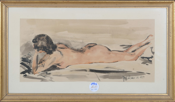 - Katalog-Nr: 1146Josef Prause (1916-2007). Liegender weiblicher Akt. Tuschfederzeichnung, re./u./sign./dat. 1952, mit Passepartout hi./Gl. gerahmt, 19,5 x 41 cm.o.L.