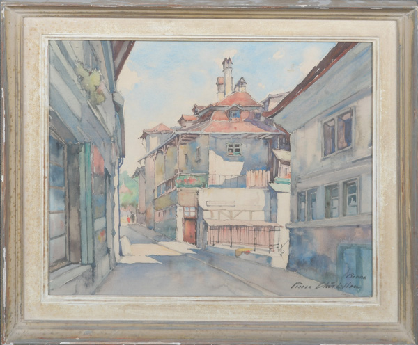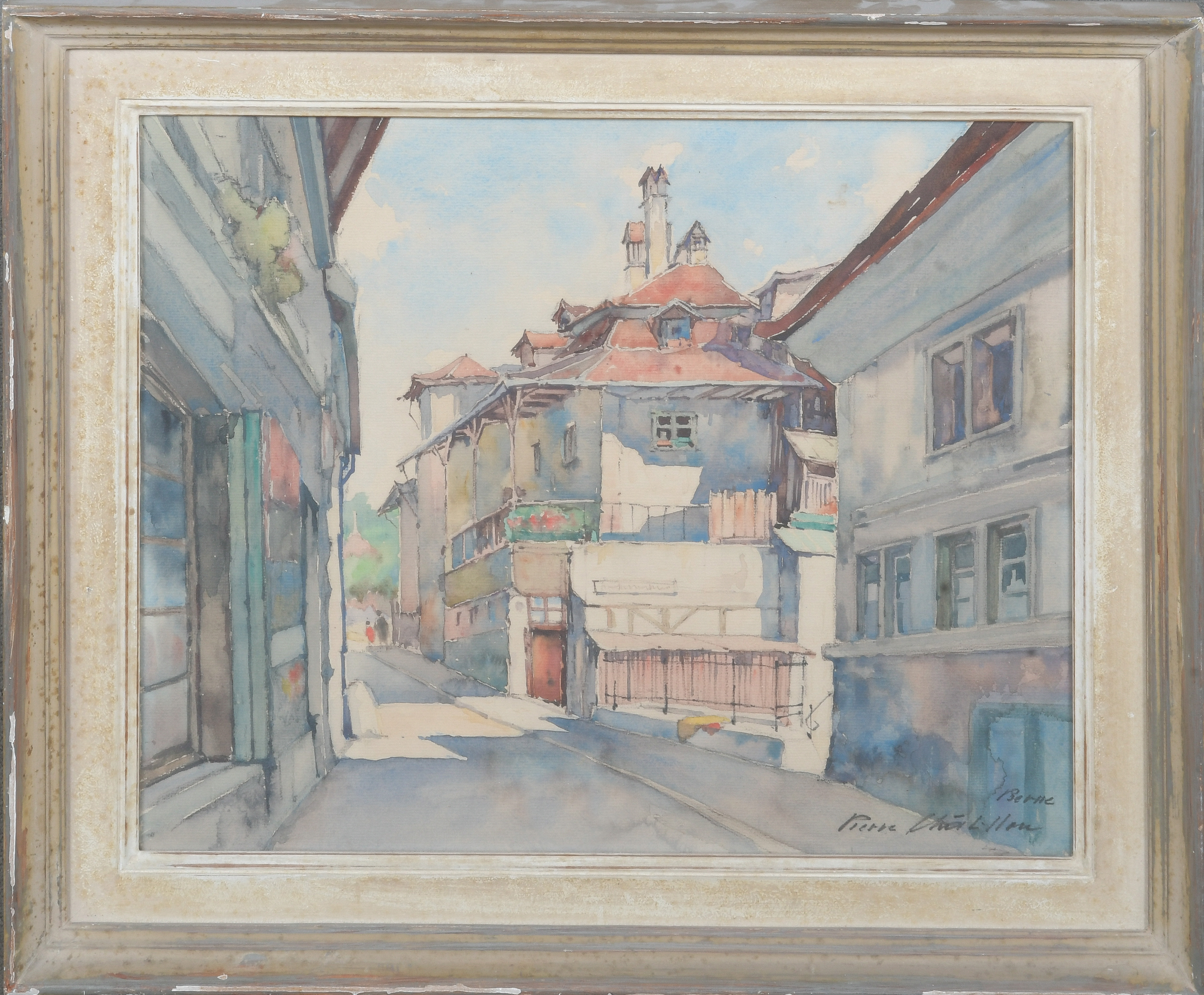 - Katalog-Nr: 1228Pierre Châtillon (1885-1974). Ansicht von „Berne“ - die Altstadt Mattenenge. Aquarell, re./u./sign./bez., hi./Gl. gerahmt (37 x 45,5 cm). Provenienz: Dobiaschofsky Auktion, Bern 1998.o.L.