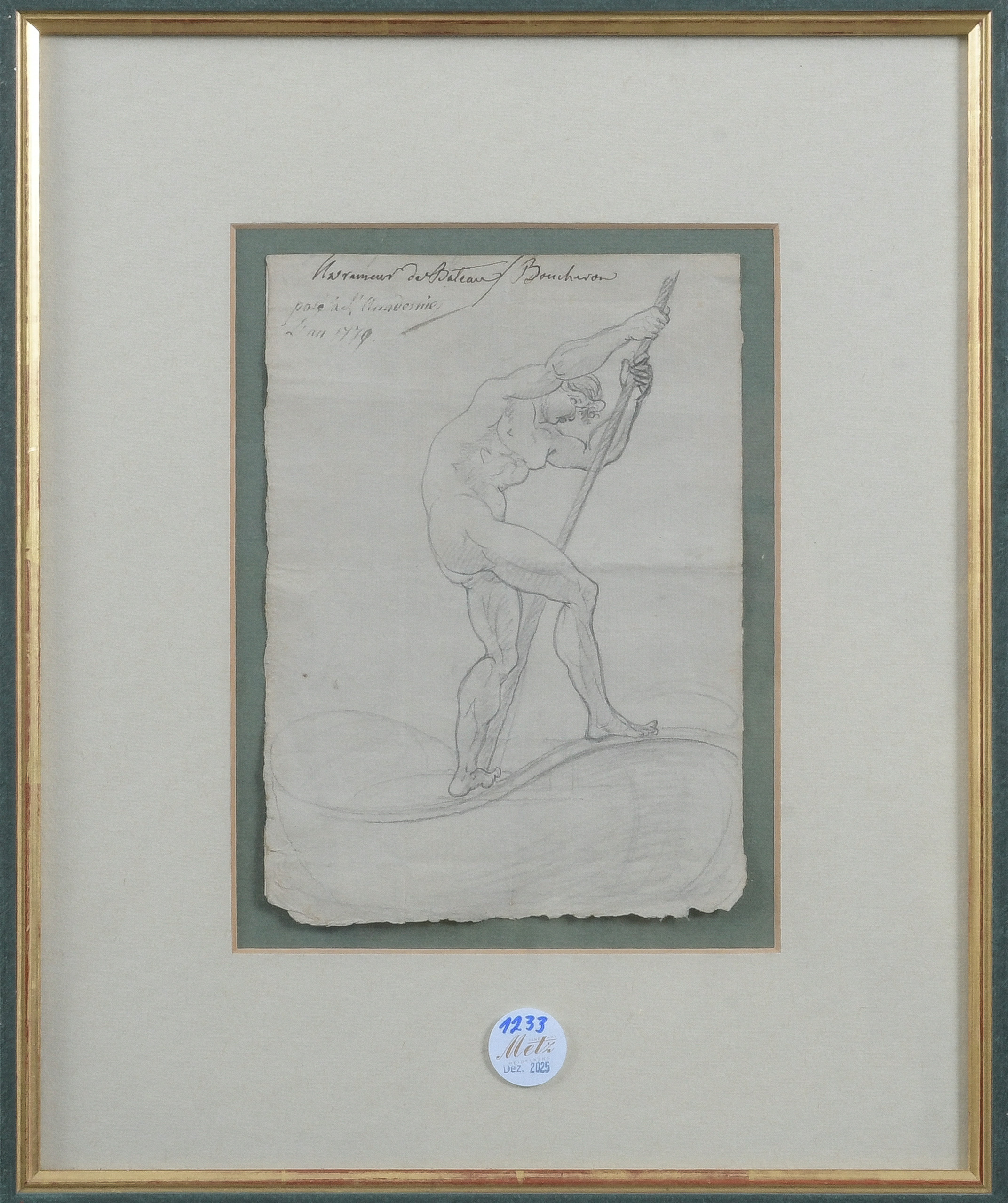 - Katalog-Nr: 1233Giovanni Battista Boucheron (1742-1815). Männlicher Akt in Boot, wohl Charon. Bleistift, li./o./sign./dat. 1779, mit Passepartout hi./Gl. gerahmt, 25,5 x 18 cm.o.L.