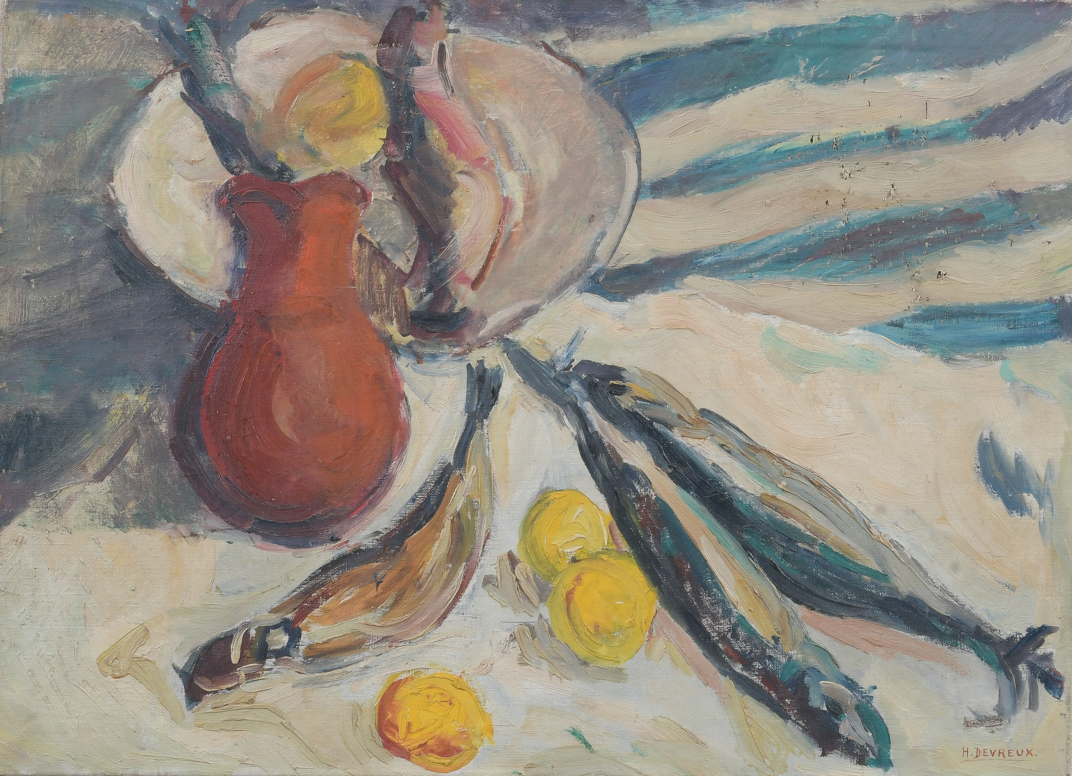 - Katalog-Nr: 1234Patrick Devreux (*1949). Stillleben mit Fischen, Zitronen und Krug. Öl/Lw., re./u./sign., 49 x 68 cm. (besch.)o.L.