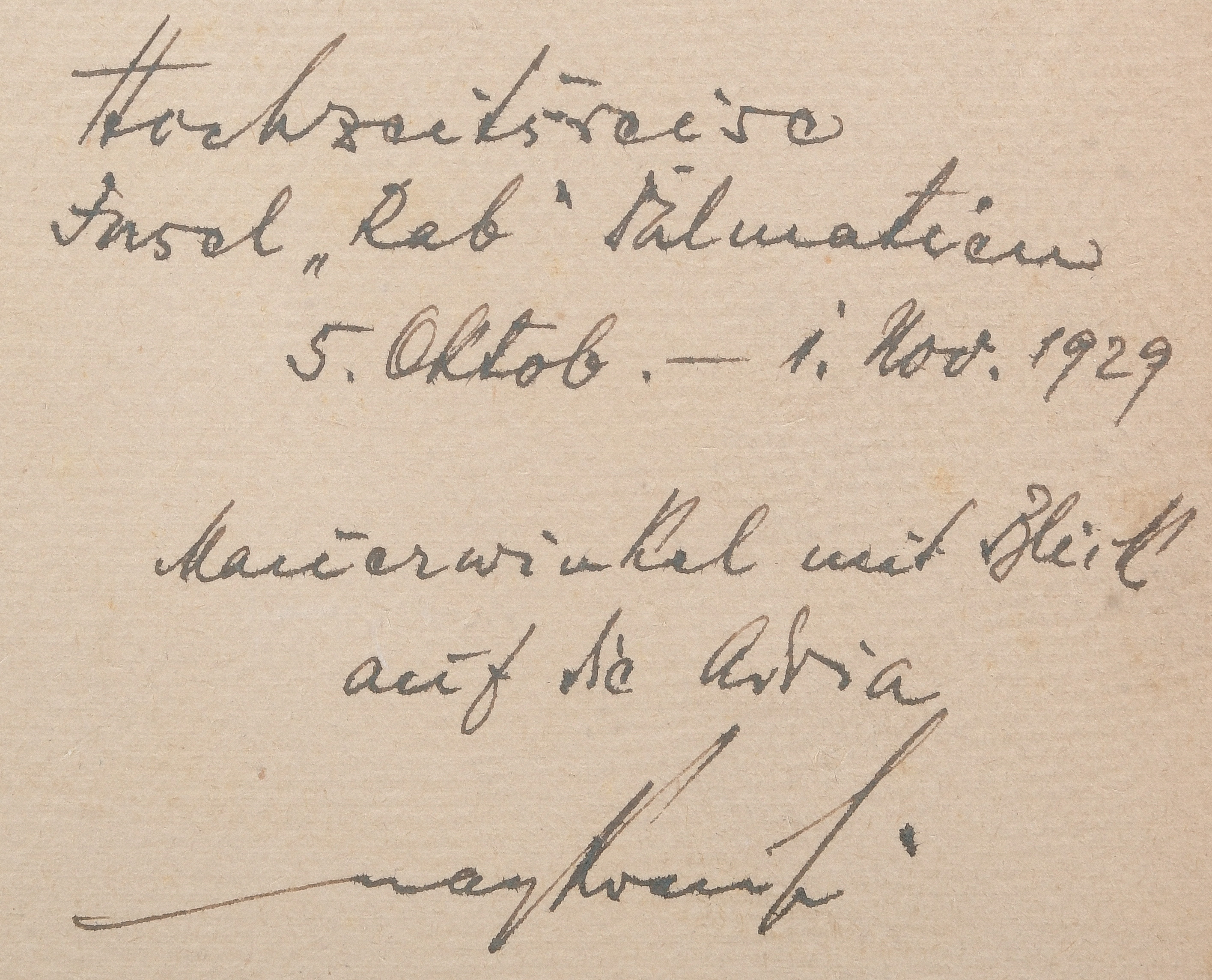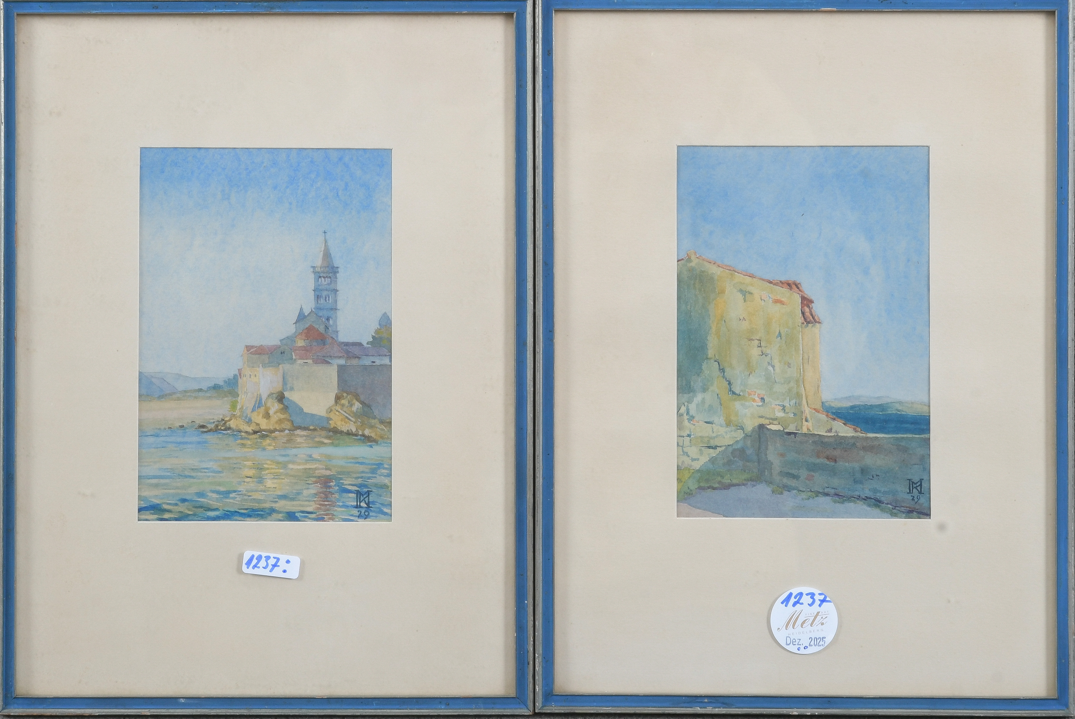 - Katalog-Nr: 1237Maler des 20. Jhs. Zwei Ansichten der Insel Rab, Kroatien. Aquarell/Papier, re./u./monogr. „MK“/dat. (19)29, mit Passepartout hi./Gl. gerahmt, je 17 x 11,5 cm.o.L.